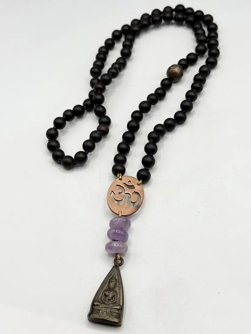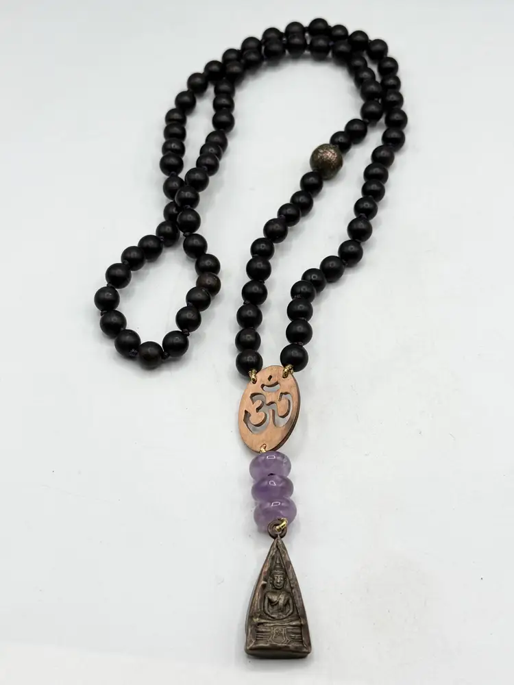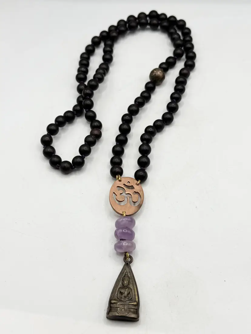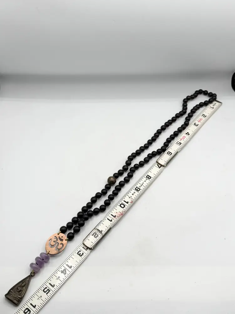 Jen Stock long beaded stone pendant Buddha necklace. Marked Jen Stock. Black beads hand knotted with purple thread. Tribal Buddha pendant and beads. Purple stone beads Vintage necklace. MN54NM.