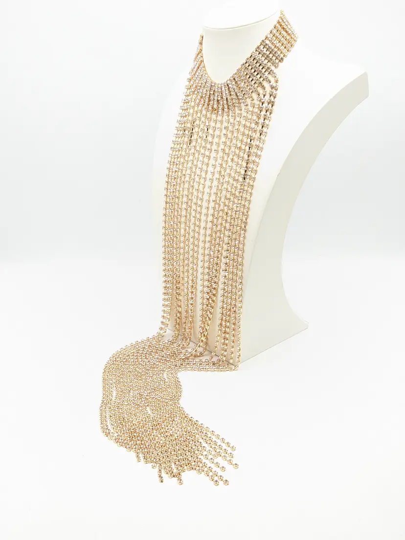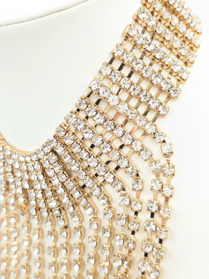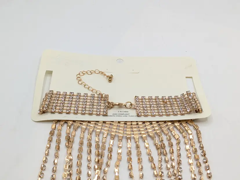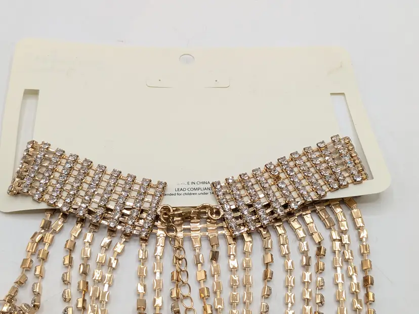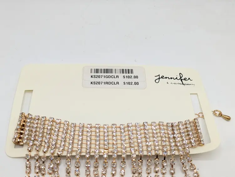 Absolutely stunning! Good condition. New with tag. This necklace features cascading gold tone rhinestone fringe. All stones are present. Choker/necklace measures 12" with a 4 1/2" extender and is 1" wide. Fringe drop is 21". Jennifer & Company. wen