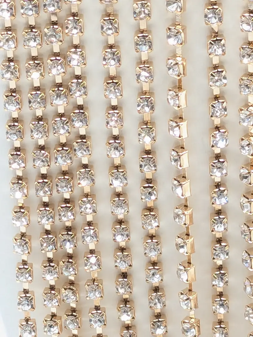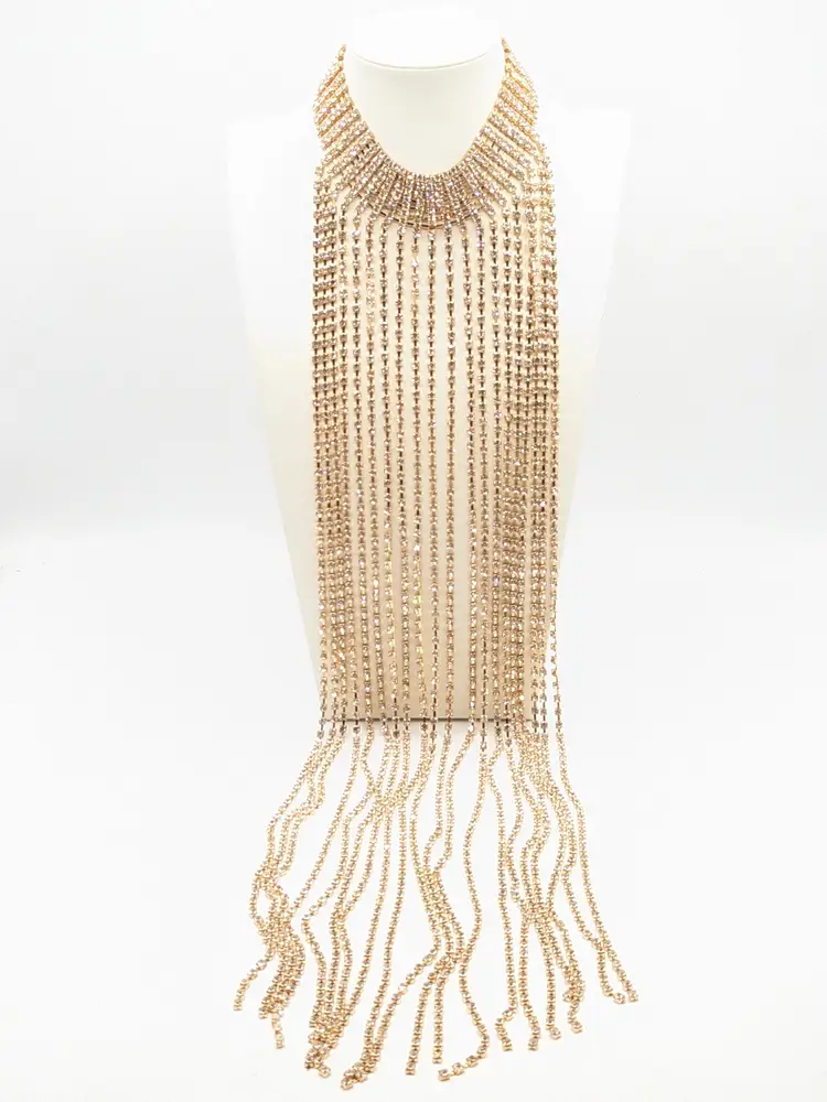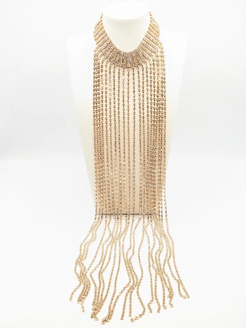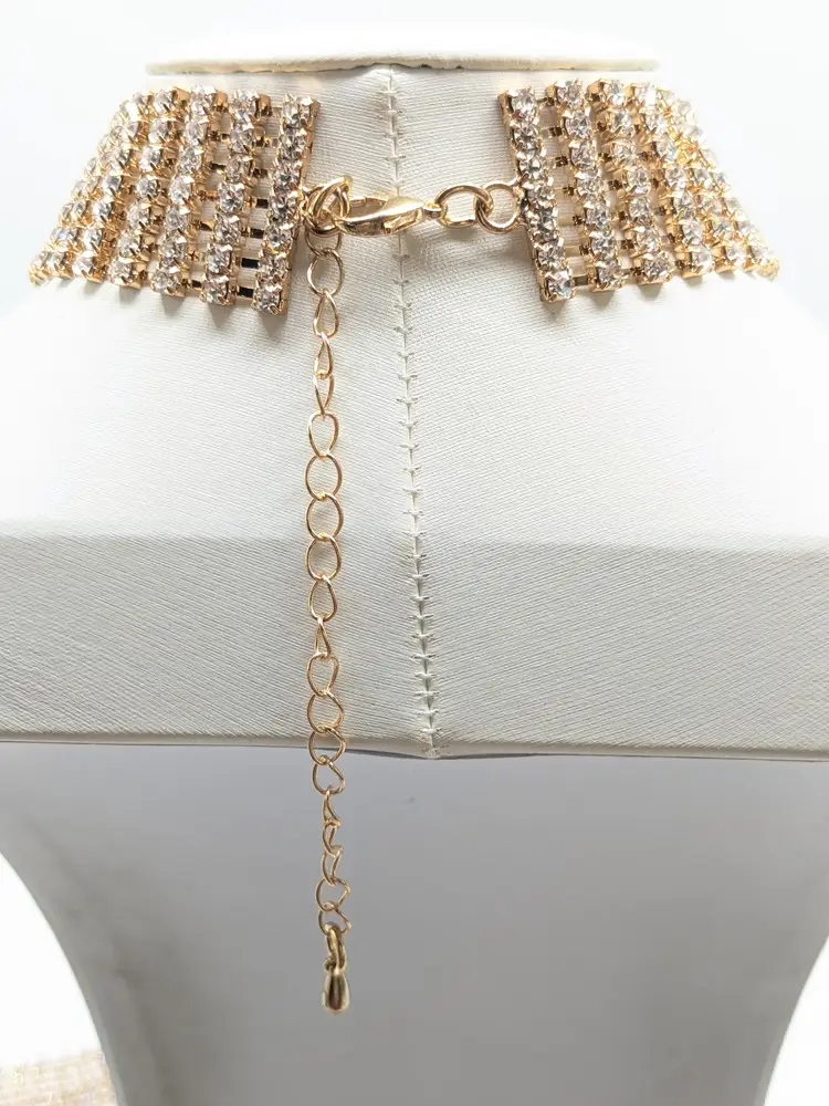 Absolutely stunning! Good condition. New with tag. This necklace features cascading gold tone rhinestone fringe. All stones are present. Choker/necklace measures 12" with a 4 1/2" extender and is 1" wide. Fringe drop is 21". Jennifer & Company. wen