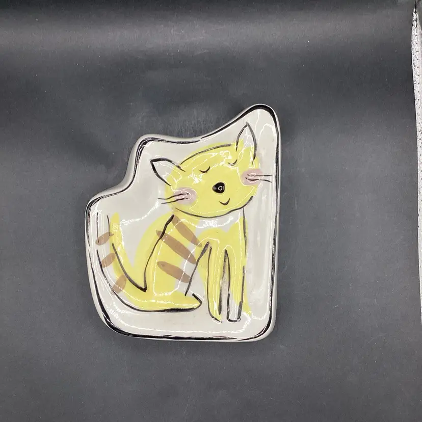 The Jenny Faw Ceramic Kitty Trinket/Soap Dish in Striped Yellow is a stylish and contemporary addition to any bathroom. This free-standing soap dish is made of ceramic and features a smooth yellow color that complements various decor styles. Measuring 4.5 x 5 inches, it is perfect for sitting on a counter and can easily hold soap or other trinkets. The sleek design and animal-themed details make it a charming choice for adults looking to enhance their bathroom with a touch of whimsy.
