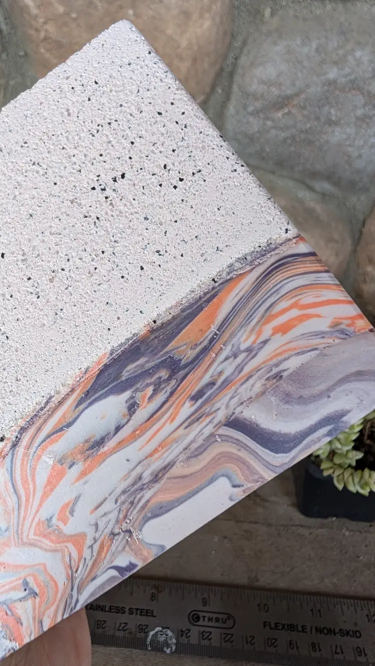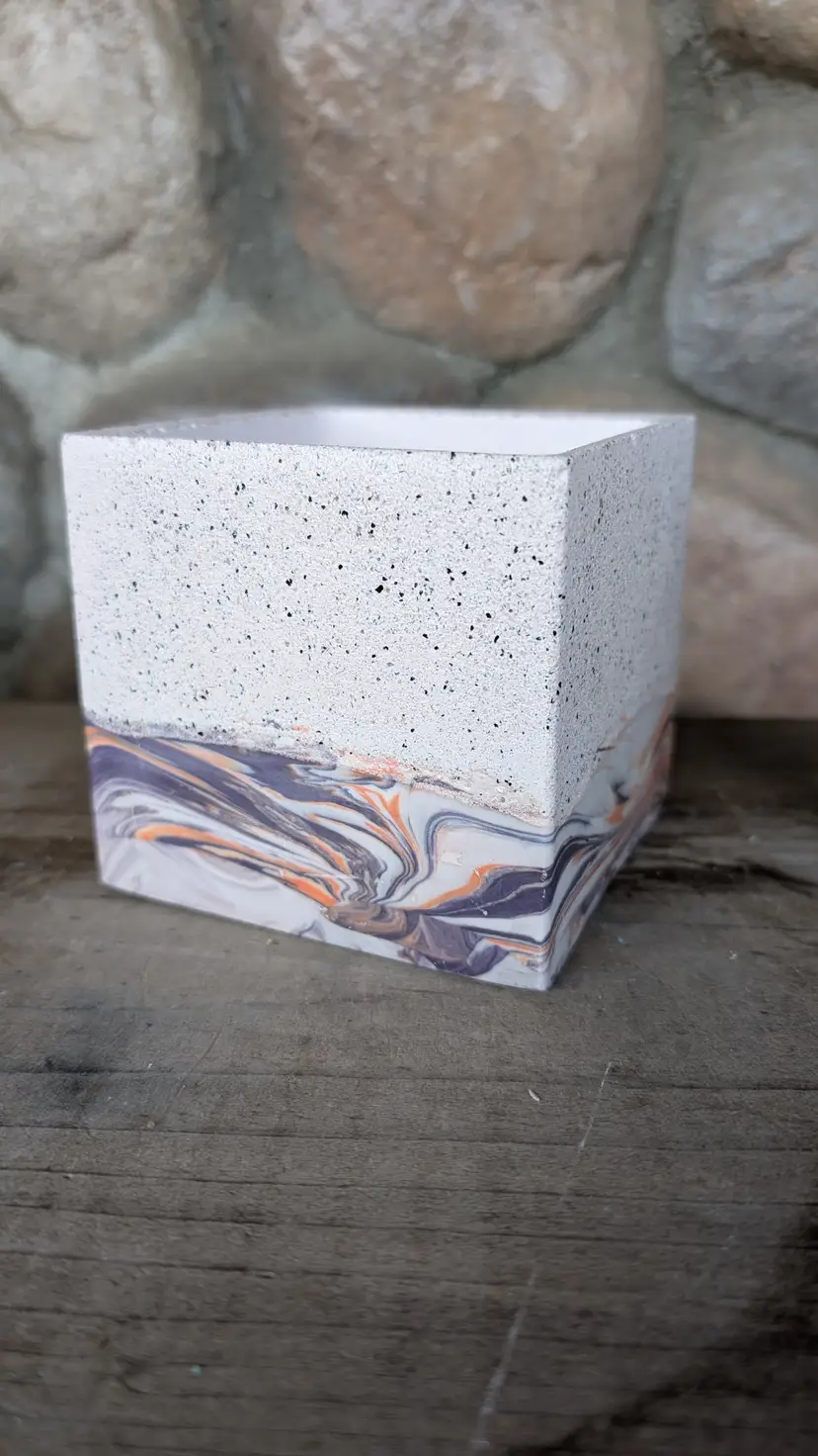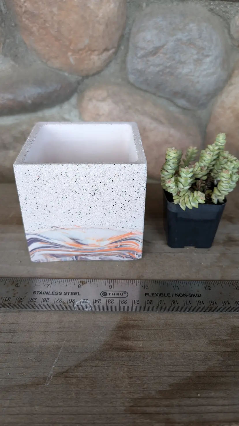 Dimensions: 4"w, 4"t This pot has two different types of jesmonite - top is textured similar to granite and the other is silky smooth and marbled on the bottom, creating a fun contrast.