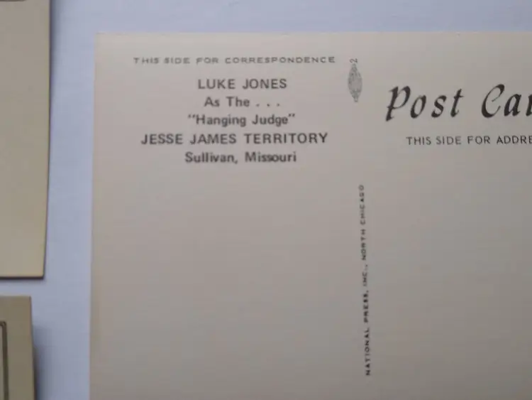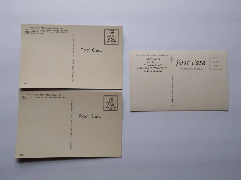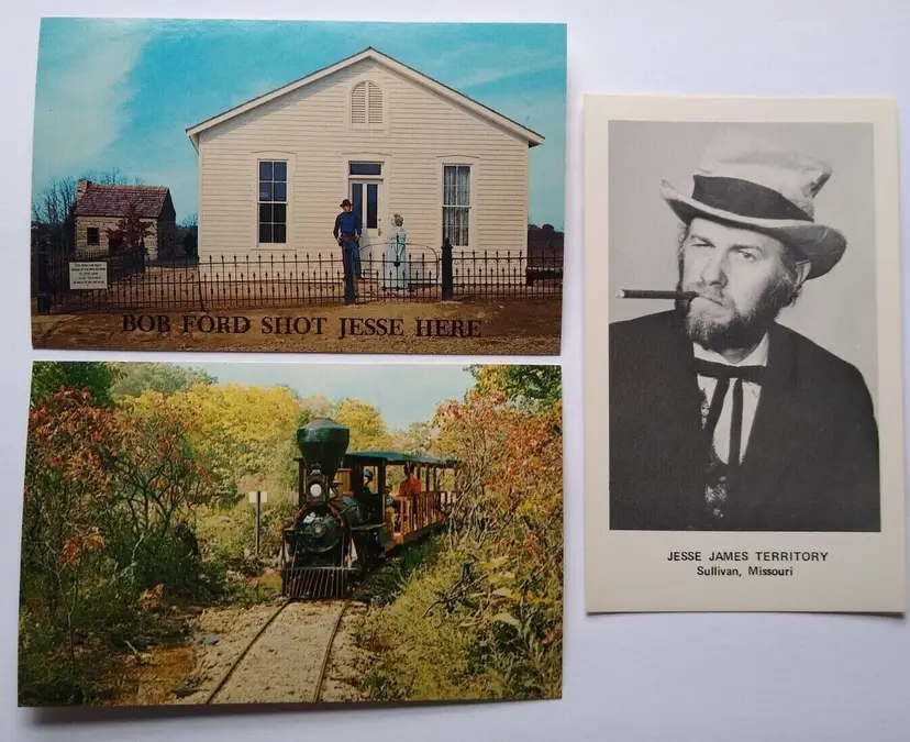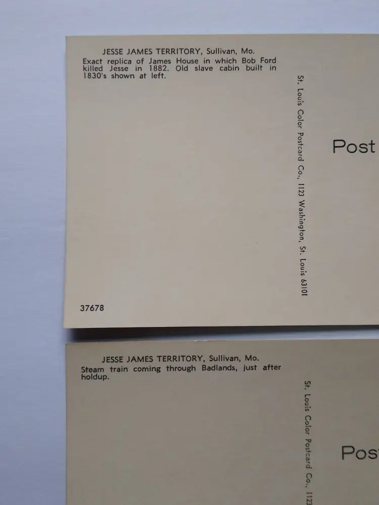 Circa 1960's-1970's. Lot of (3) different postcards from the old Jesse James Territory attraction in Sullivan, Missouri. This was a wild western city attraction with reenactments of Jesse James railroad train robbery, stage coach rides, gunslinger bandits, and more. It opened in 1967 and closed in the mid 1970's. These postcards were once sold at the gift shops on the location. Vintage unused old stock in great condition. They have slight curl from being in storage for 50+ years. Stock# missouri1.