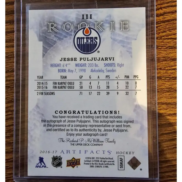 2016-17 Artifacts Jesse Puljujarvi Rookie Auto 50/135