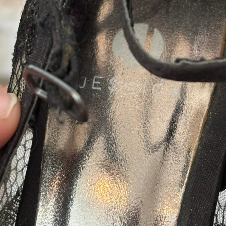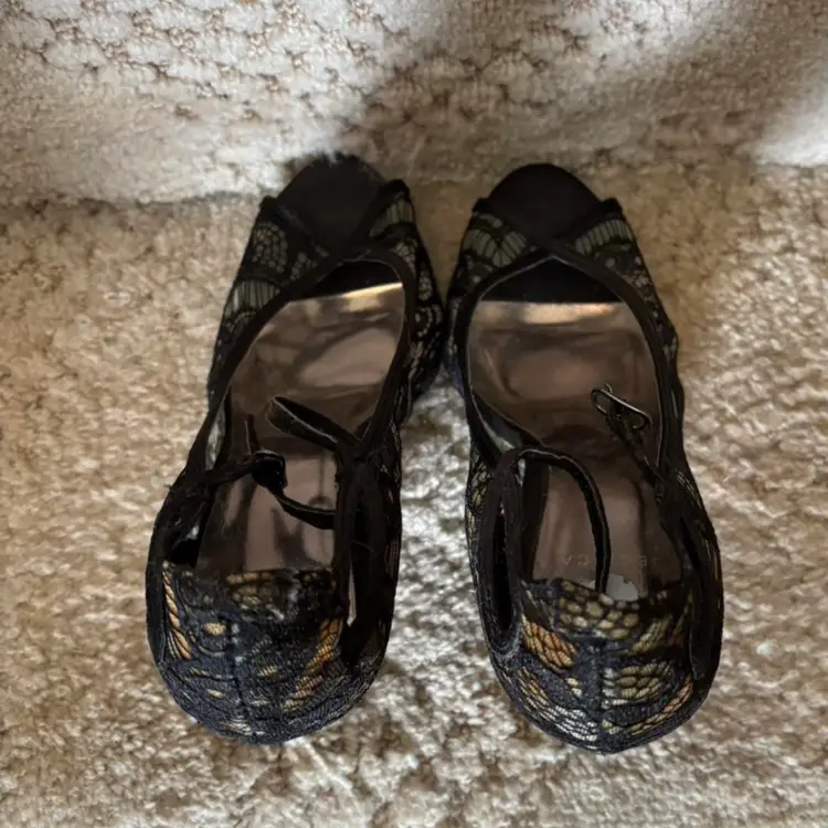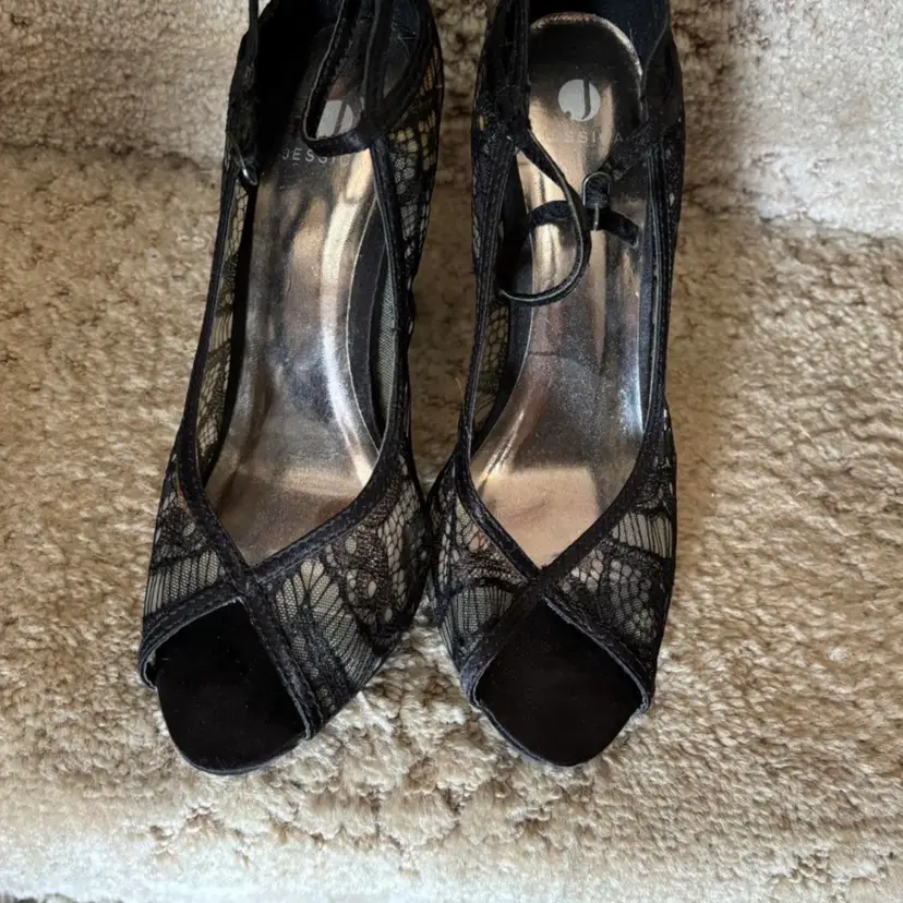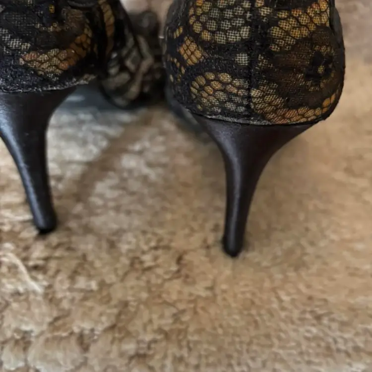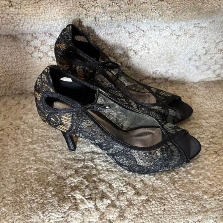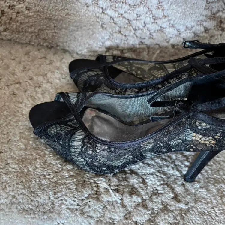 Sophisticated black lace peep-toe heels with a slim mid-height heel. Feminine lace overlay adds elegant texture and style. Cushioned insole offers comfortable wear for special occasions. Versatile black color pairs well with evening and dressy outfits.