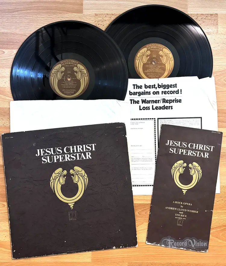 28-page lyric book included (some discoloration and wear). Vinyl plays with crackles and a few light-clicks (play-graded). Textured gate-fold cover has a few creases near edges; light-scuffing, surface abrasions (front/back). Inner-sleeves are original (generic white/WB ads) one seam partially split on one. Spine is mostly readable with heavy wear. Shelf-wear along top/bottom-edge and corners. Unipak opening is crisp with signs of light use and divots. Die-cut label. (Not a cut-out.)