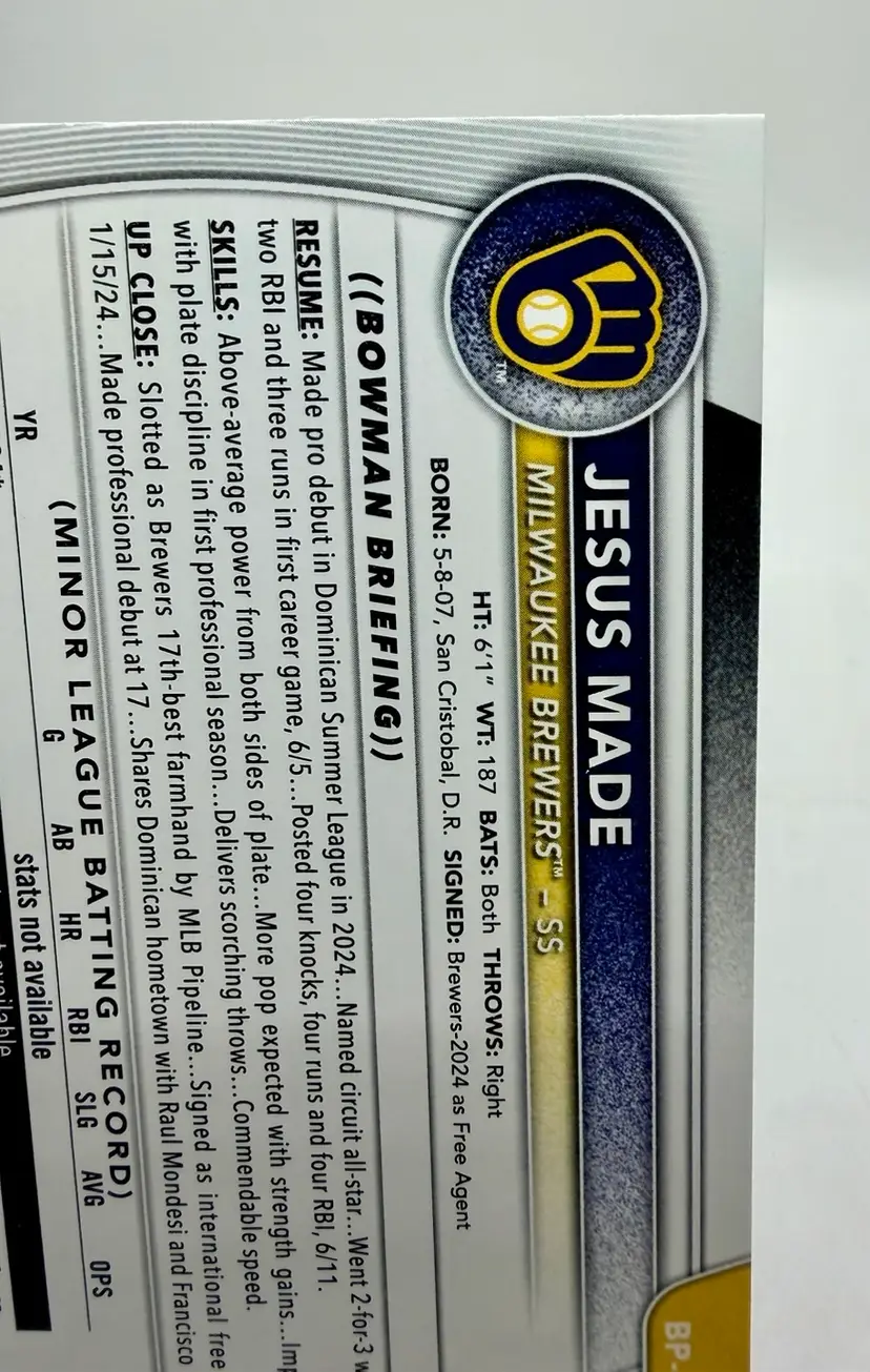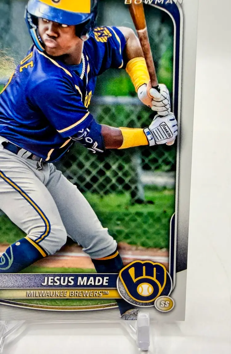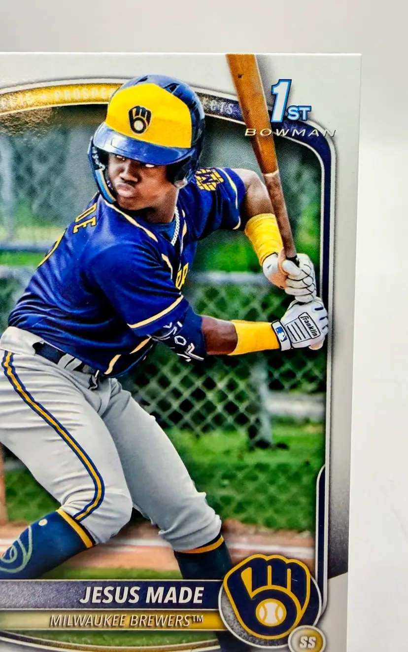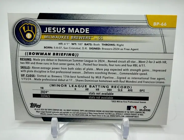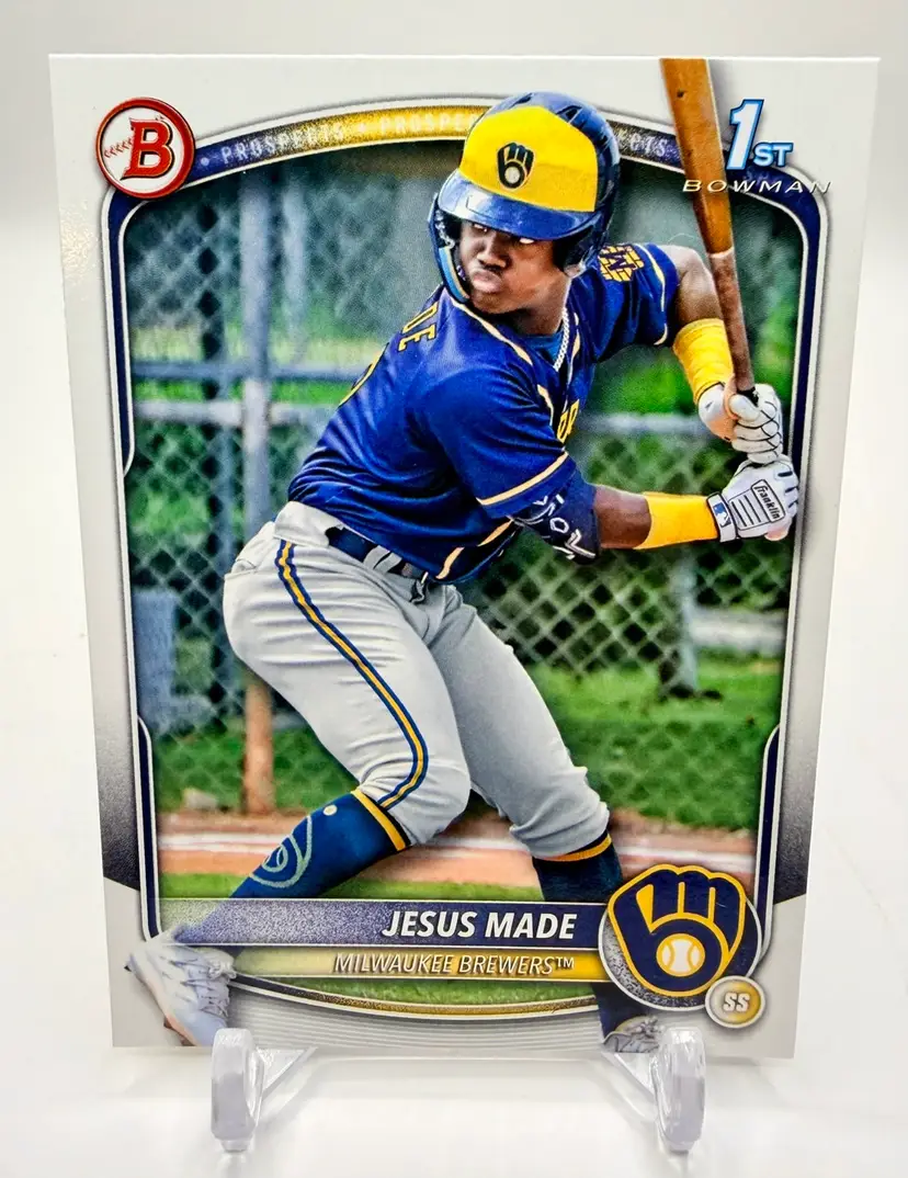 2025 Bowman Prospects RC 1st Bowman trading card featuring Jesus Made of the Milwaukee Brewers. This baseball card is part of the Prospects insert set and has a standard size with a 20 Pt. thickness.
