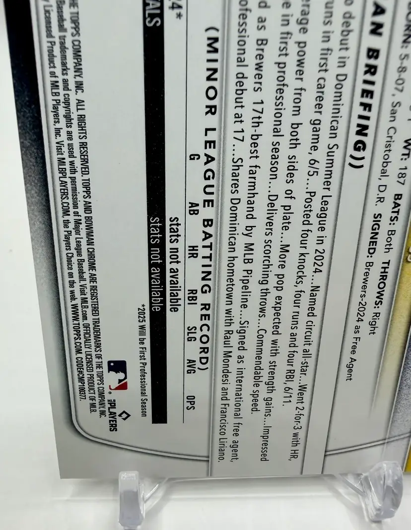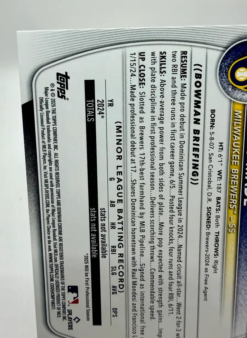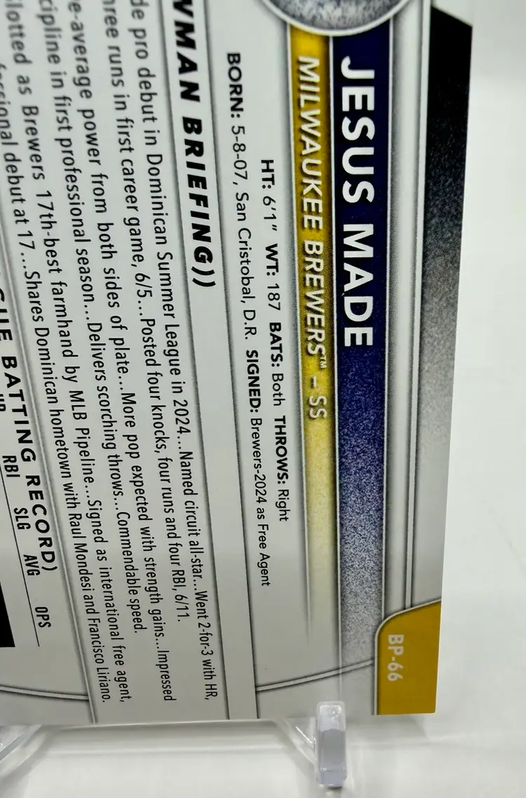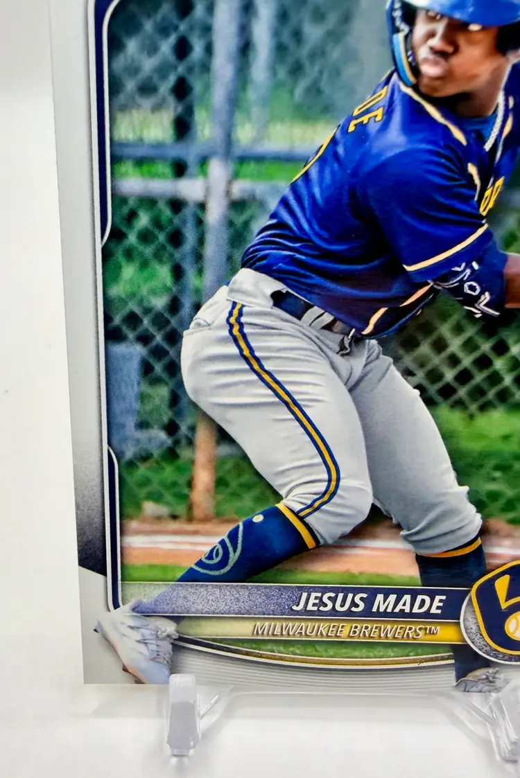 2025 Bowman Prospects RC 1st Bowman trading card featuring Jesus Made of the Milwaukee Brewers. This baseball card is part of the Prospects insert set and has a standard size with a 20 Pt. thickness.