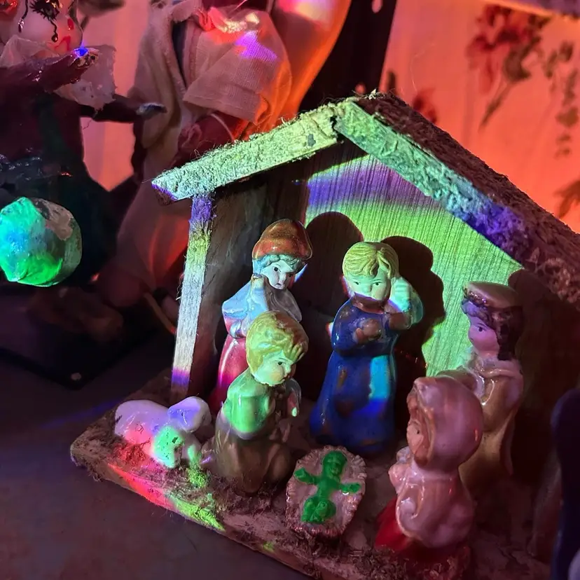 Upcycled thrift store nativity scene diorama with Jesus as a green skinned alien 👽 baby! I personally believe Jesus was an extra terrestrial and a lot do the Bible can be explained as UFO and extra terrestrial experiences.
