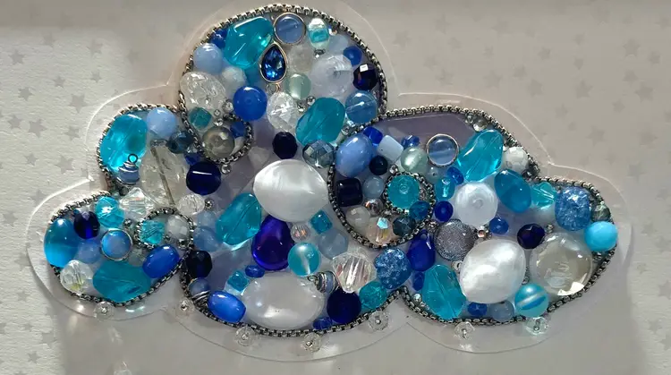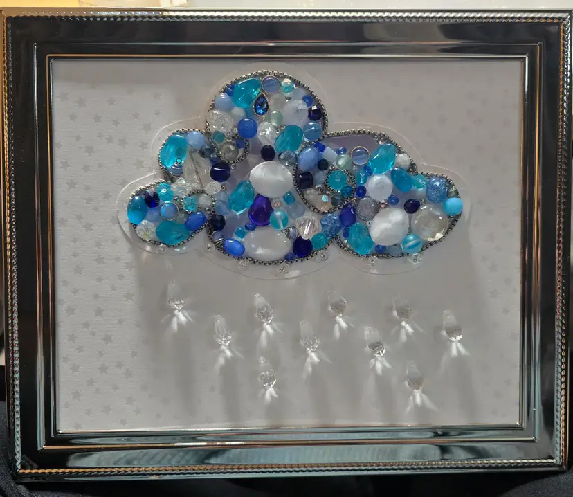 Beautiful handmade jeweled rain cloud created with blue, white, and iridescent beads and jewelry pieces. Clear teardrop beads mimic sparkling raindrops for a soft, whimsical look. Set on a star-patterned background and finished in a sleek silver frame.