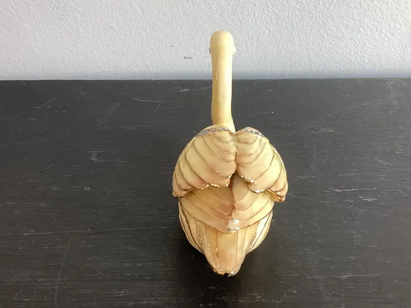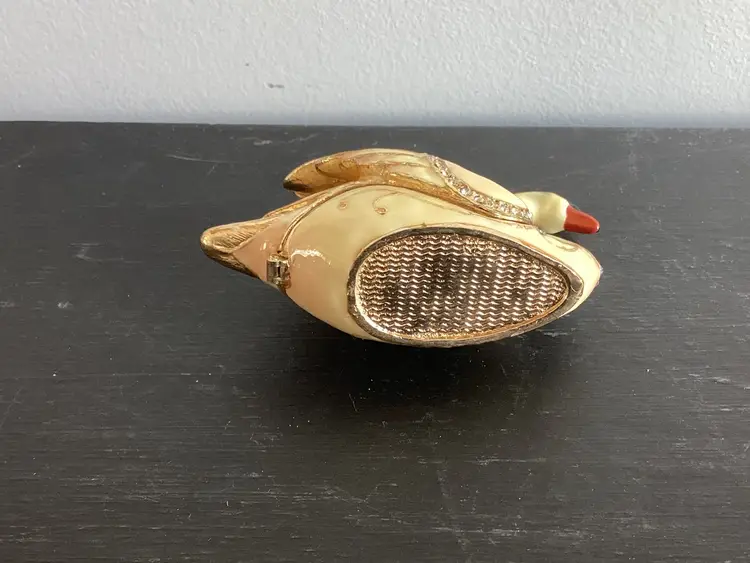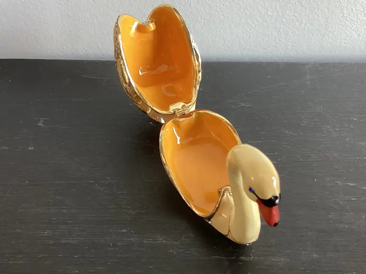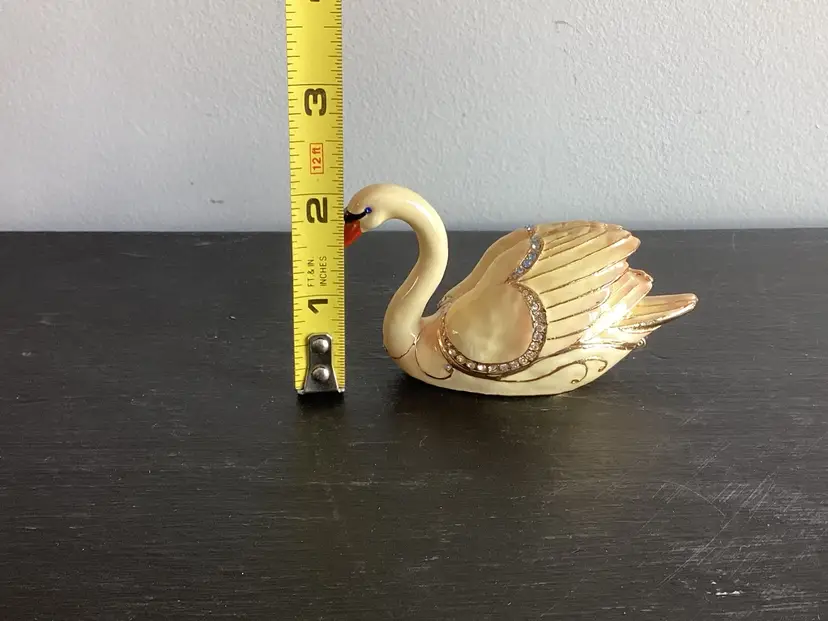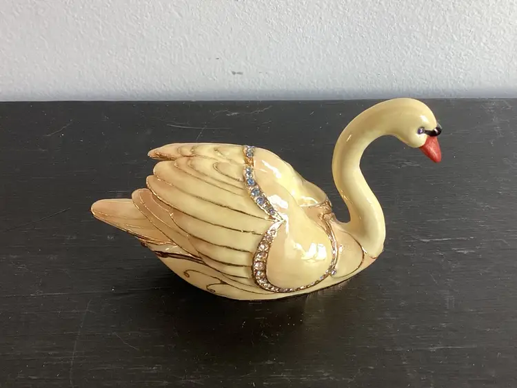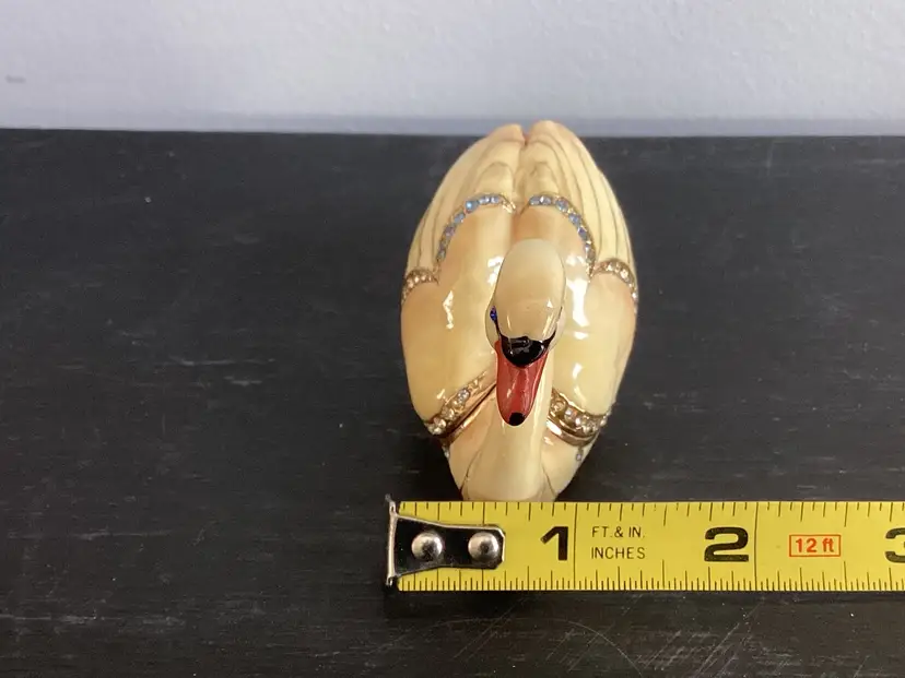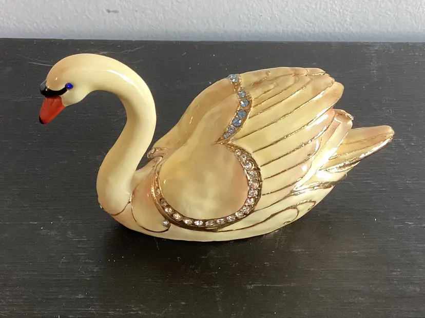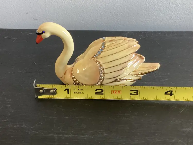 This cute little swan trinket box has all of its jewels. The latch and hinge are in perfect working condition. There are no condition issues noted.