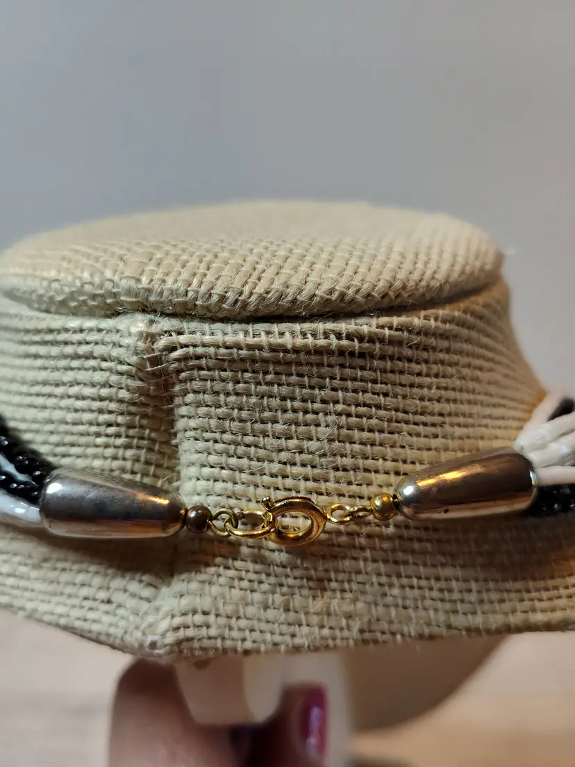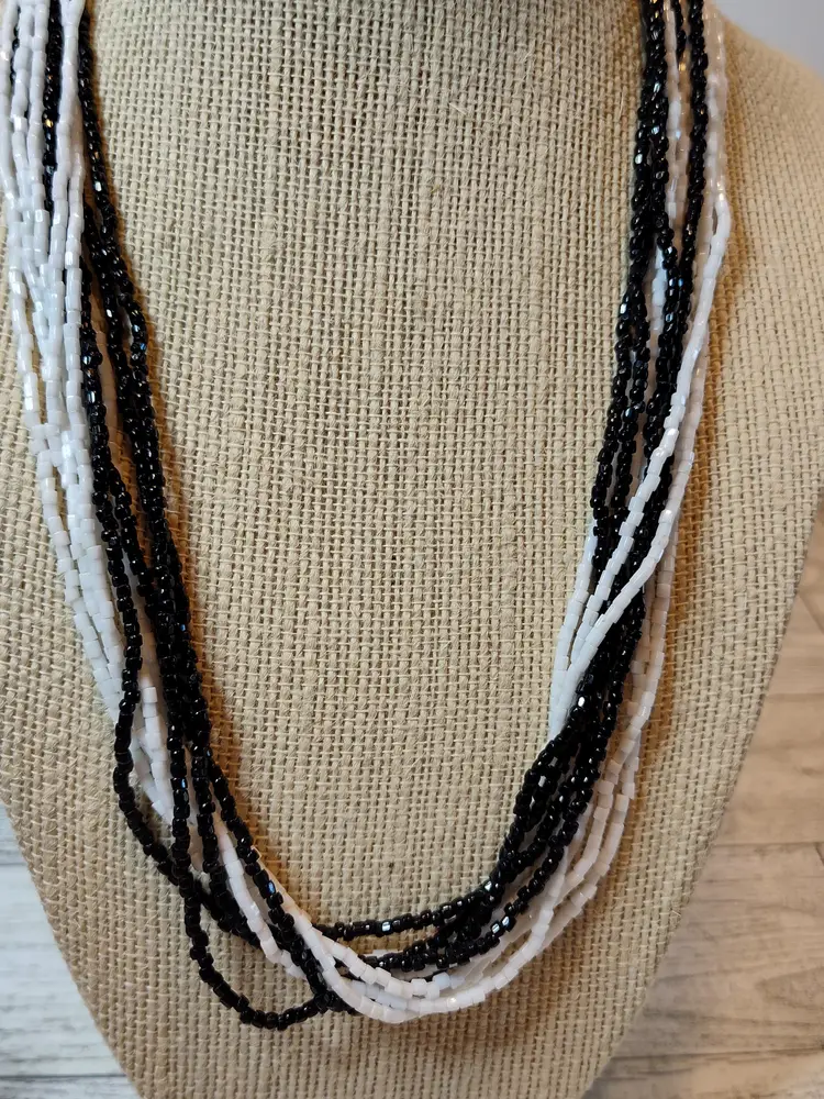19” glass black & white seed bead twist necklace with gold trim bead caps & O-ring clasp.