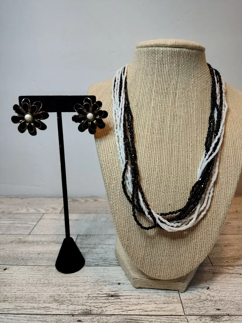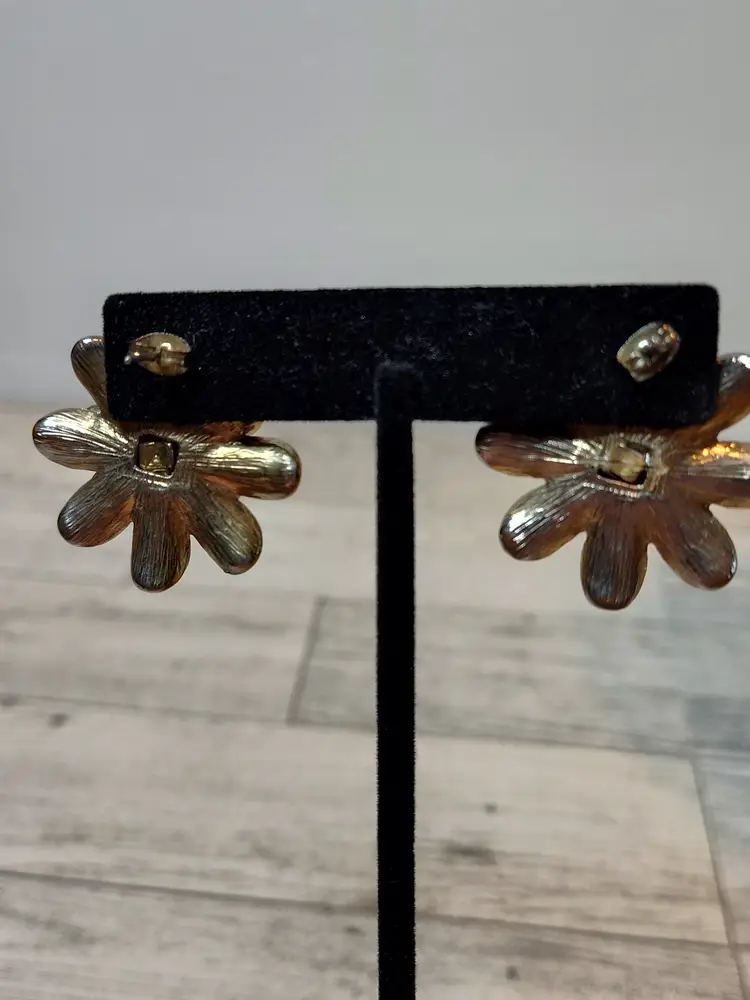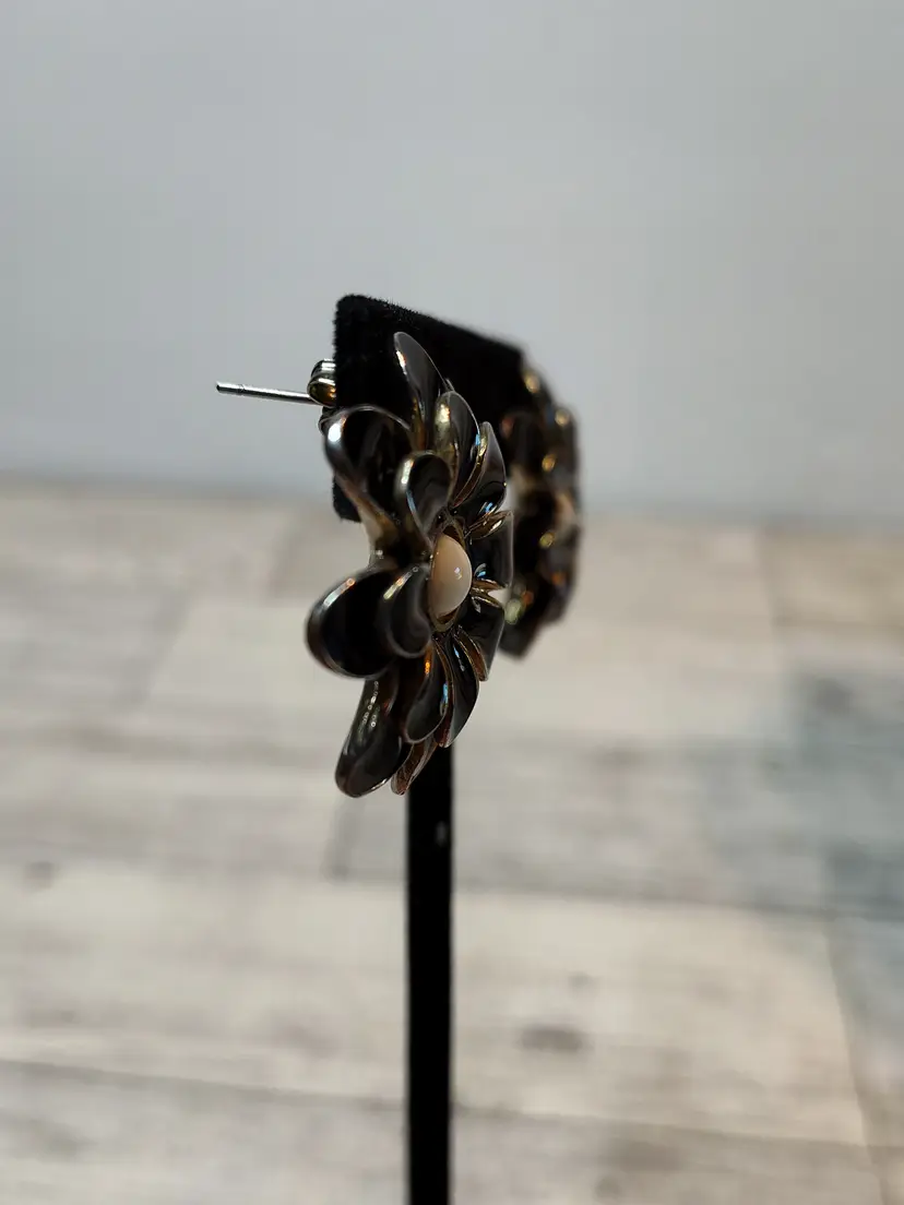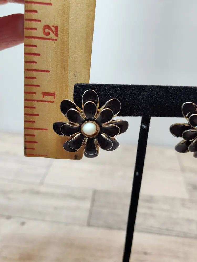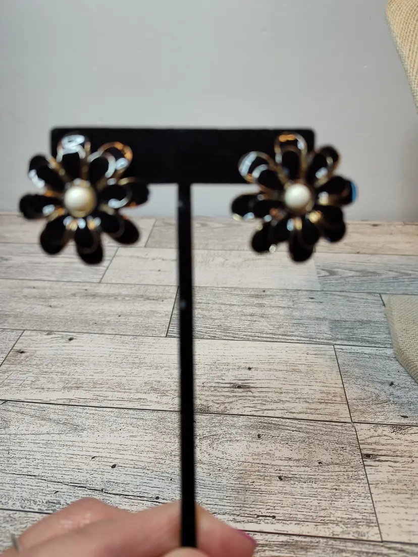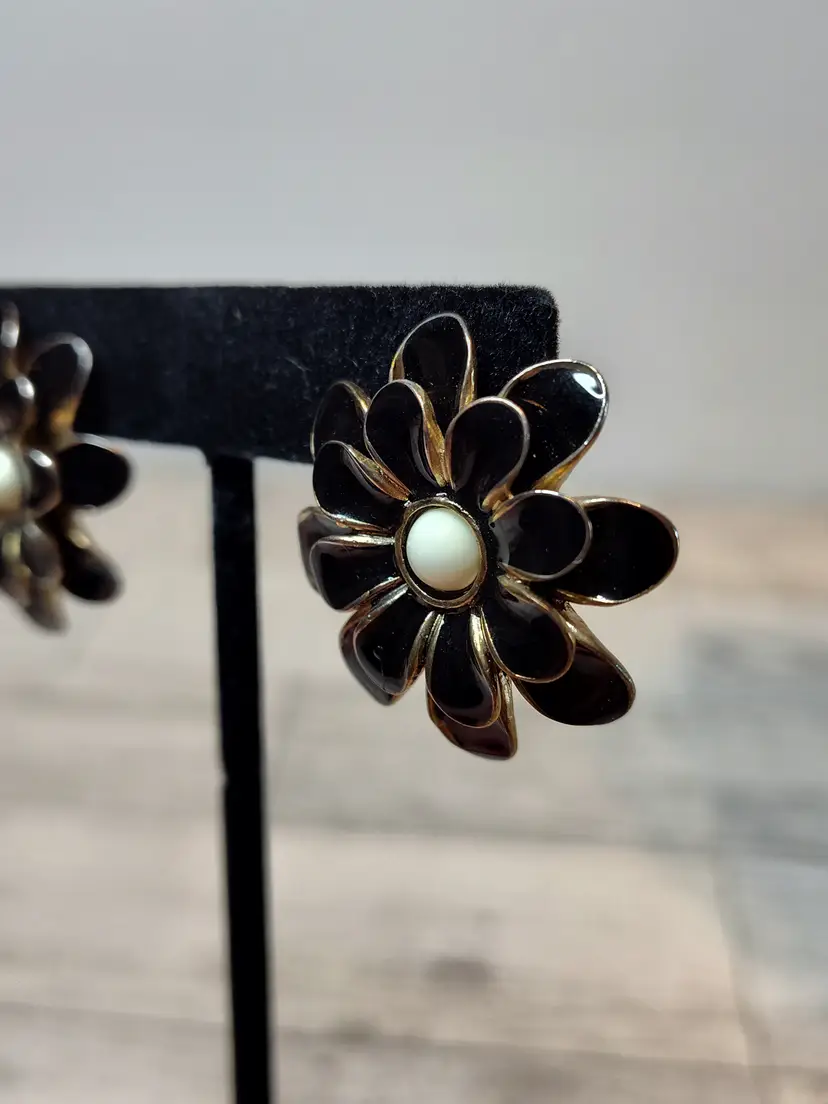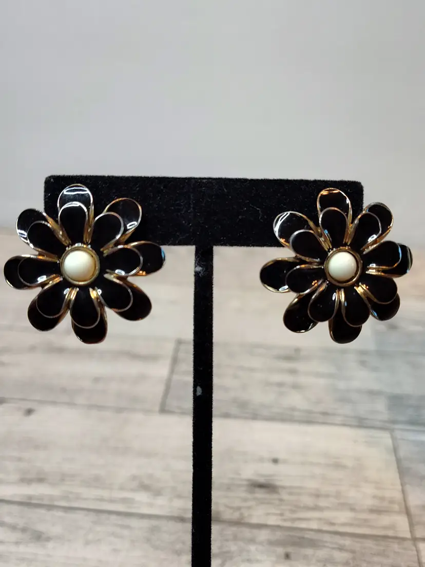 Paired with 1.25” gold tone black layered petals & white enamel center flower post earrings.
