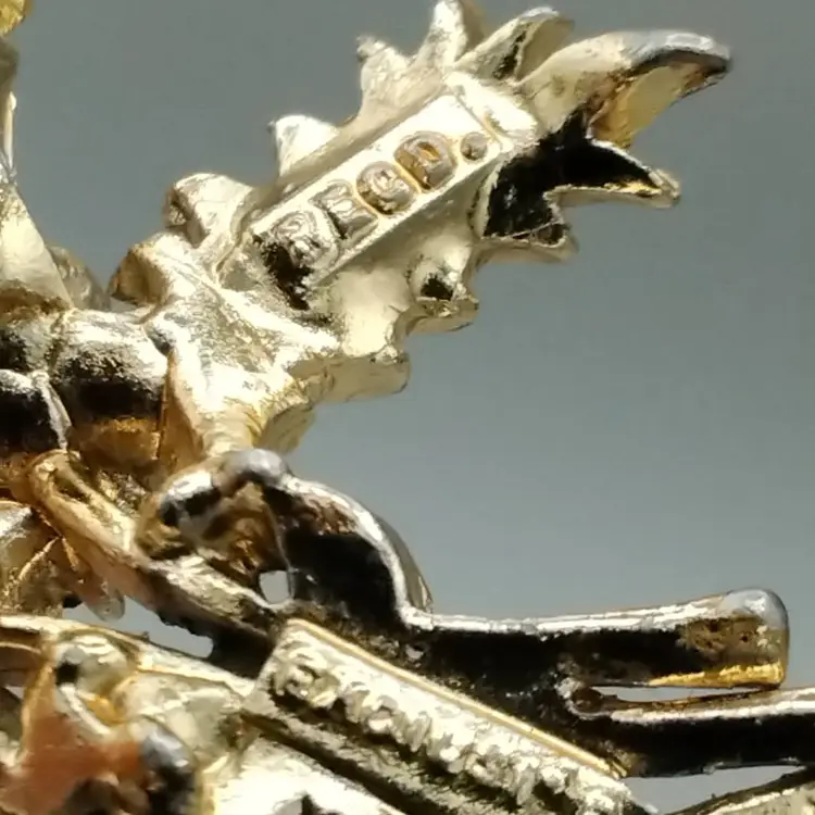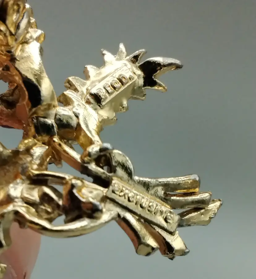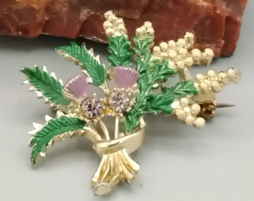 Jewelry, Brooch, A mid century gold Tone Enameled lucky white Heather Blooms Brooch with two Claw Mounted Faceted Purple rhinestones. Reg'd Exquisite signed on back. A 1950s 75 year old brooch with slight peeling of the enameled paint, but otherwise in amazing condition for being used.