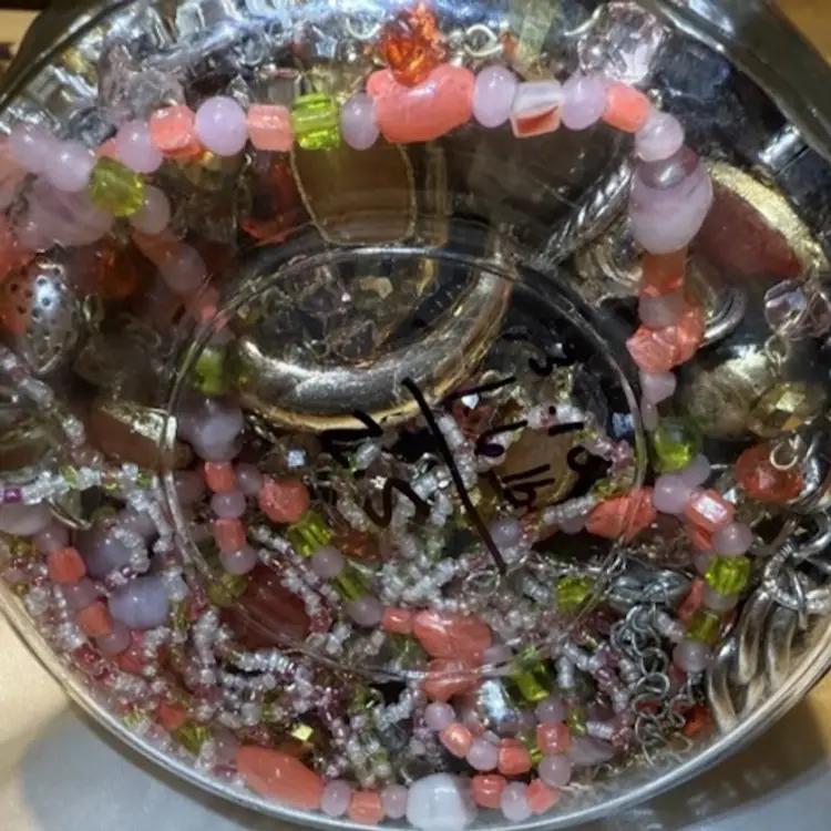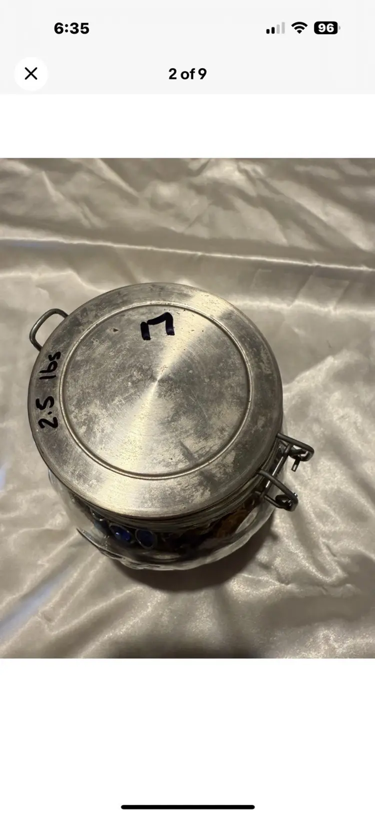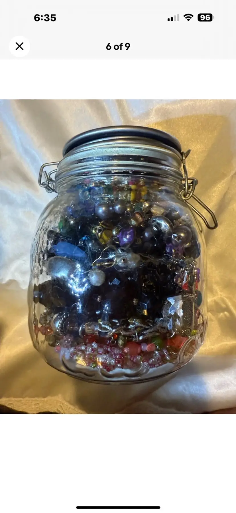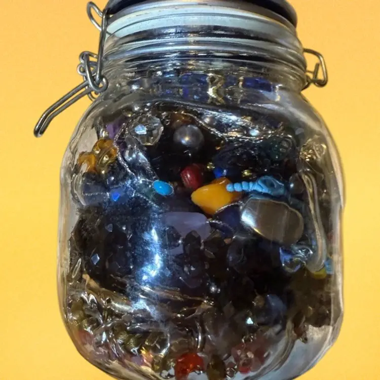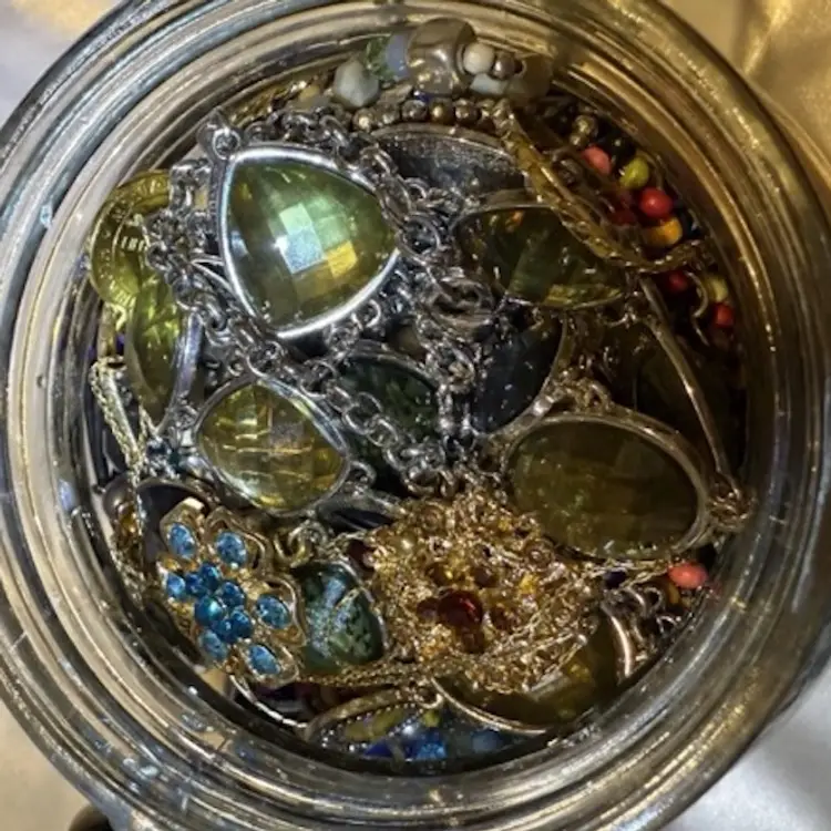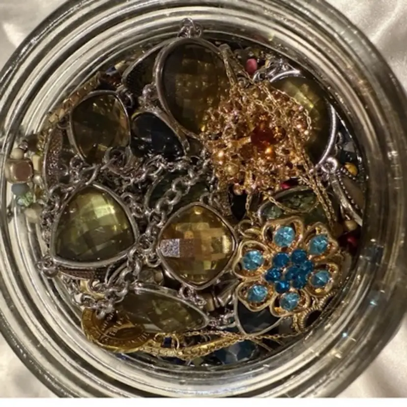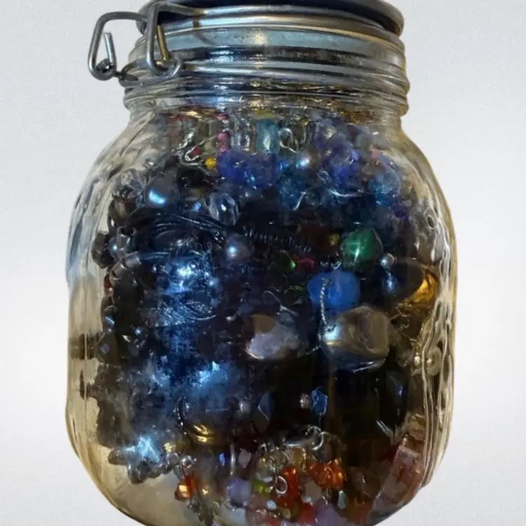 The LARGE Mystery Jewelry Jar contains a mixed lot of wearable earrings, necklaces, bracelets, and brooches . The jar weighs 3.5 lbs. The items are made with various mixed metals and materials, showcasing a vibrant multicolor palette. All wearable. No junk. Matched earrings 2.5 lbs of jewelry