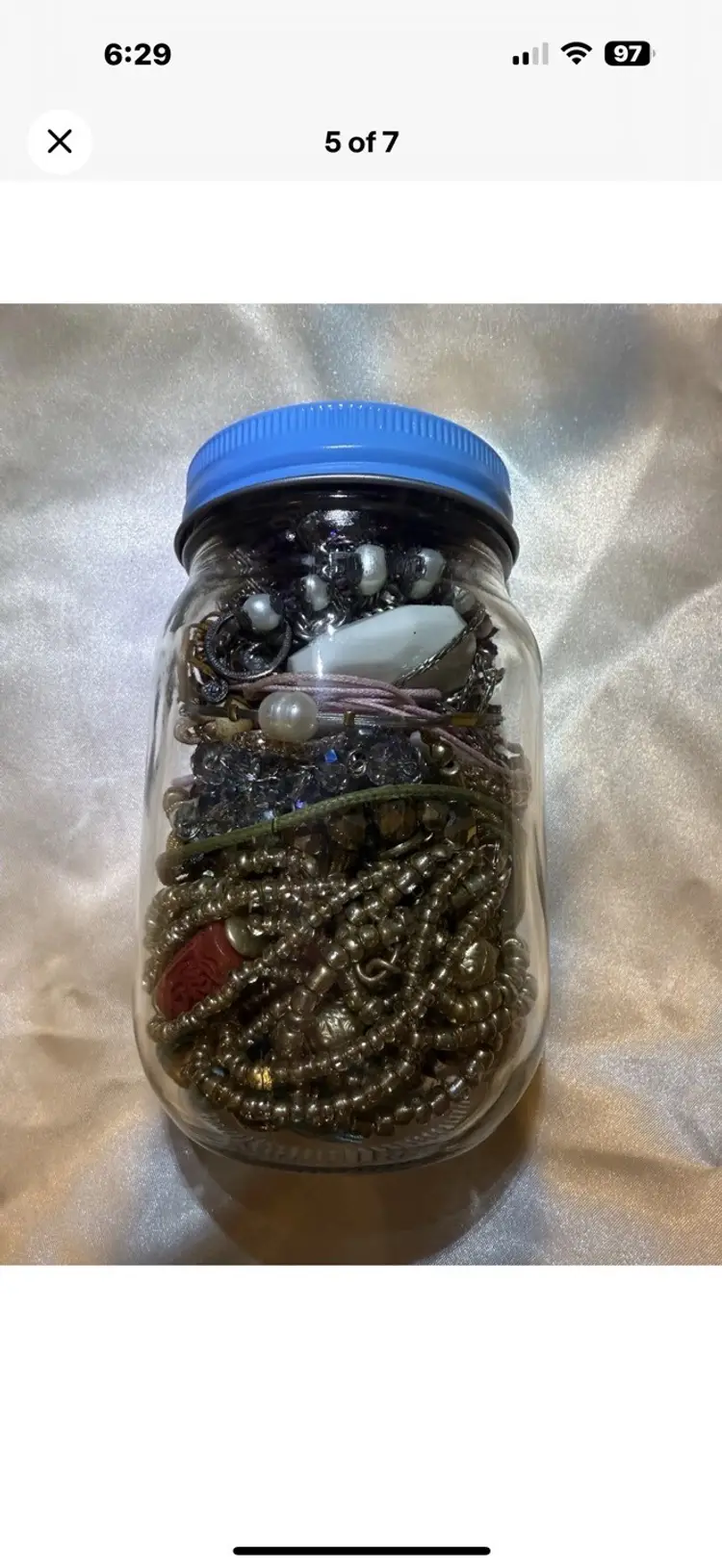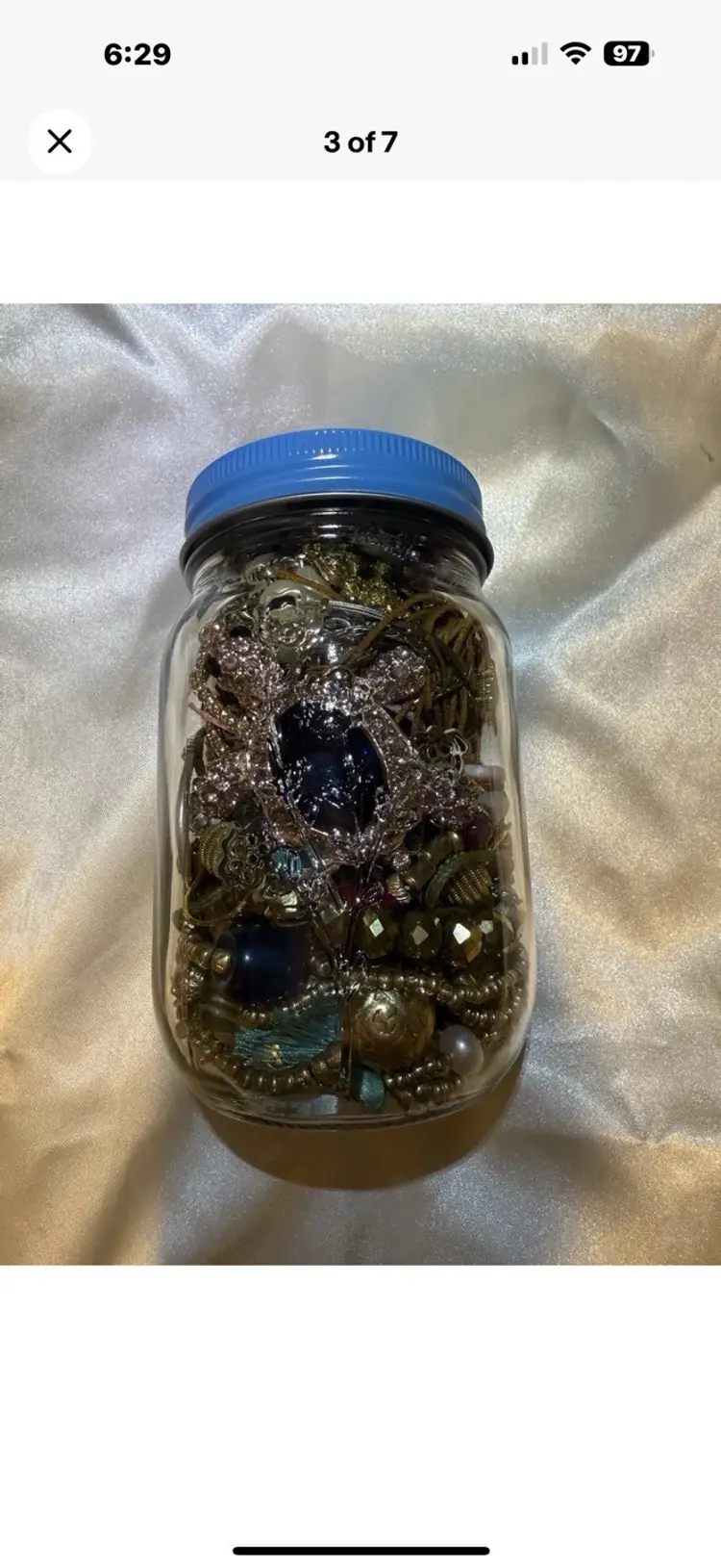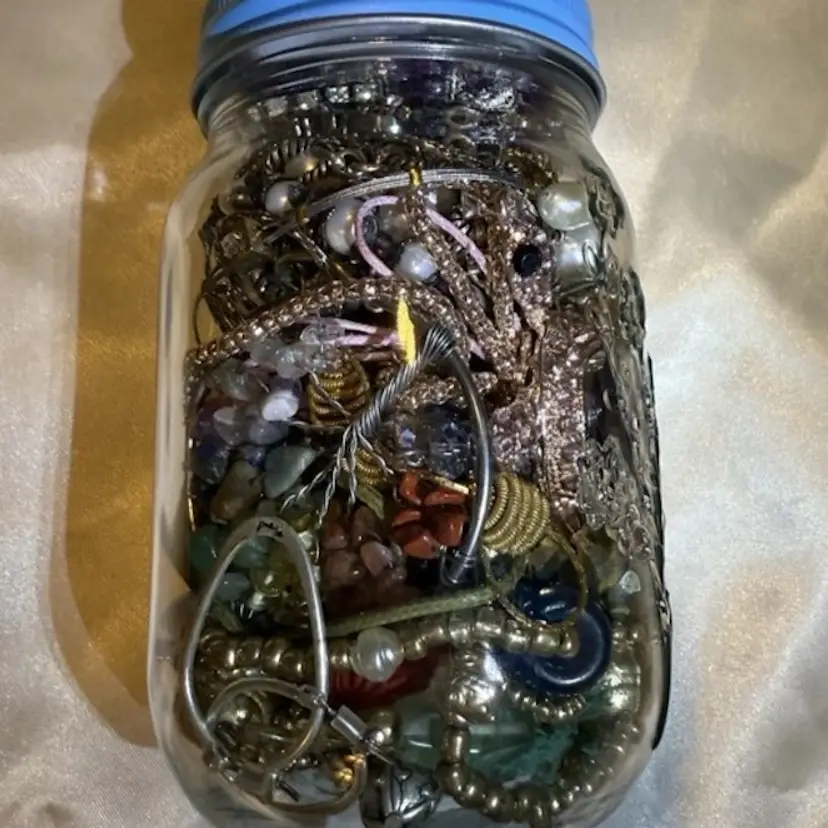 The Mystery Jewelry Jar contains a mixed lot of wearable earrings, necklaces, bracelets, and brooches . The jar weighs 1.15 lbs. The items are made with various mixed metals and materials, showcasing a vibrant multicolor palette. All wearable. No junk. Matched earrings 1 lbs of jewelry