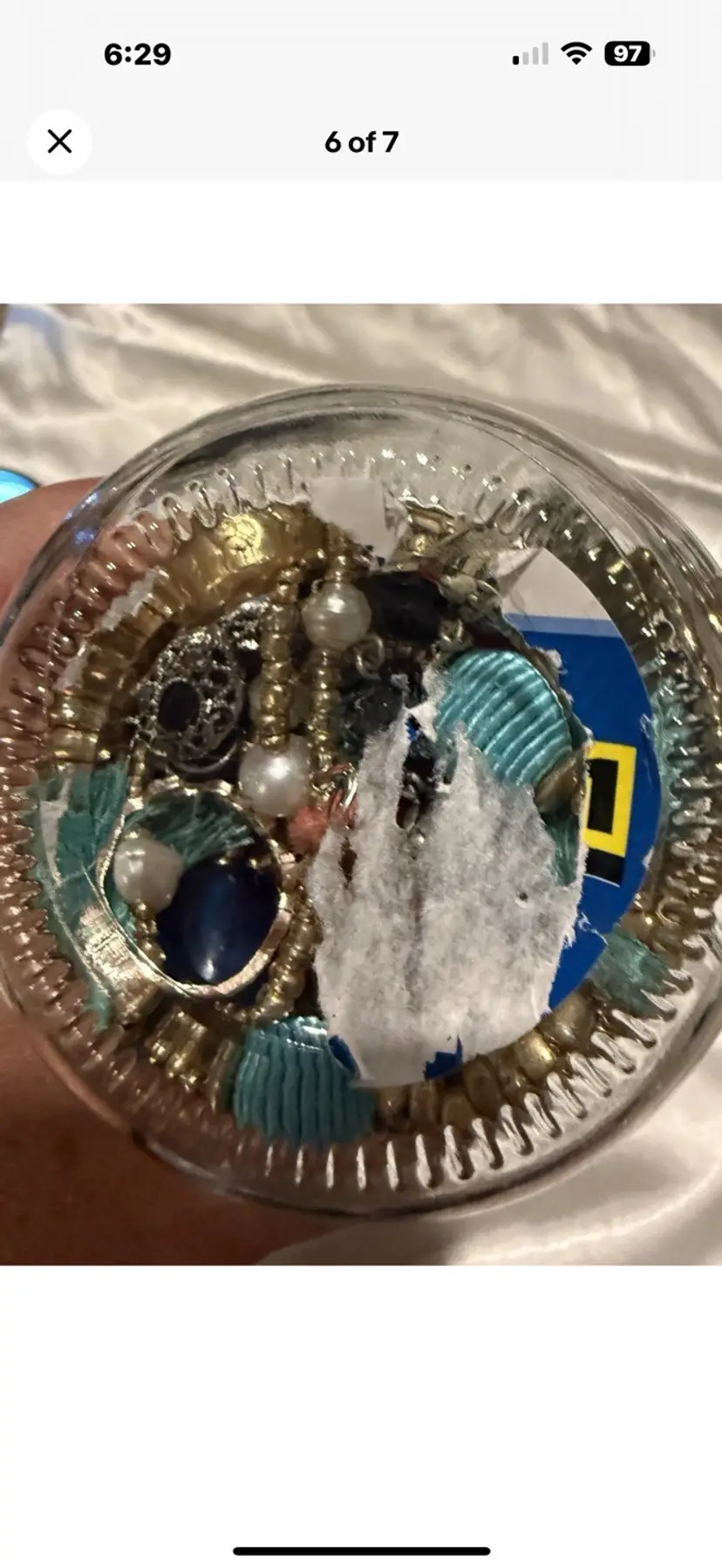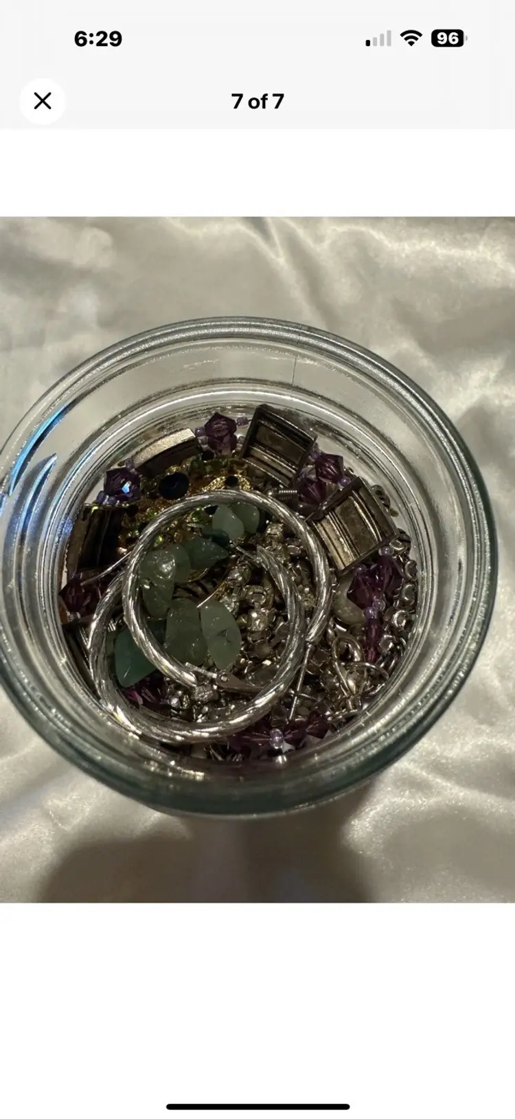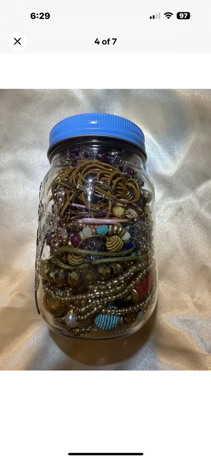 The Mystery Jewelry Jar contains a mixed lot of wearable earrings, necklaces, bracelets, and brooches . The jar weighs 1.15 lbs. The items are made with various mixed metals and materials, showcasing a vibrant multicolor palette. All wearable. No junk. Matched earrings 1 lbs of jewelry