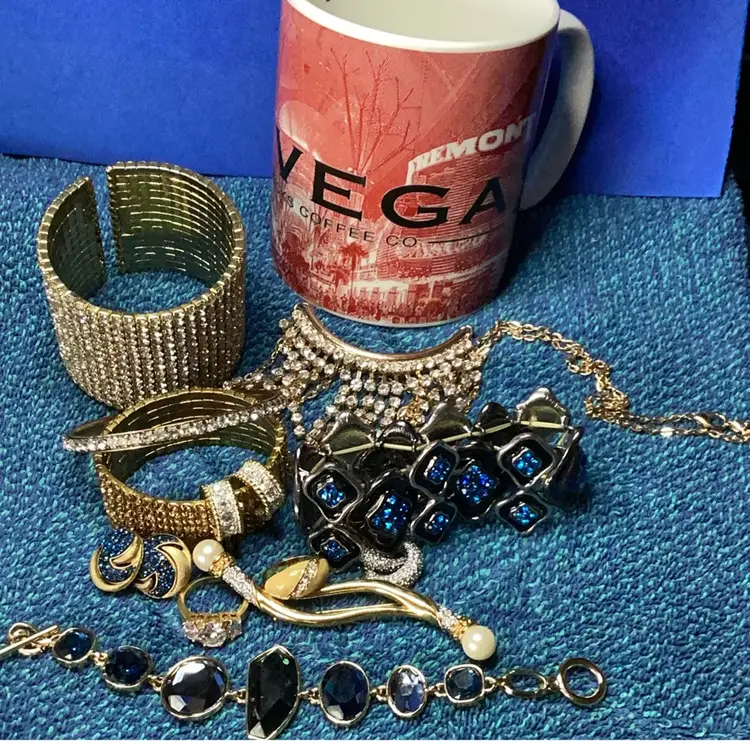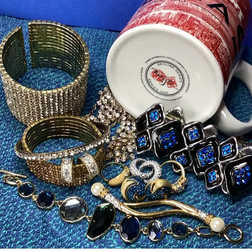 Starbucks 2002 skyline series mug with 12 pieces of wearable jewelry earrings bracelets brooch necklace rhinestones a lot of bling.