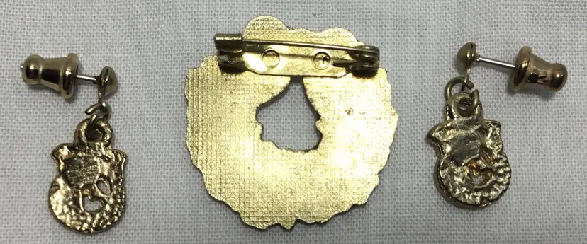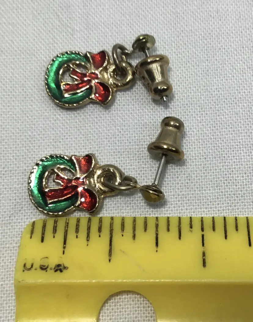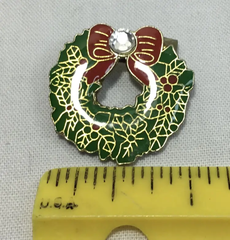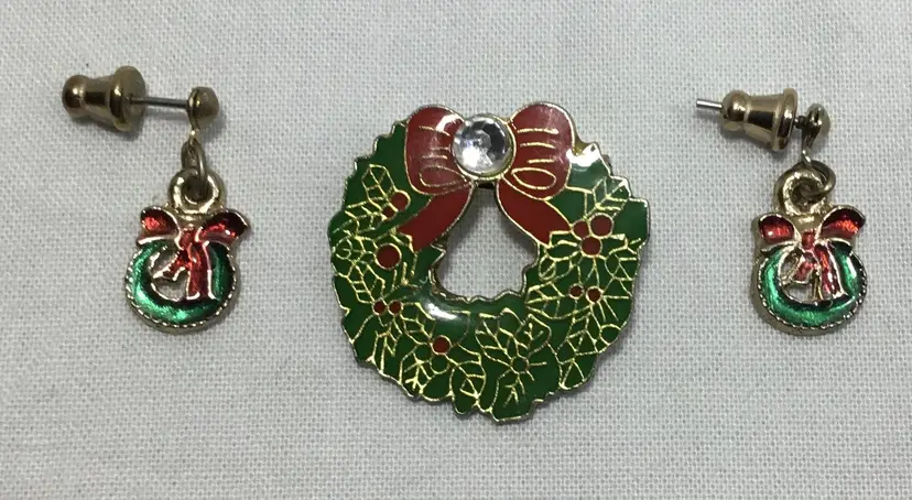 1 inch diameter wreath brooch, gold tone metal, red & green enamel with gold tone lines showing a pattern and acrylic clear rhinestone at top. Earrings are very small, 3/8 inch by 1/2 inch wreaths, green and red enamel on gold tone metal. Dangle 3/4 inch long from gold tone metal studs with backs.