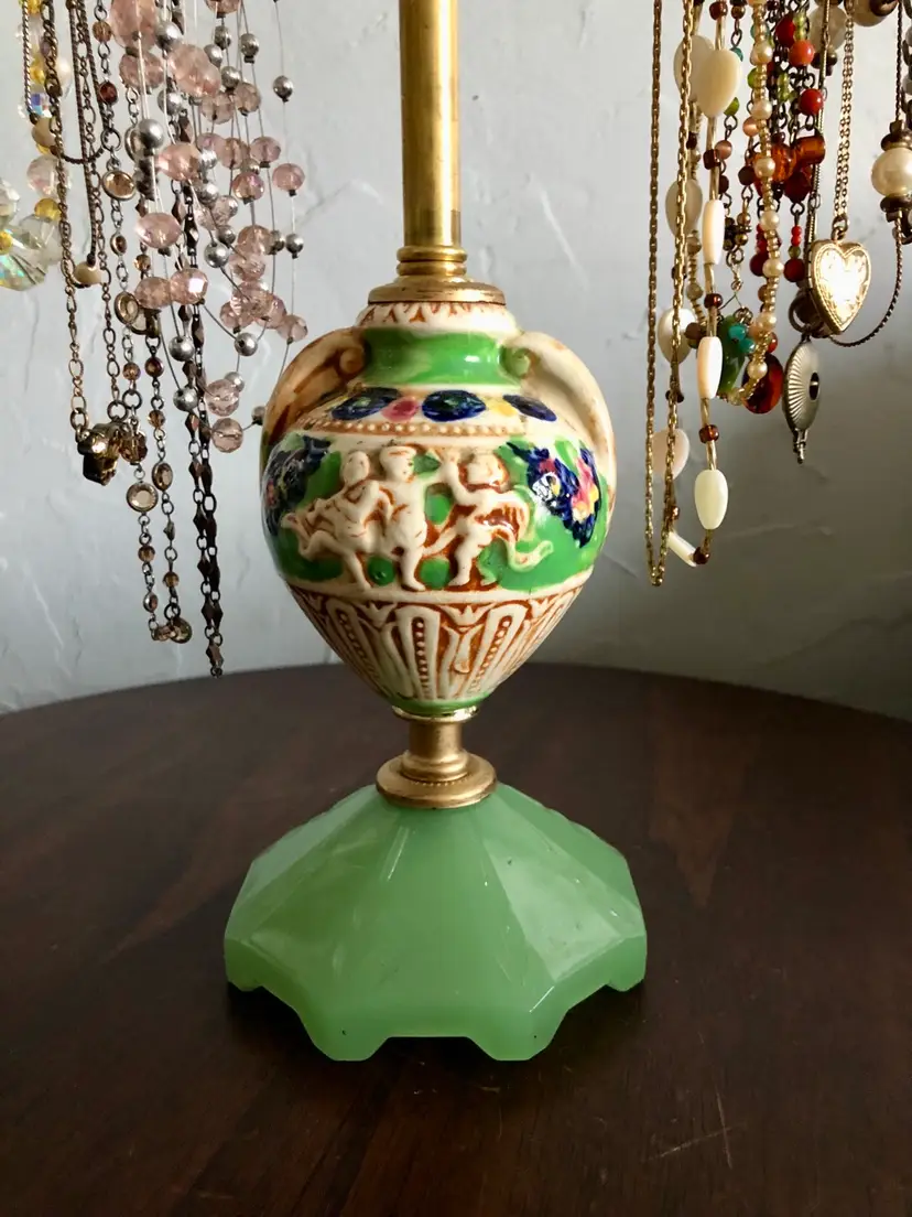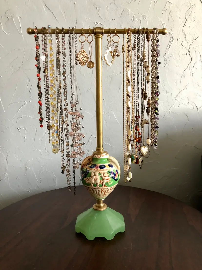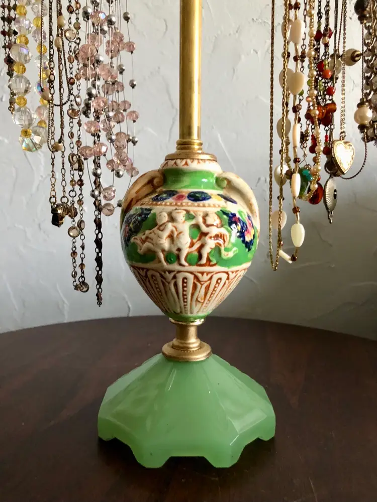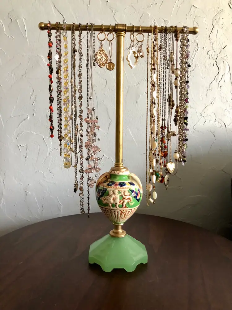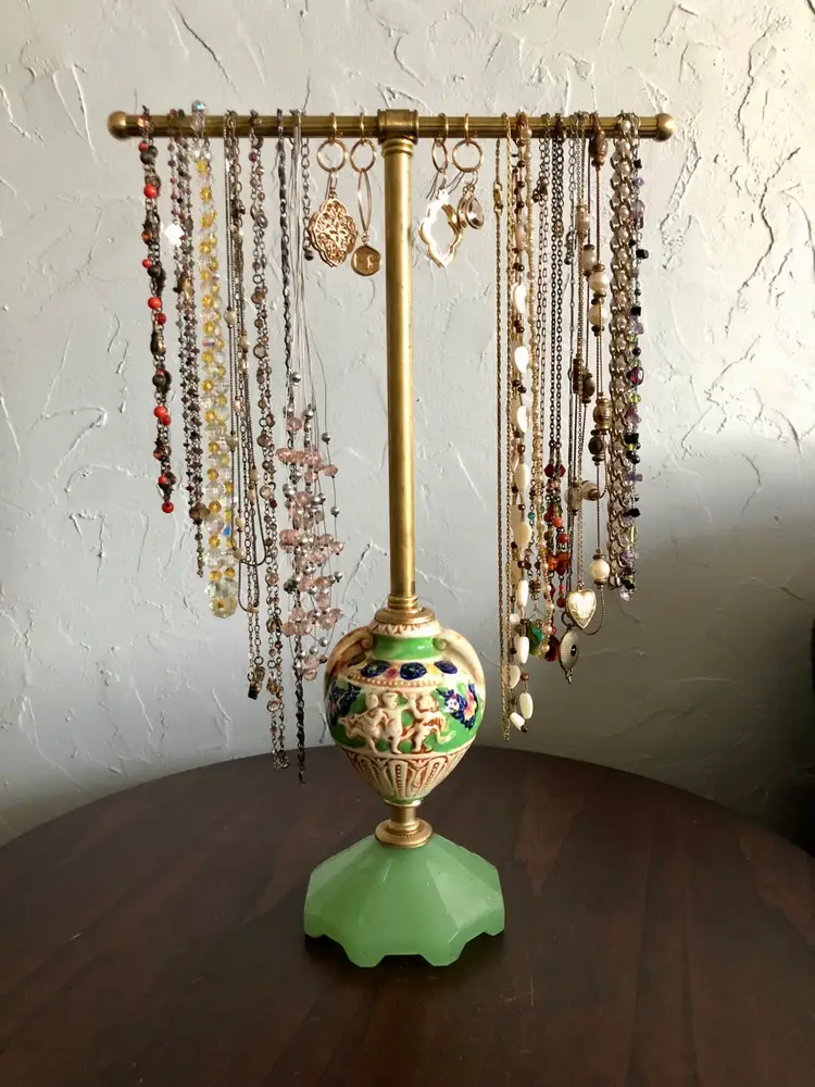This beautiful jewelry stand is made from a repurposed vintage Jadeite and porcelain lamp. It is about 15 1/2” tall and has two 5” arms to hold several pieces of jewelry. It also has 4 earring holders.