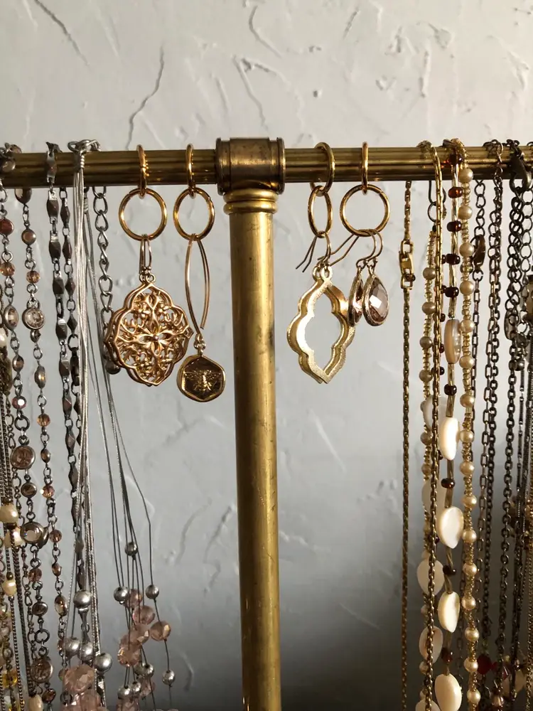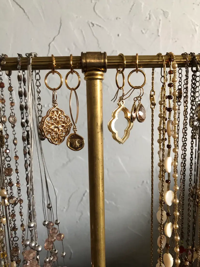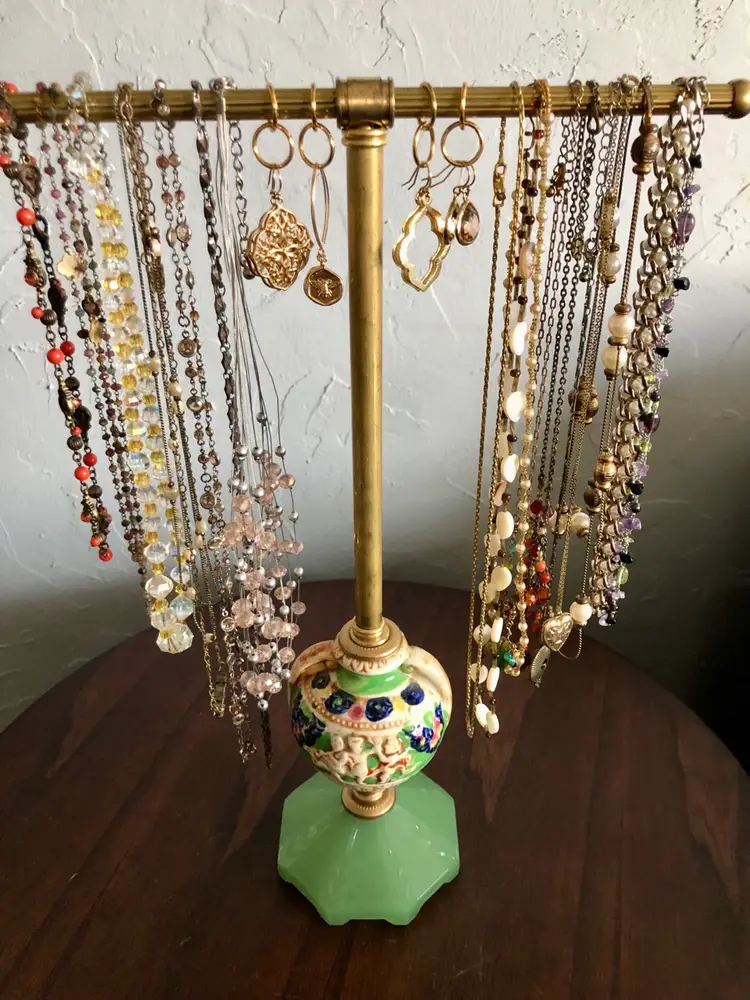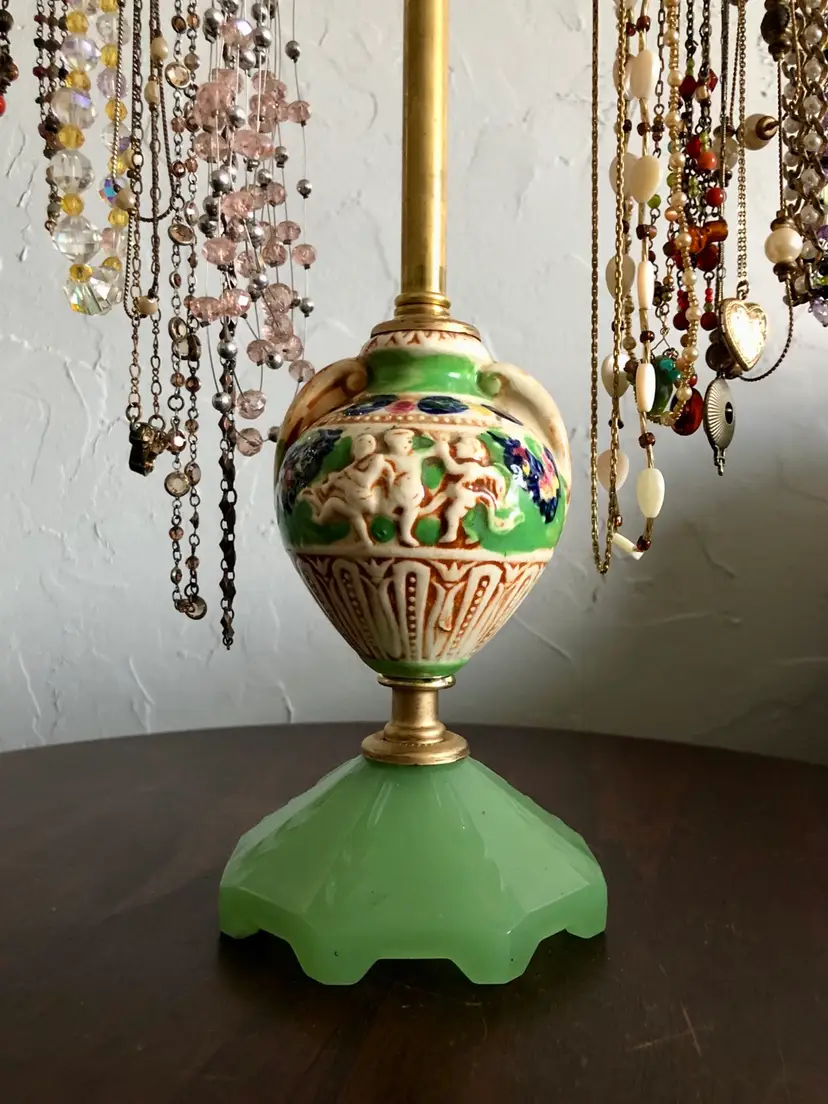 This beautiful jewelry stand is made from a repurposed vintage Jadeite and porcelain lamp. It is about 15 1/2” tall and has two 5” arms to hold several pieces of jewelry. It also has 4 earring holders.