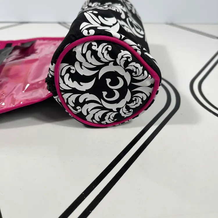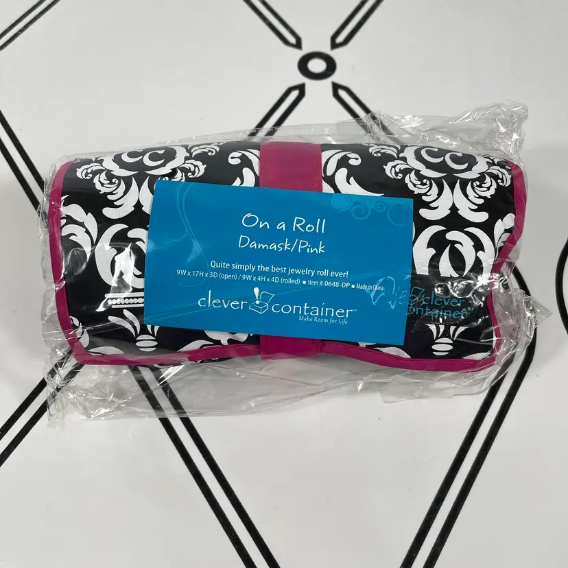 Unroll organized elegance with this Clever Container On a Roll organizer. Its vibrant pink interior and chic black and white damask exterior exude sophisticated style, while multiple clear zippered compartments keep your treasures visible and secure. Smooth zippers glide effortlessly, revealing spacious sections designed to cradle your jewelry and small accessories. When rolled, a secure pink band keeps everything neatly contained, making it perfect for stowing in your luggage or purse. Ideal for travel, gym bags, or simply keeping your vanity clutter-free.