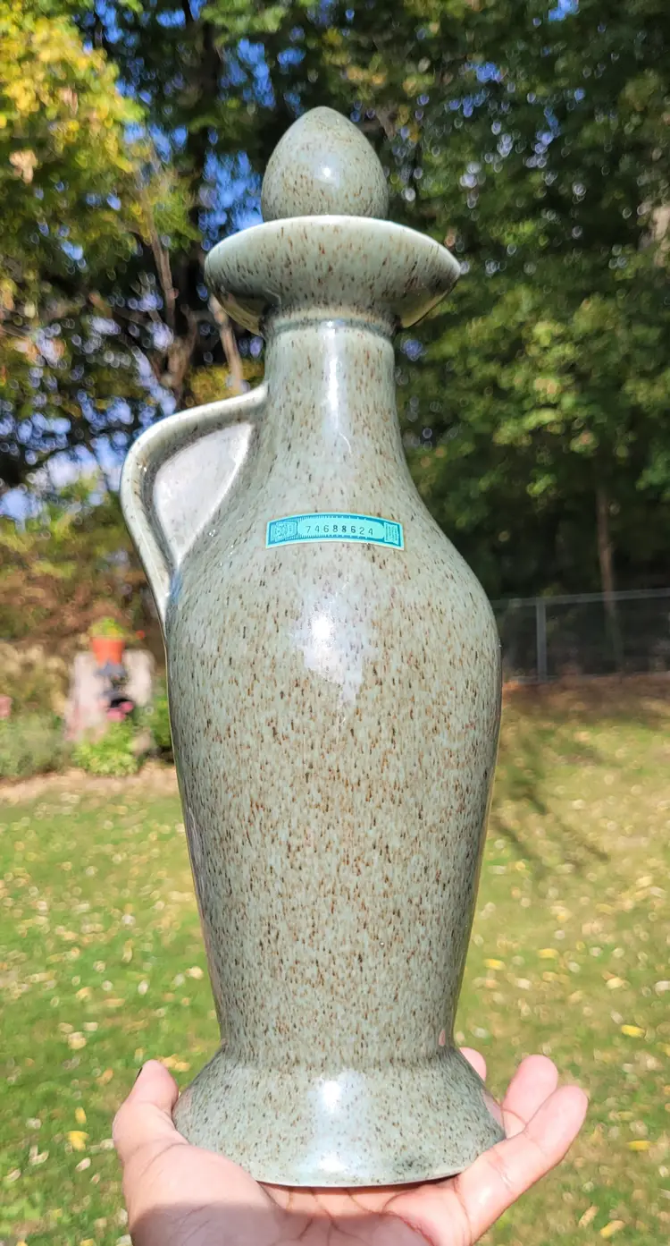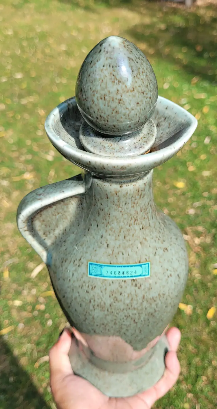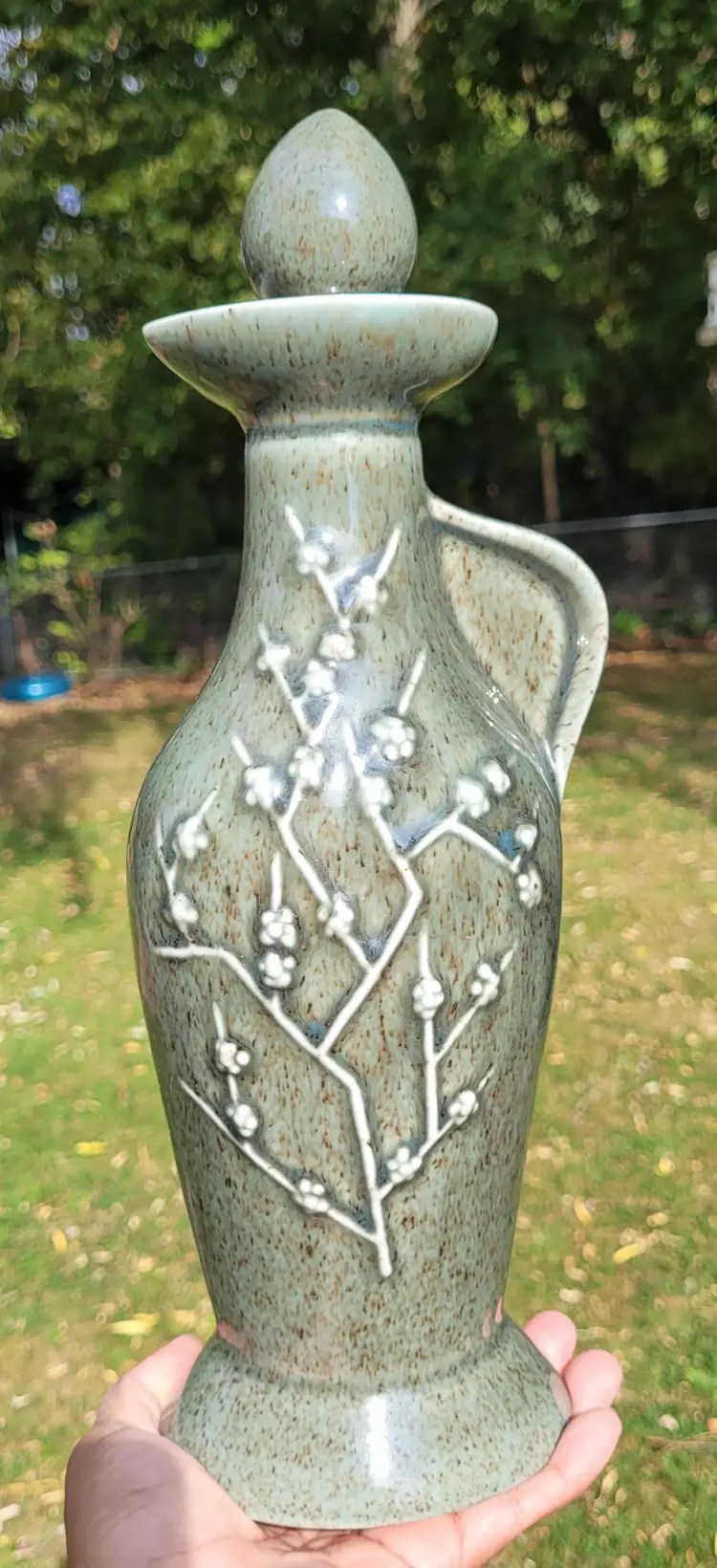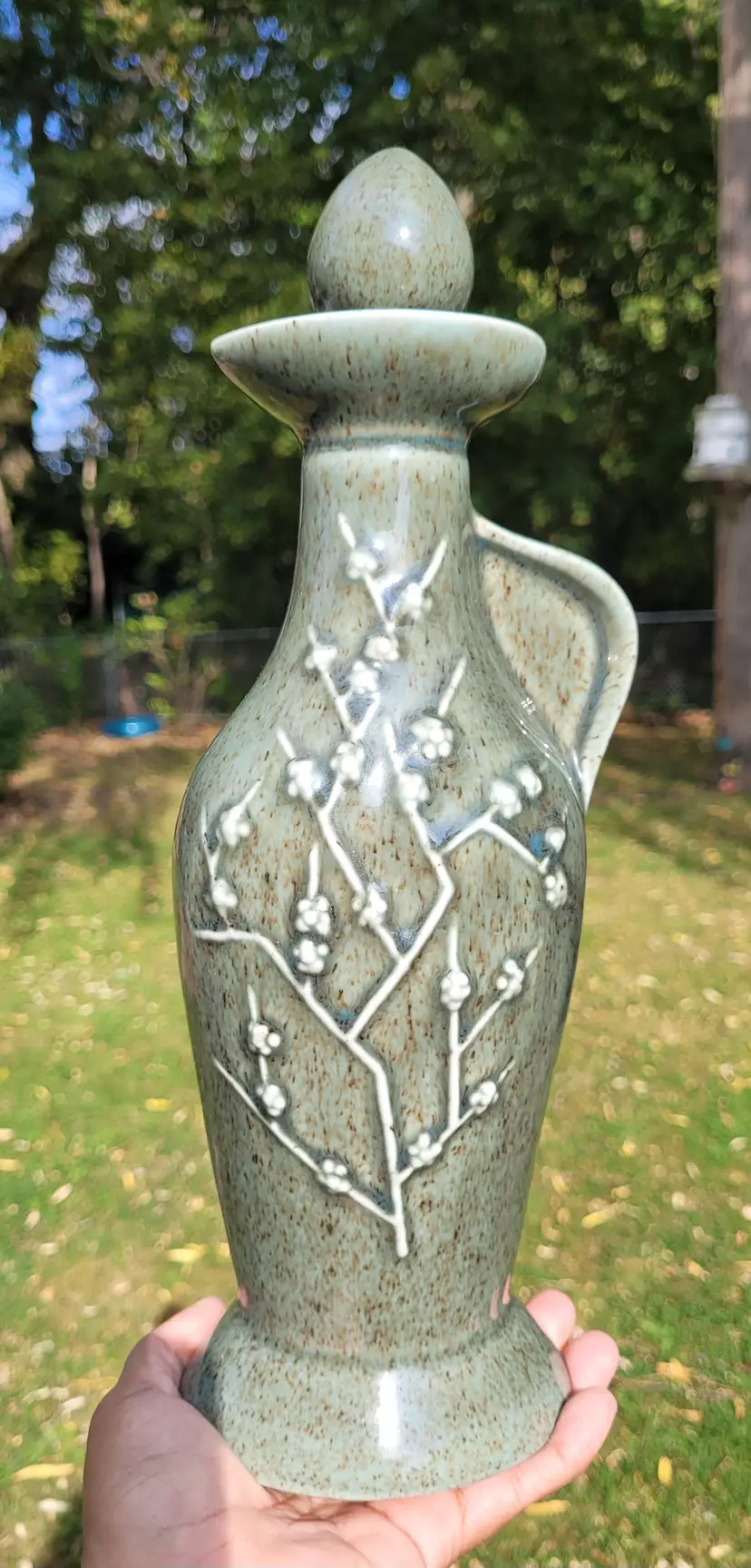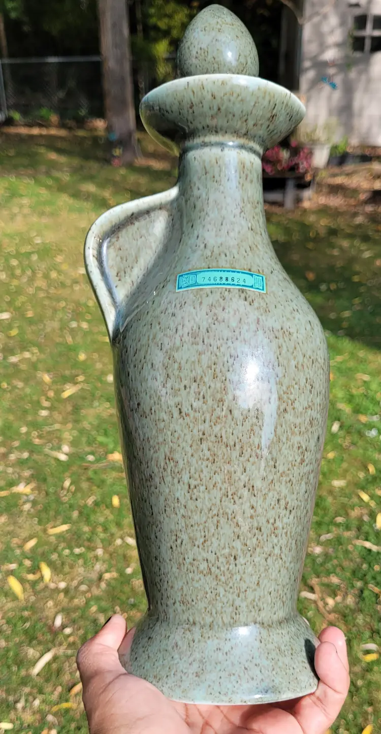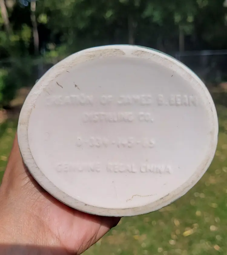 Vintage Jim Beam Whiskey "Regal China" Green Decanter Cherry Blossoms 13" with Cork Stopper FLAW- Small chip on the top rim of bottle.