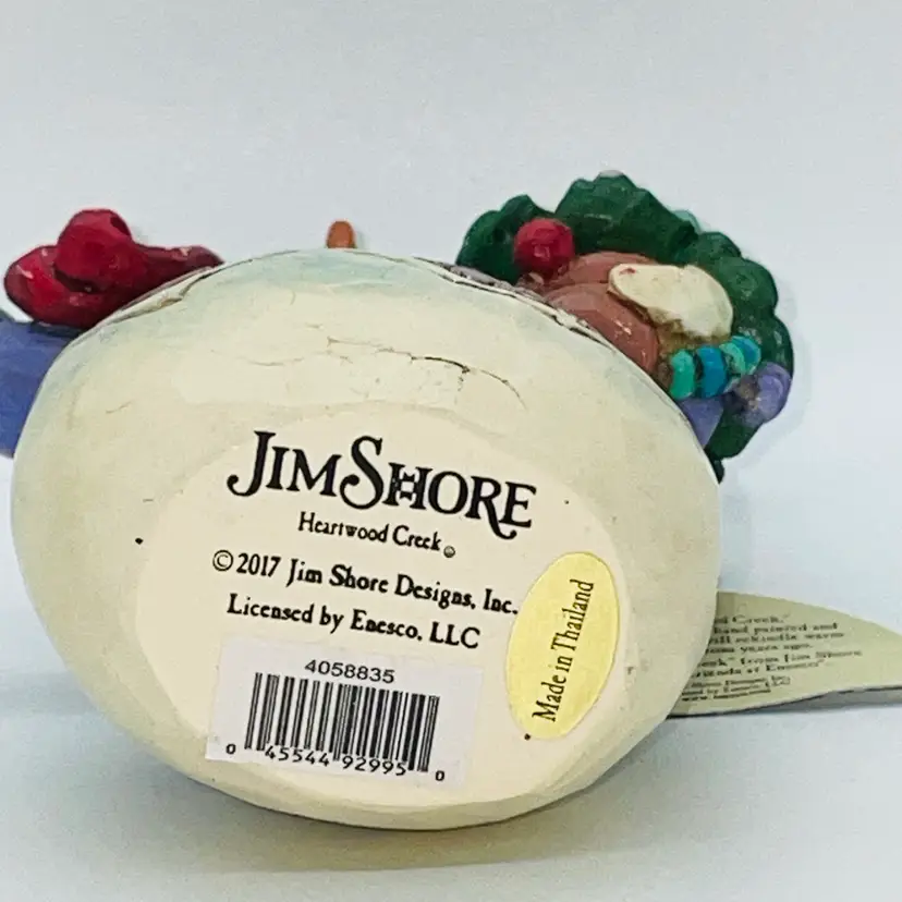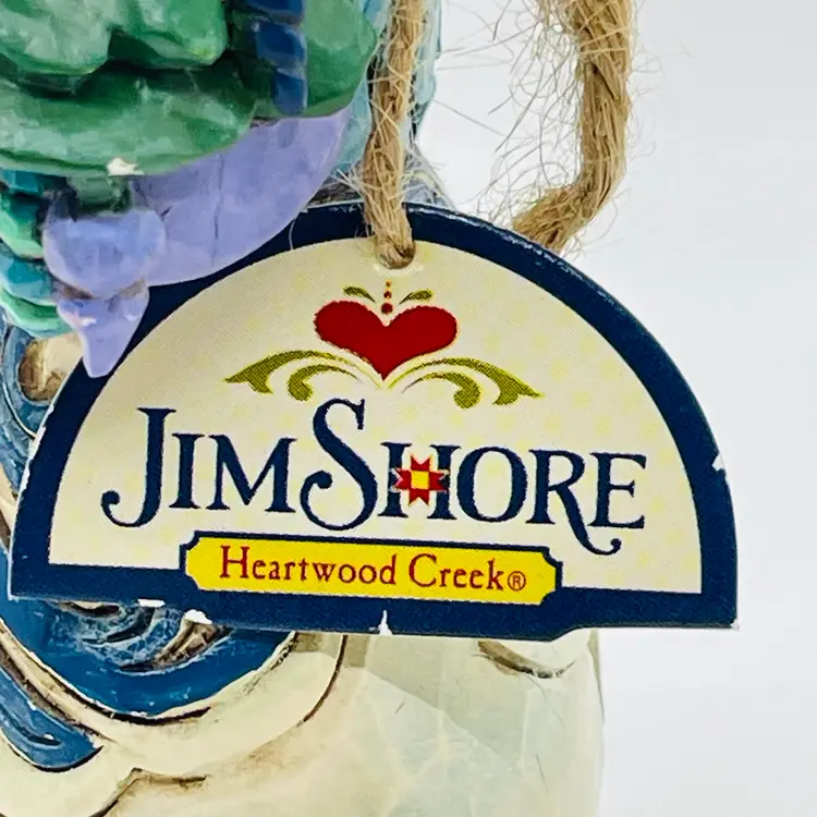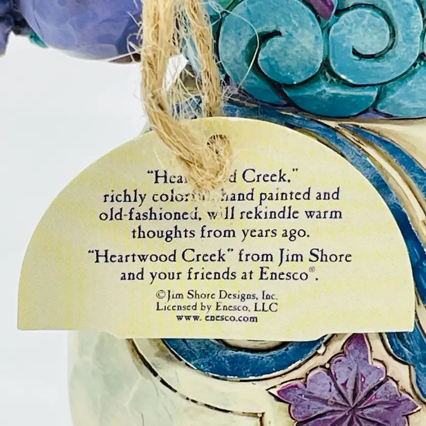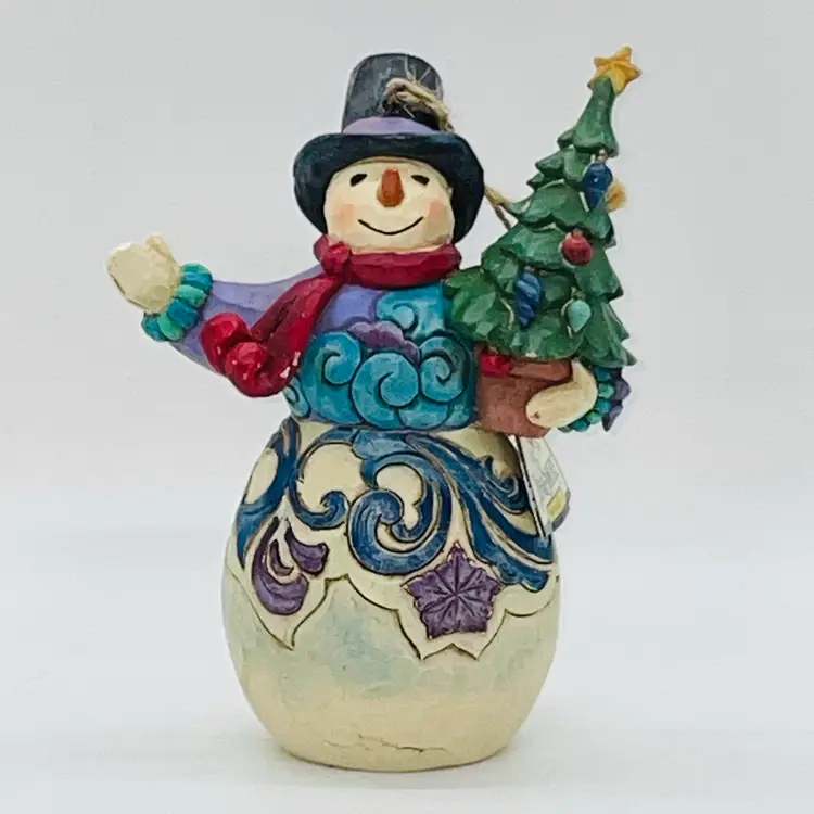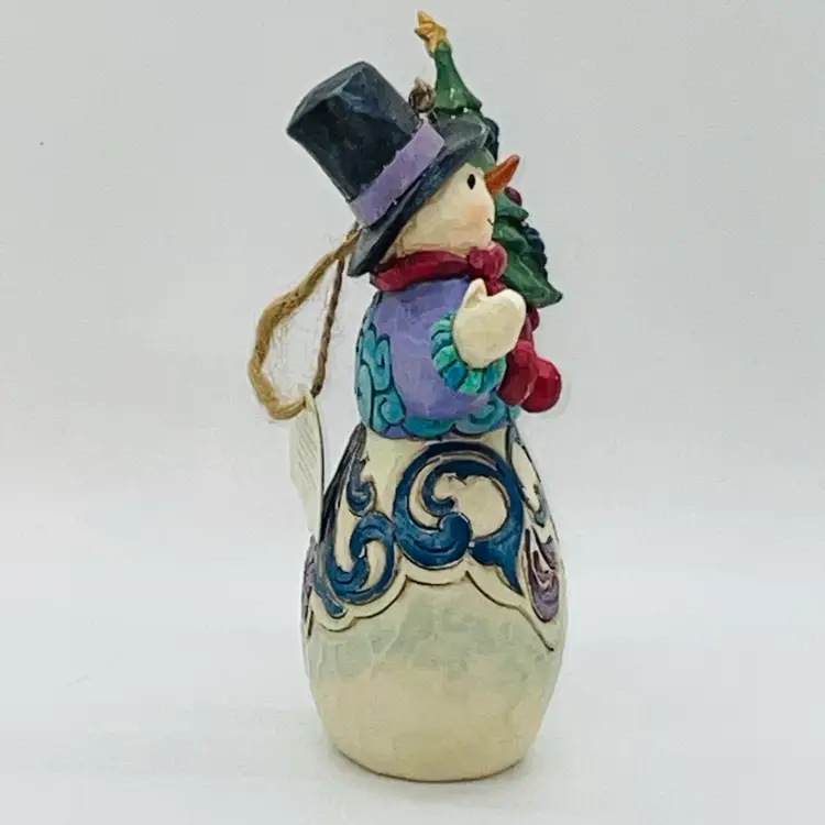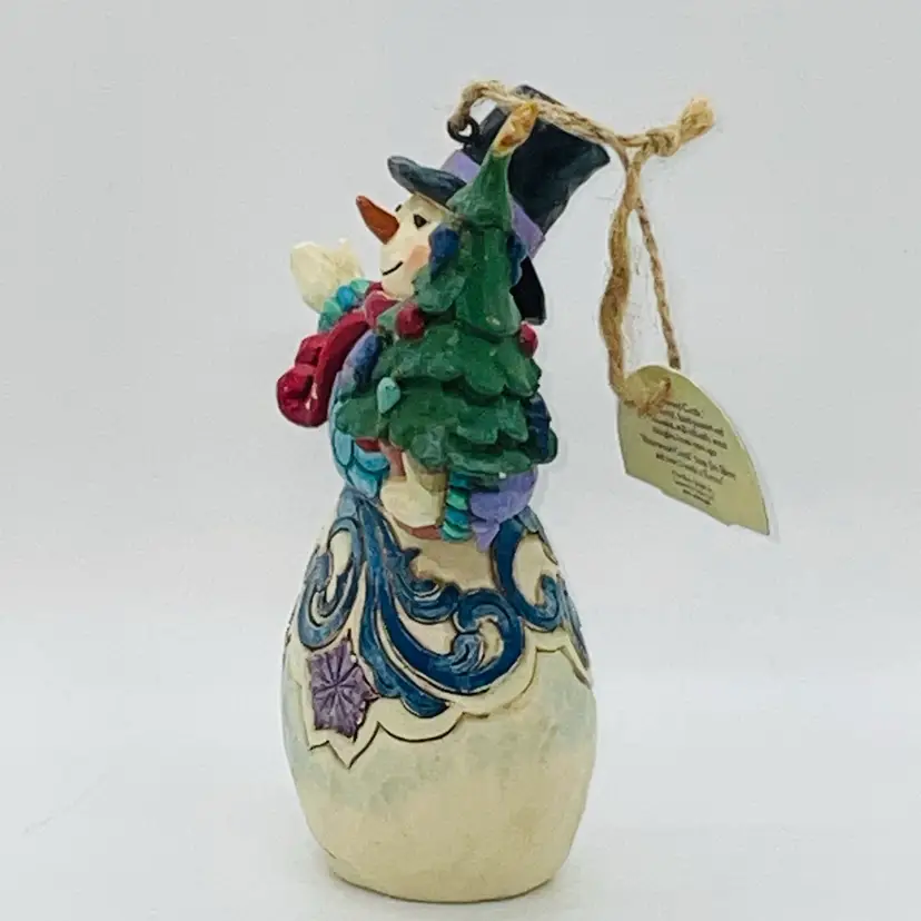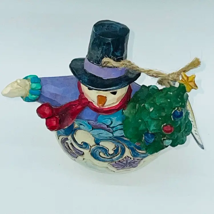 This is a Jim Shore/Enesco Heartwood Creek “Seasons to Smile” snowman ornament figurine #4058835. It is made of resin, but has the look of hand carved wood.
