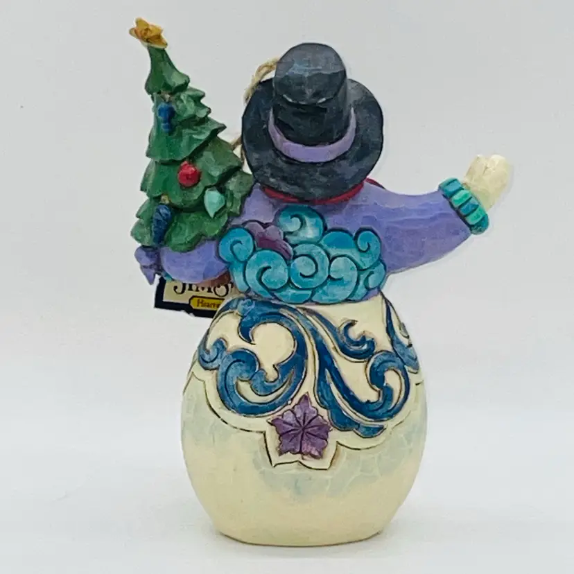 The snowman is holding a tree and he’s ready to celebrate the holidays!