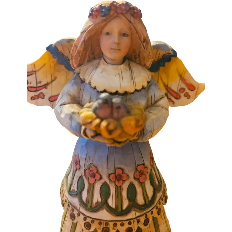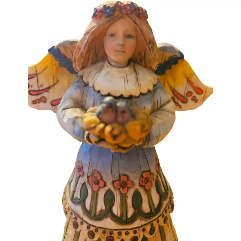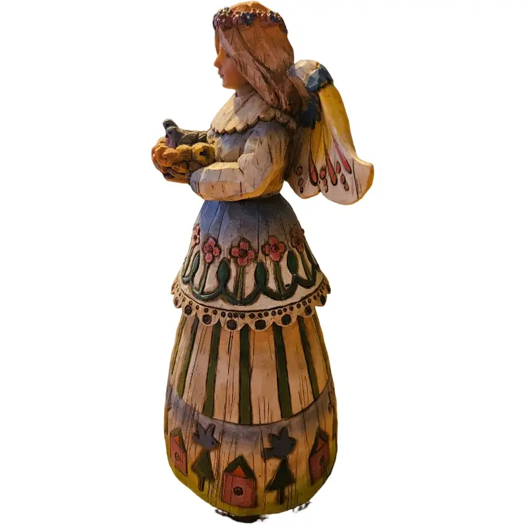 Charming angel figurine by Jim Shore. Features blue and yellow wings. Adorned with floral and birdhouse motifs. Adds a whimsical touch to decor.