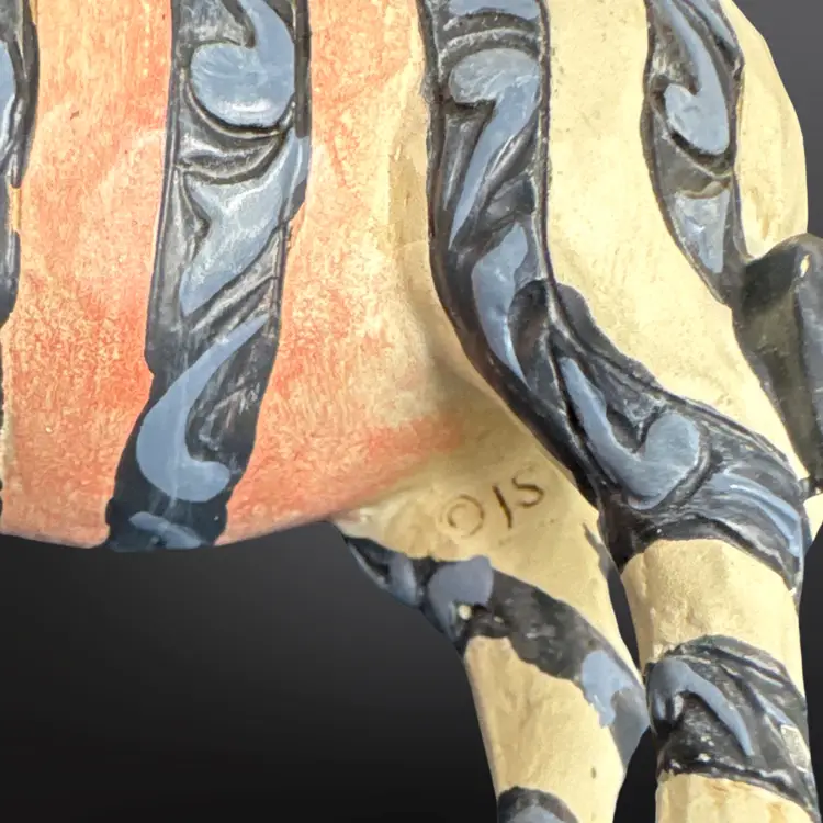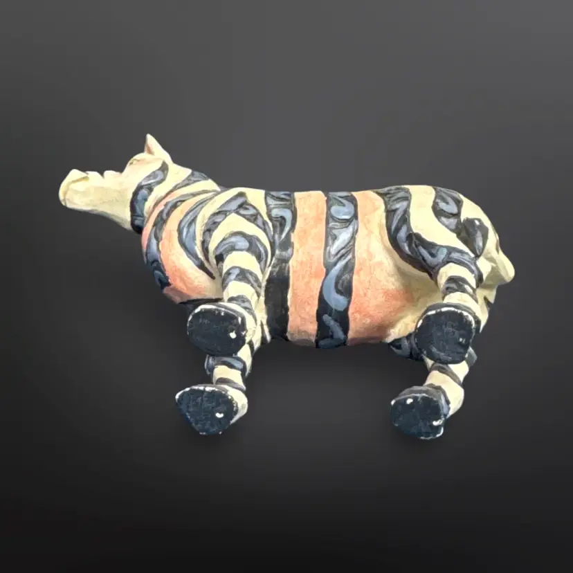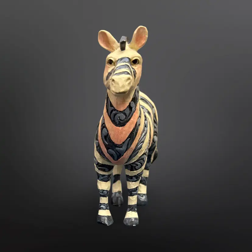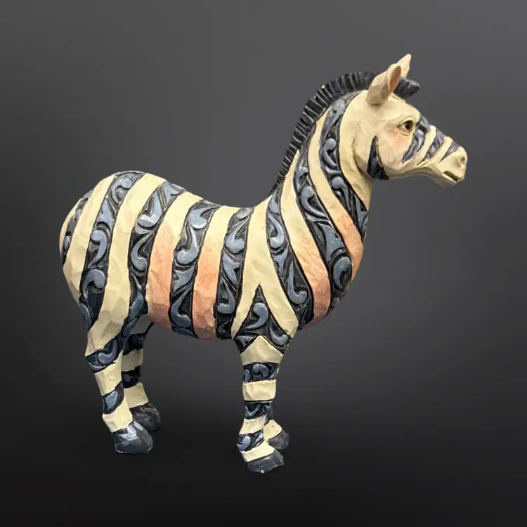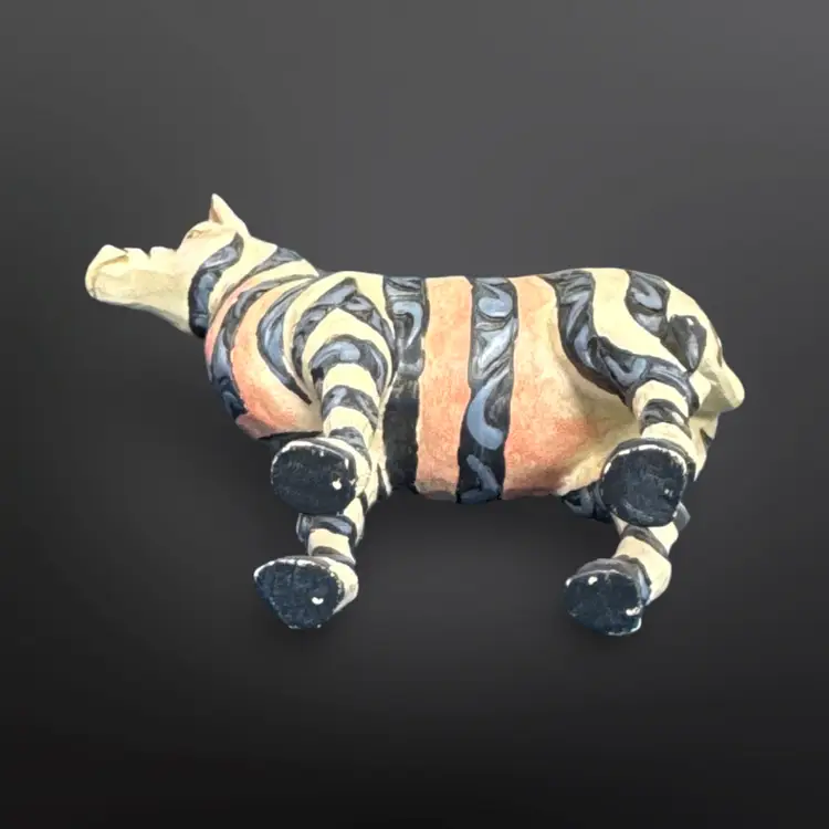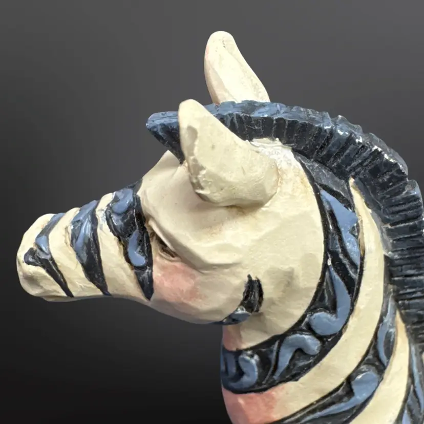 Jim Shore Heartwood Creek Zebra figurine; off white with blue stripes and pink accents. In overall good pre-owned condition with some light paint wear and a larger spot of chipped off paint on the left ear. Measures approximately 4” L x 4” H