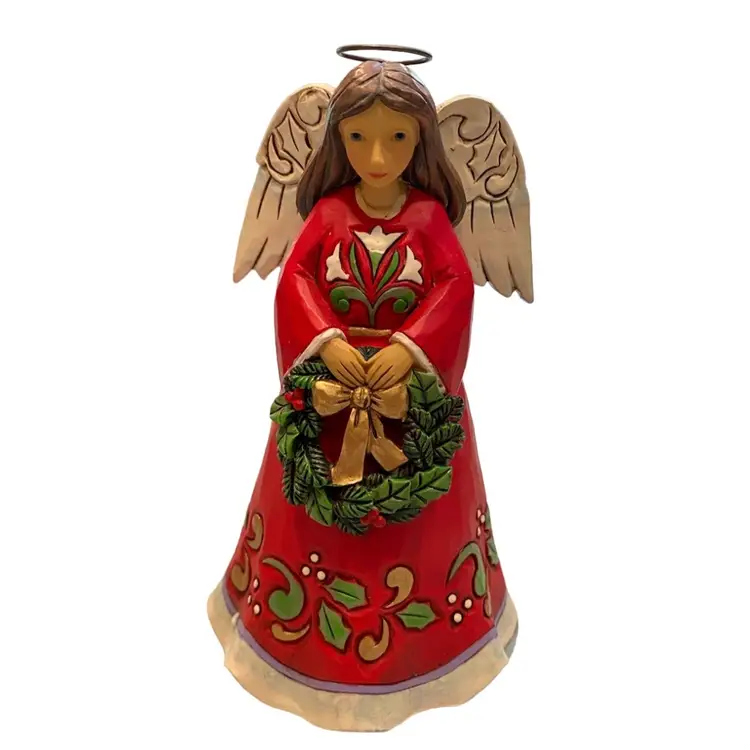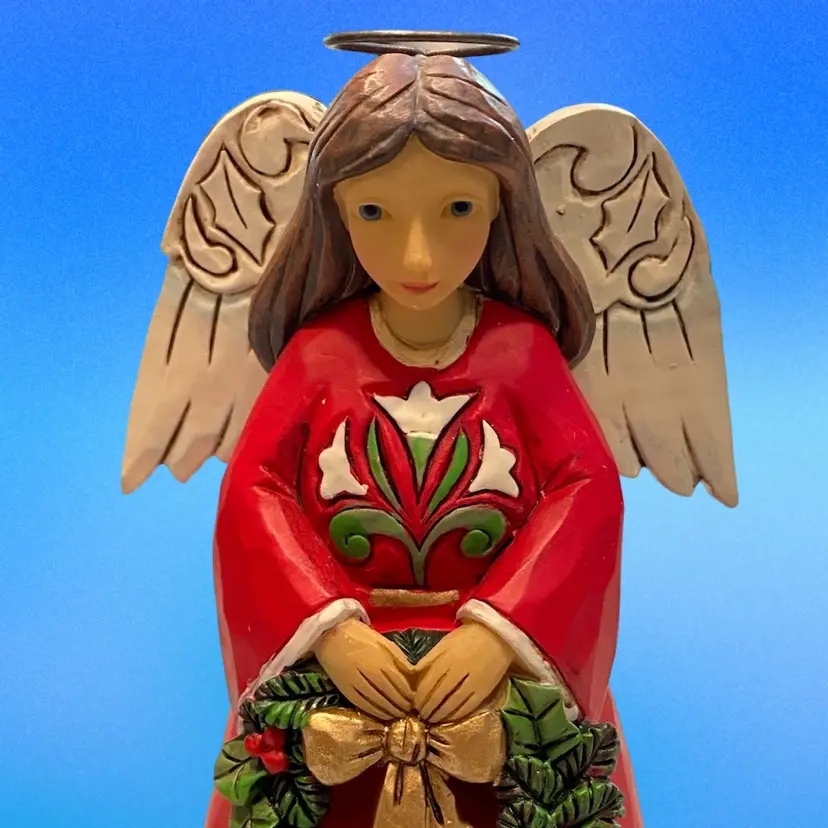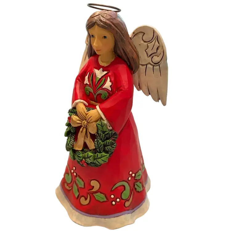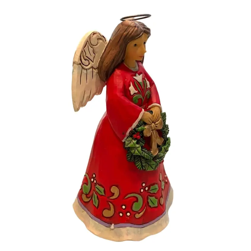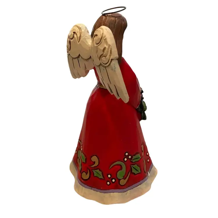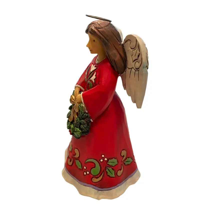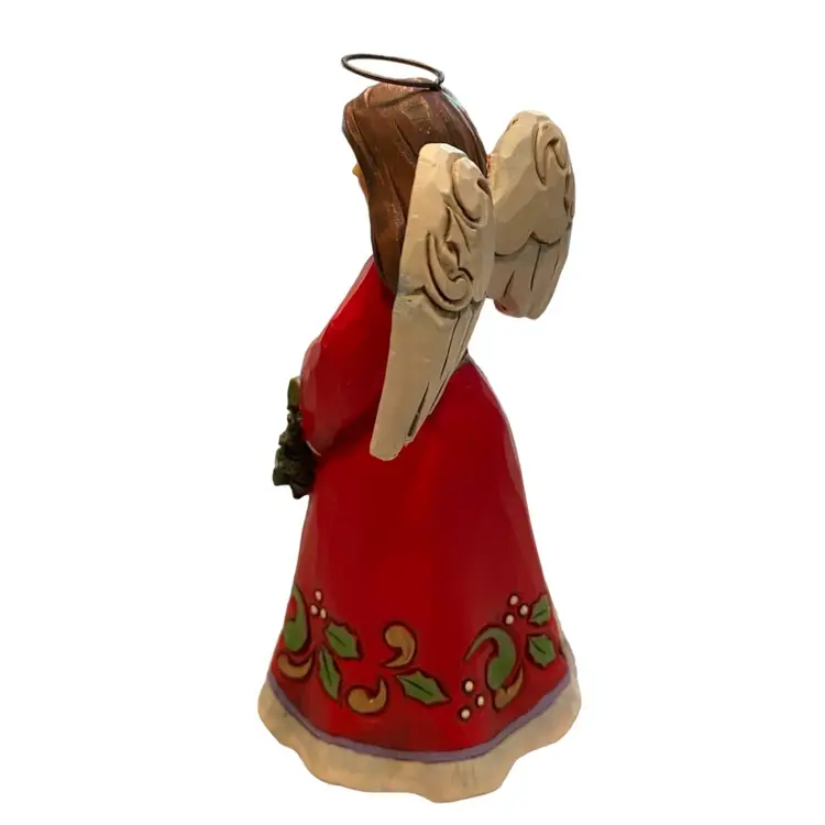 Angel has a red gown with holly leaves and berries around the bottom, white flowers across the chest and white trim. The angel is holding a Christmas wreath. She has a halo and decorations on her wings. Dates from 2016. Measures approximately 5 1/4 in tall. In excellent pre-owned condition.