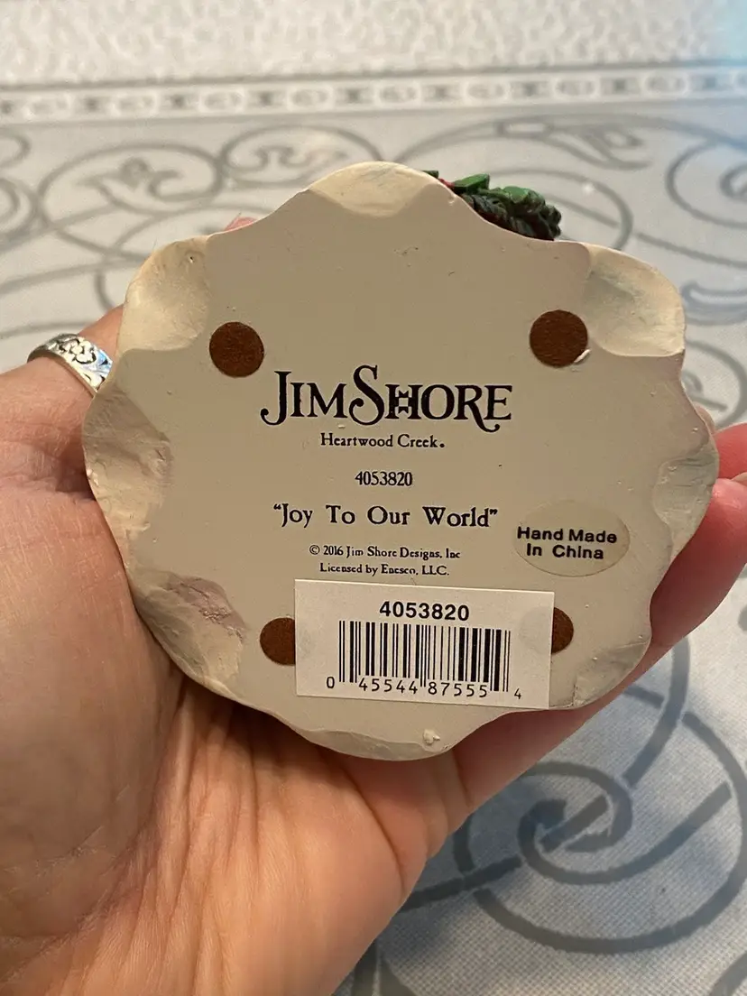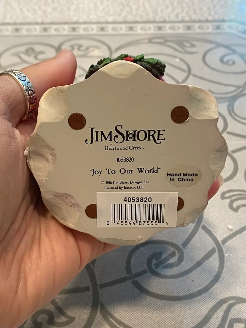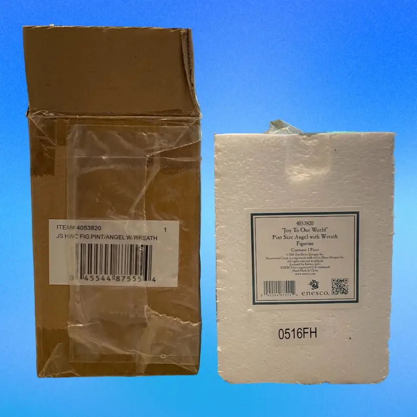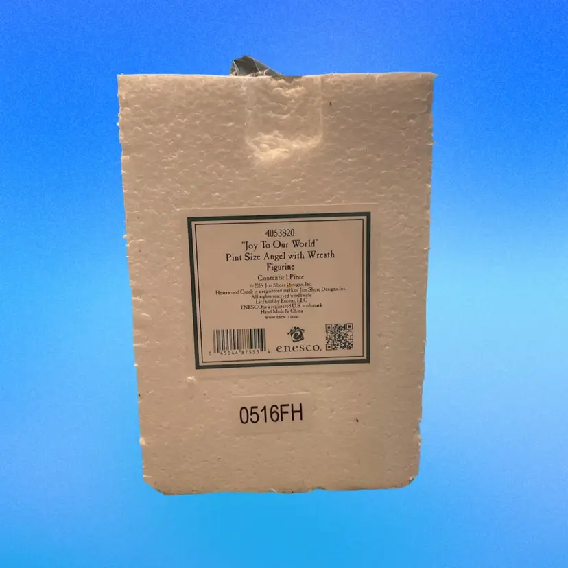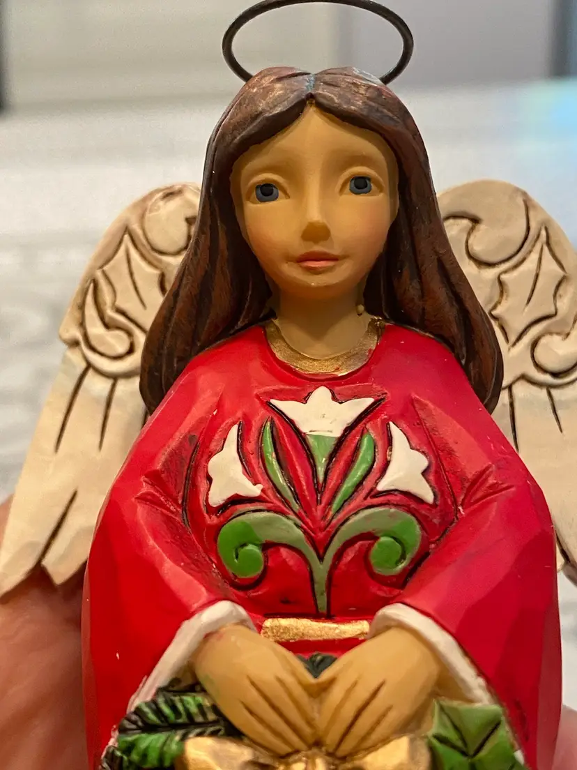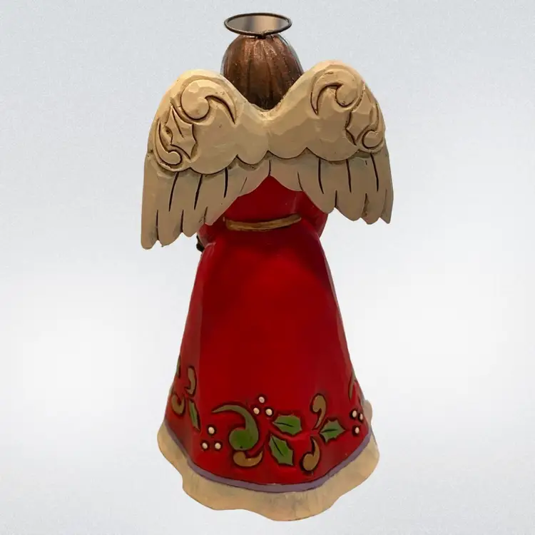 Angel has a red gown with holly leaves and berries around the bottom, white flowers across the chest and white trim. The angel is holding a Christmas wreath. She has a halo and decorations on her wings. Dates from 2016. Measures approximately 5 1/4 in tall. In excellent pre-owned condition.