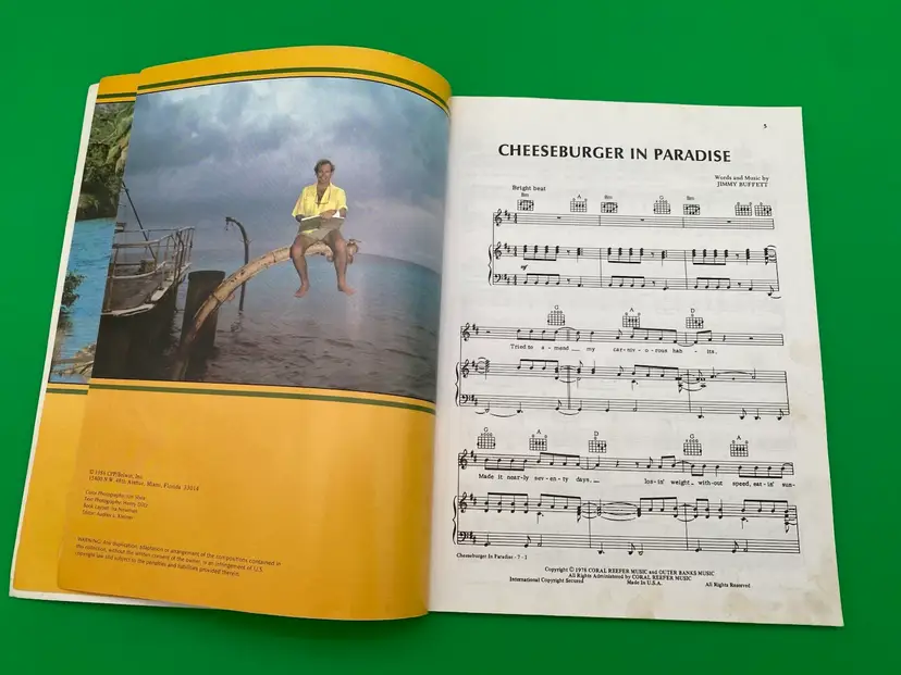 You are purchasing one Jimmy Buffett: Songs You Know By Heart - Jimmy Buffett's Greatest Hit(s) Piano/Vocal/Chords Song Book by Warner Brothers from 1986. This Book is in overall good condition. Minor wear on the Cover. A handful of pages have some discoloration. Otherwise, no rips, writing or folding of the Pages.