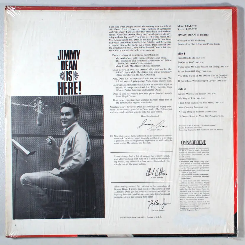 Jimmy Dean Is Here! is one of Dean's first albums with his new label at RCA, with Stand Beside Me being the standout hit. Is Here! reached No. 10 on US Country.
