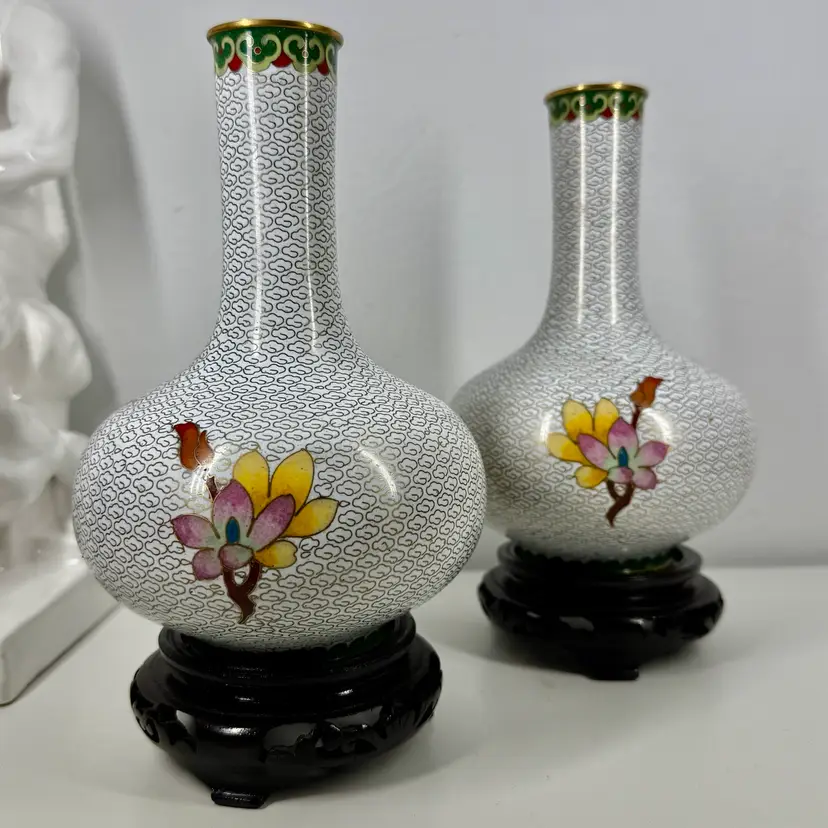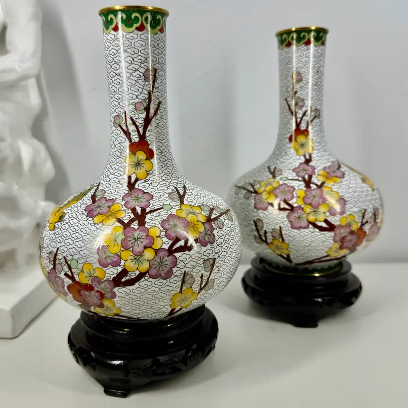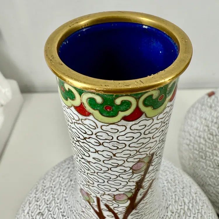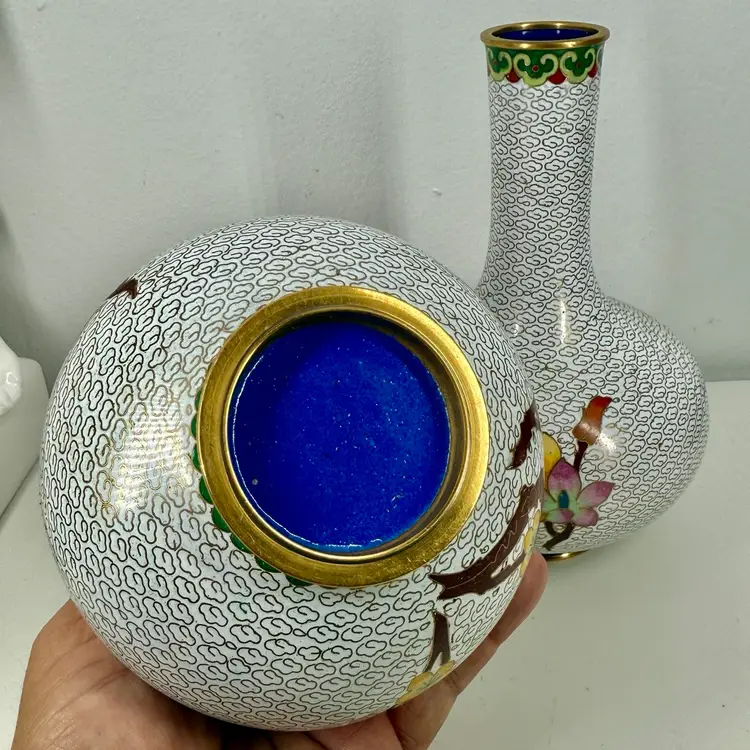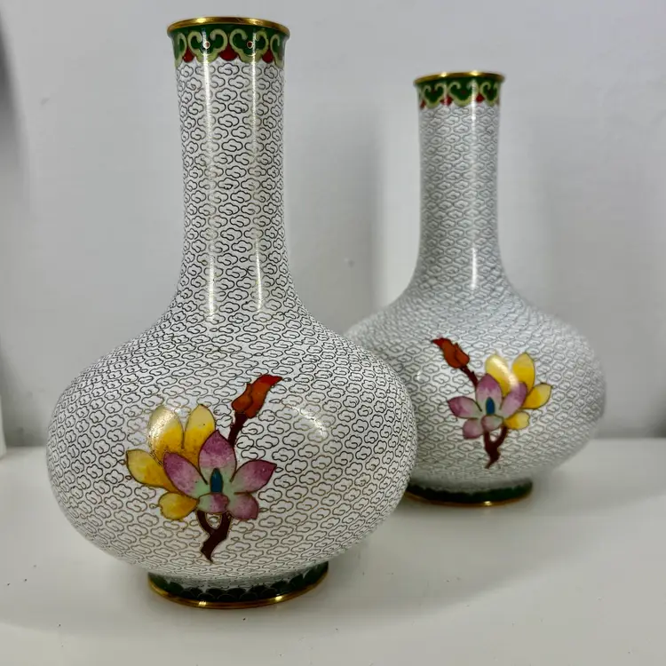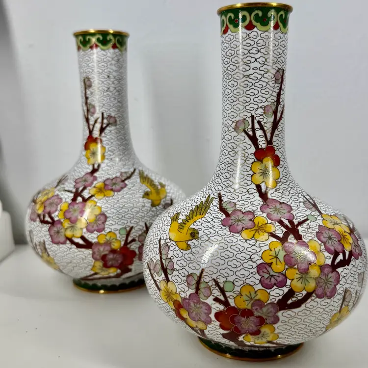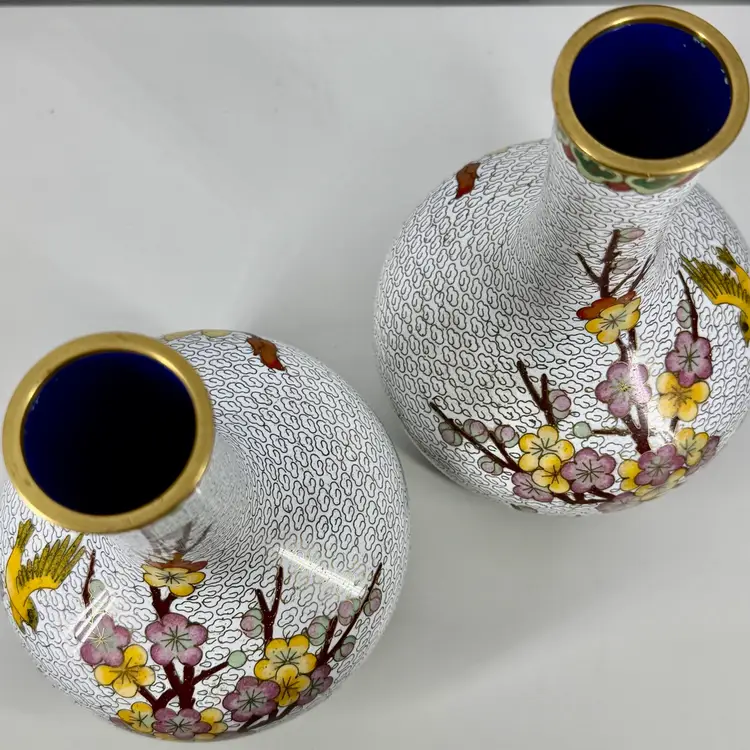 Hi... Elevate your home decor with the JINGFA Chinese Cloisonne Vases Set, featuring a duo of exquisite brass and enamel with florals & birds that exude a springtime ambiance. Each vase stands 7 inches tall without the base and 8.5 inches with it, they both measure 5 inches in width, presenting a harmonious blend of traditional craftsmanship and classic elegance. The white, yellow, pink, green, and blue interior hues offer a captivating contrast, showcasing the vibrant artistry of Chinese culture. Crafted with meticulous attention to detail, these handcrafted vases add an aura of intrigue to their already timeless appeal. Whether displayed alone as a statement piece or as a coordinating set, these vases bring a touch of sophistication and beauty to any space.