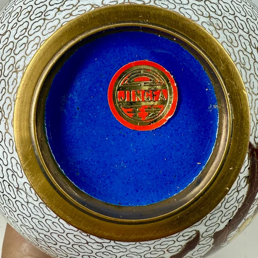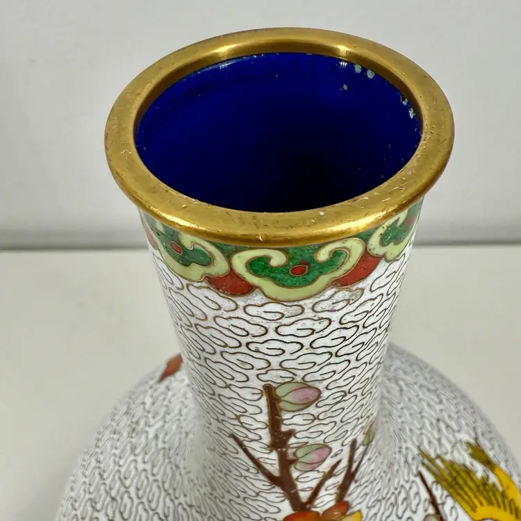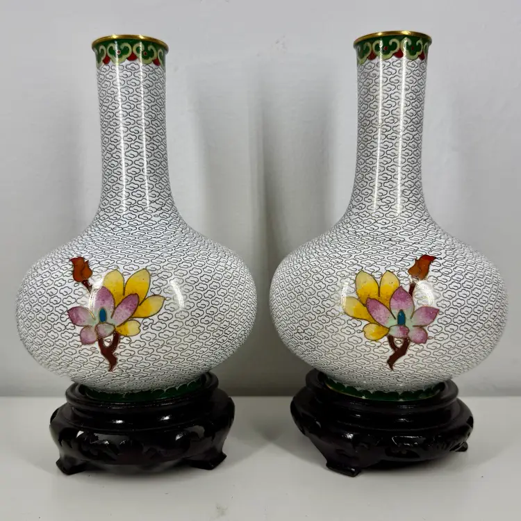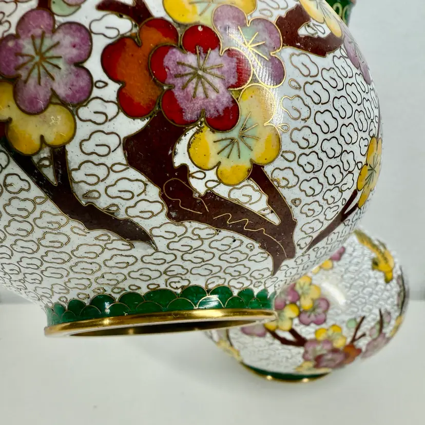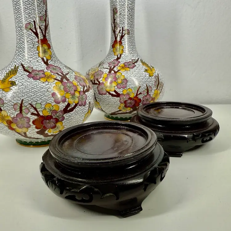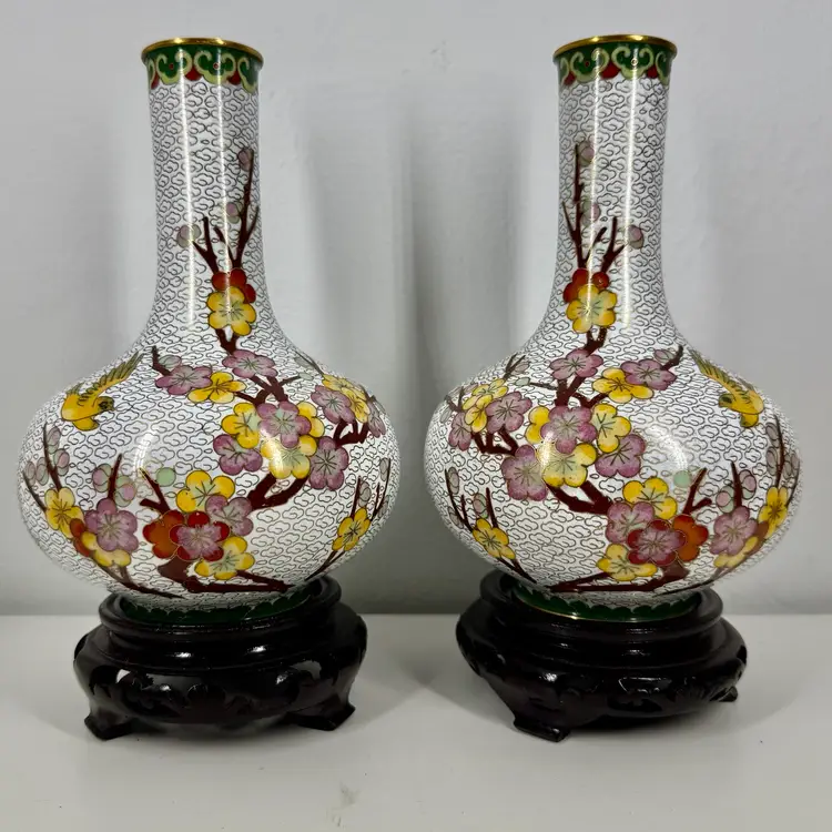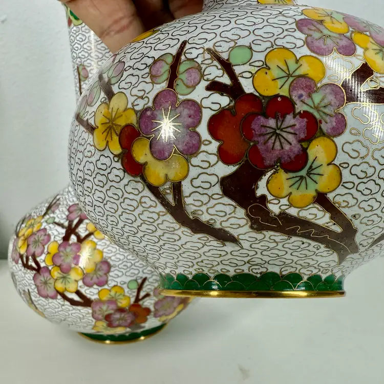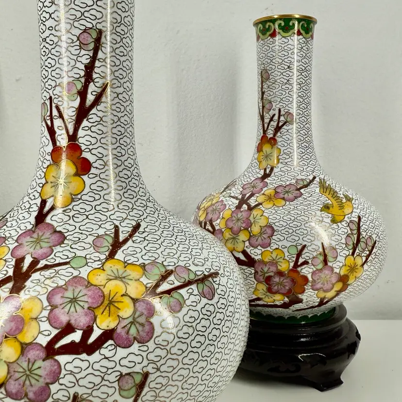 Hi... Elevate your home decor with the JINGFA Chinese Cloisonne Vases Set, featuring a duo of exquisite brass and enamel with florals & birds that exude a springtime ambiance. Each vase stands 7 inches tall without the base and 8.5 inches with it, they both measure 5 inches in width, presenting a harmonious blend of traditional craftsmanship and classic elegance. The white, yellow, pink, green, and blue interior hues offer a captivating contrast, showcasing the vibrant artistry of Chinese culture. Crafted with meticulous attention to detail, these handcrafted vases add an aura of intrigue to their already timeless appeal. Whether displayed alone as a statement piece or as a coordinating set, these vases bring a touch of sophistication and beauty to any space.