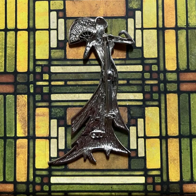 Lovely JJ Jonette Art Deco Lady with Fan brooch. Silver color, measures 2.75” tall in good vintage condition.
