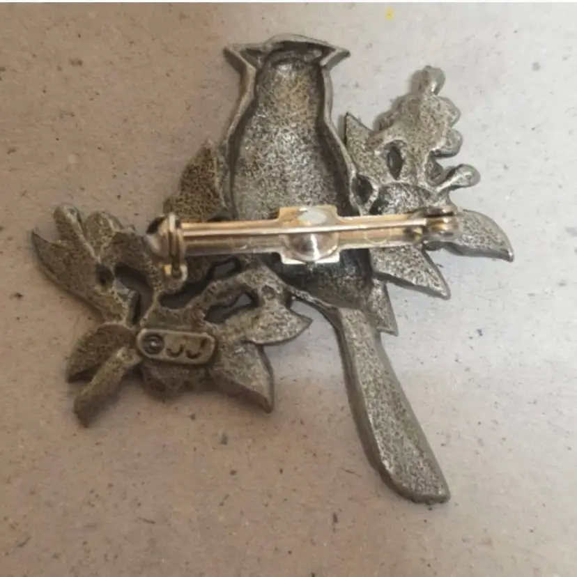 The JJ Jonette Jewelry Co. Silver Tone Cardinal Brooch Pin is a vintage piece from the 1990s, signed by the brand. Made of pewter, this bird-shaped brooch features an engraved design with a silver tone finish. Perfect for occasions like engagements, anniversaries, birthdays, or Christmas, this brooch is a unique and nature-inspired piece that would make a great addition to any jewelry collection. Its original design and American craftsmanship make it a special and timeless accessory.
