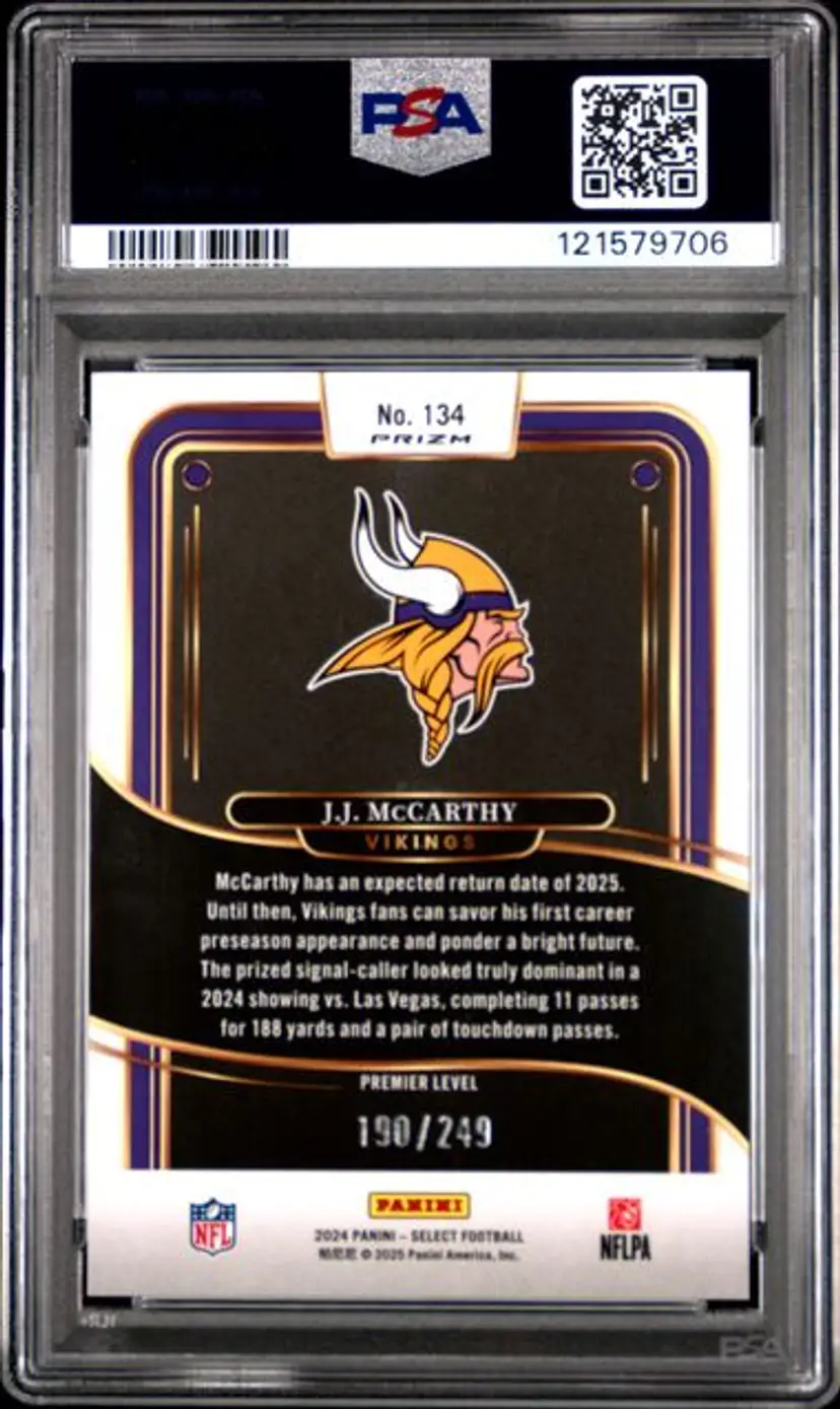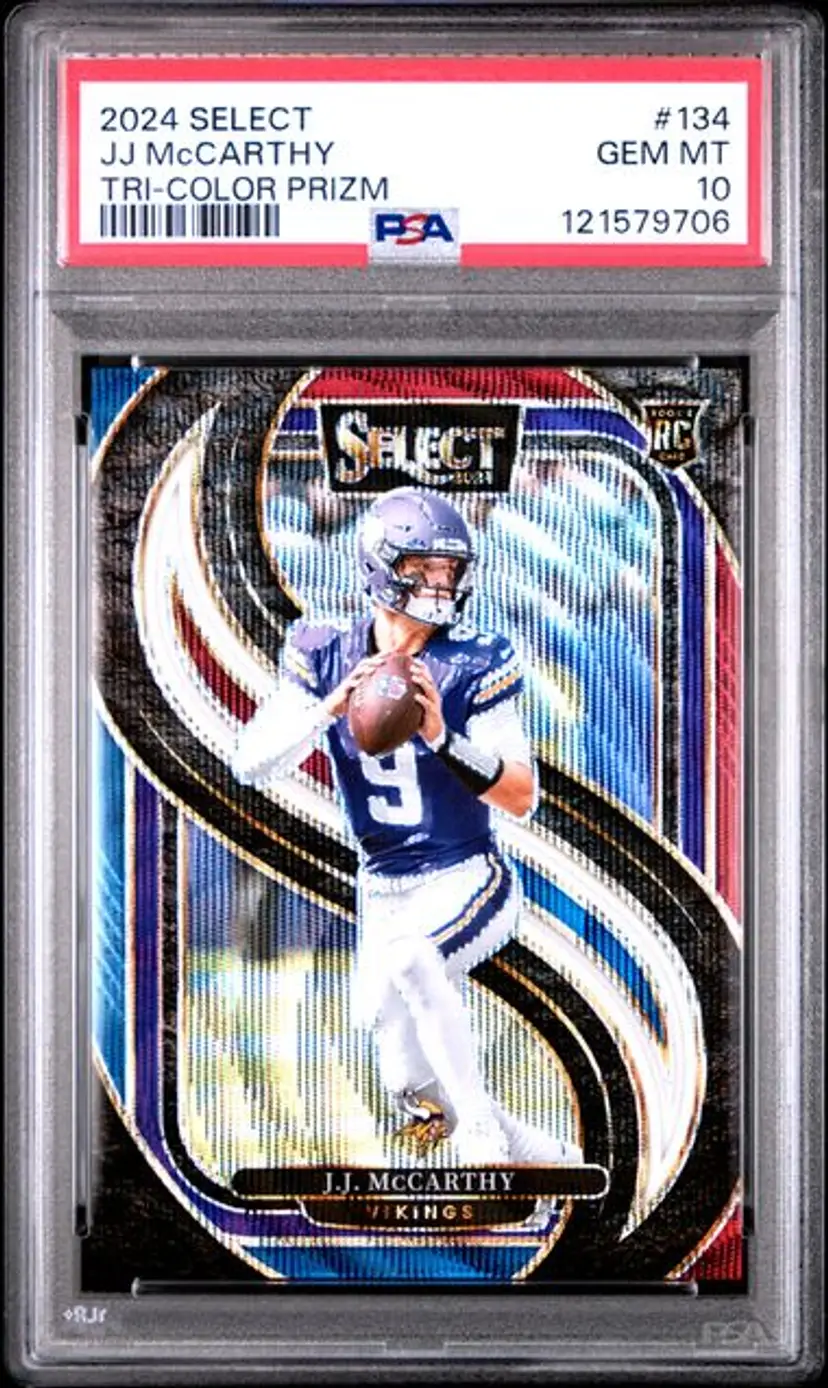 Gem Mint 10 graded JJ McCarthy rookie card from the 2024 Select series. A must-have for Vikings fans and collectors!