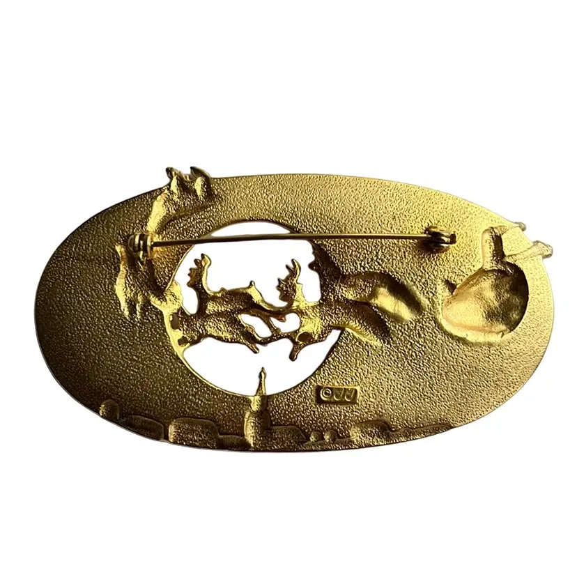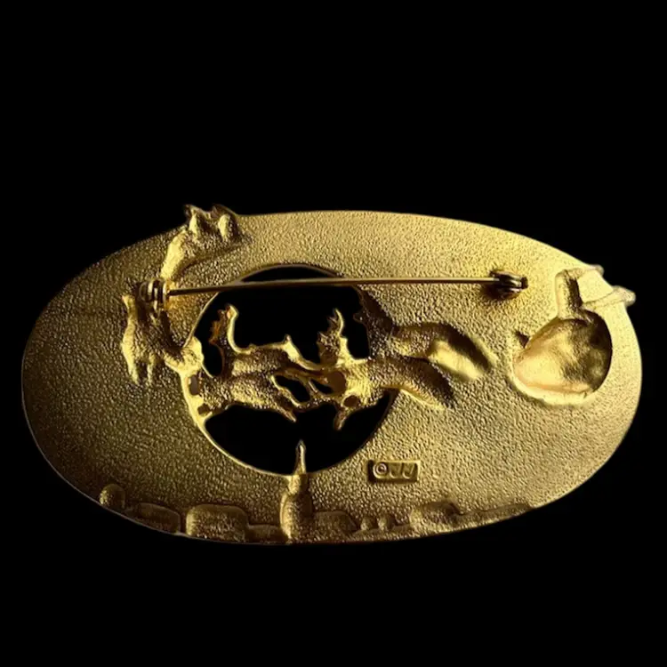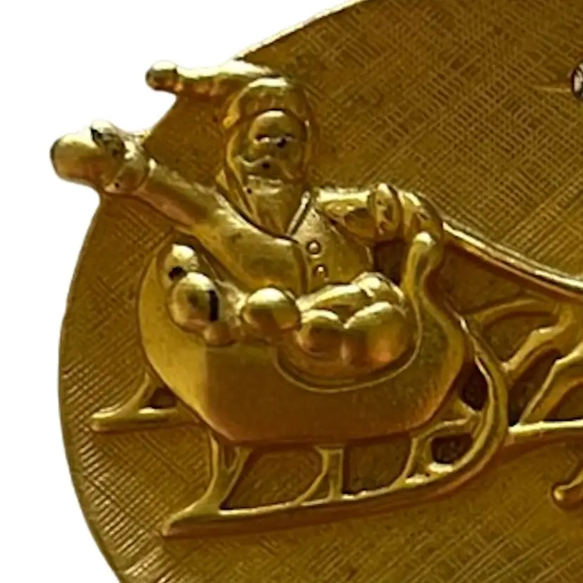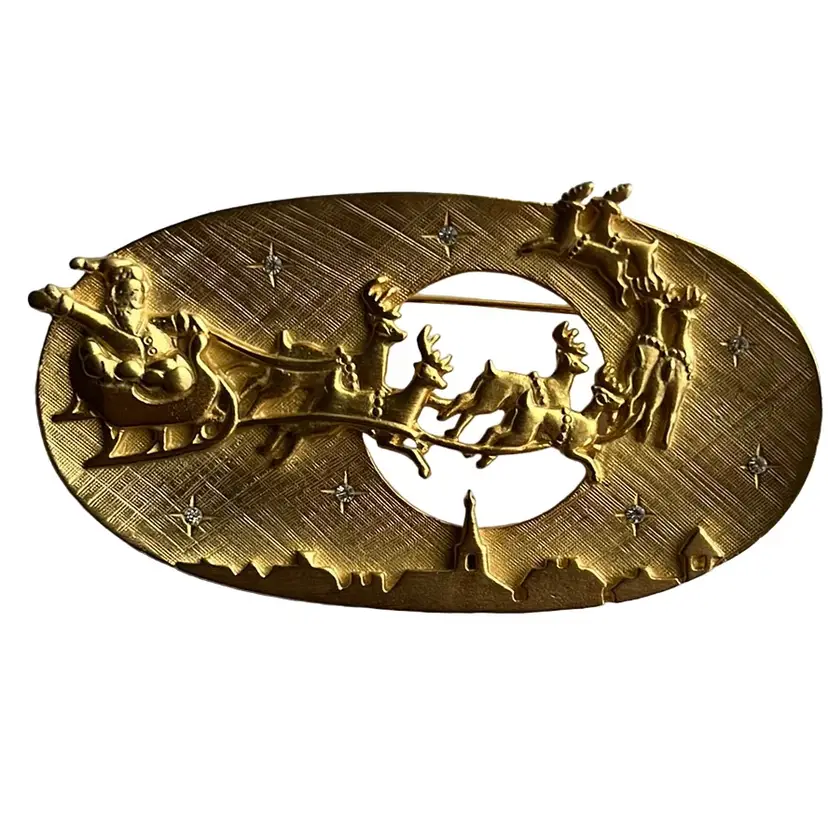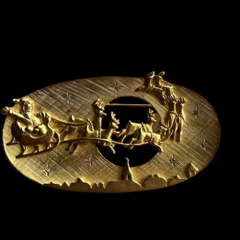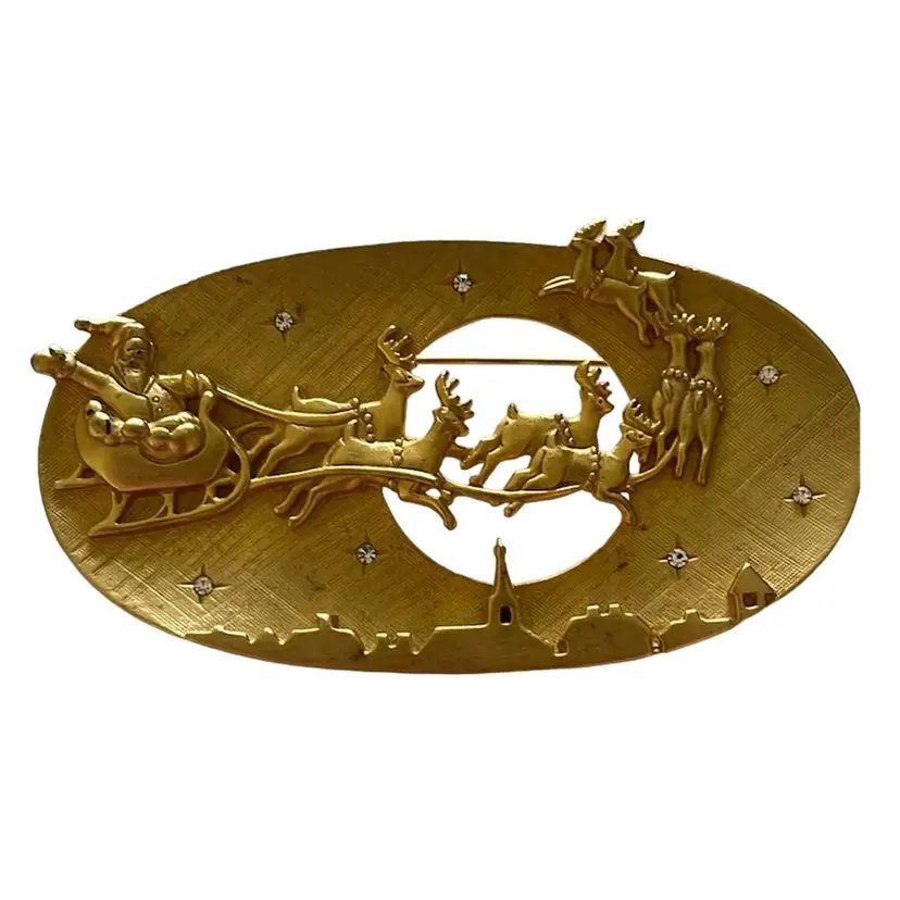 Fun JJ holiday brooch featuring Santa and his reindeers flying through the sky. It’s large, almost 3.5” wide and 1.75” high. In good condition, showing some minor vintage wear. A couple dots of gold paint and it will be good as new. All rhinestone stars intact. See photos.