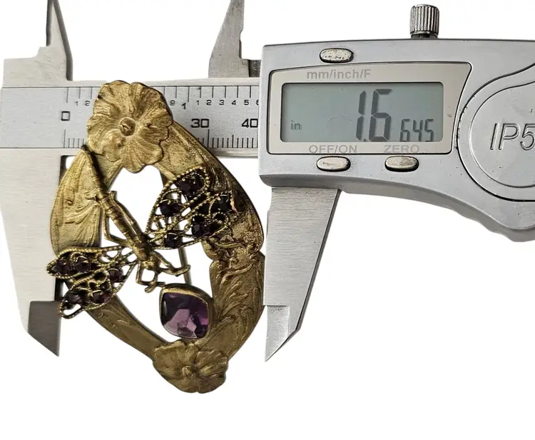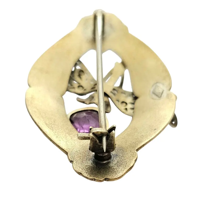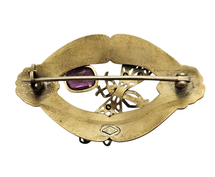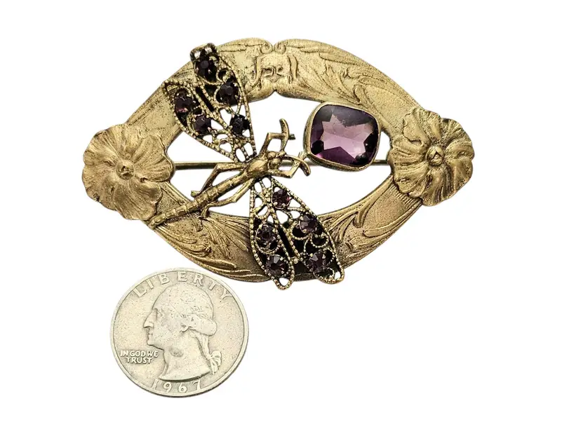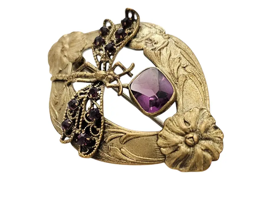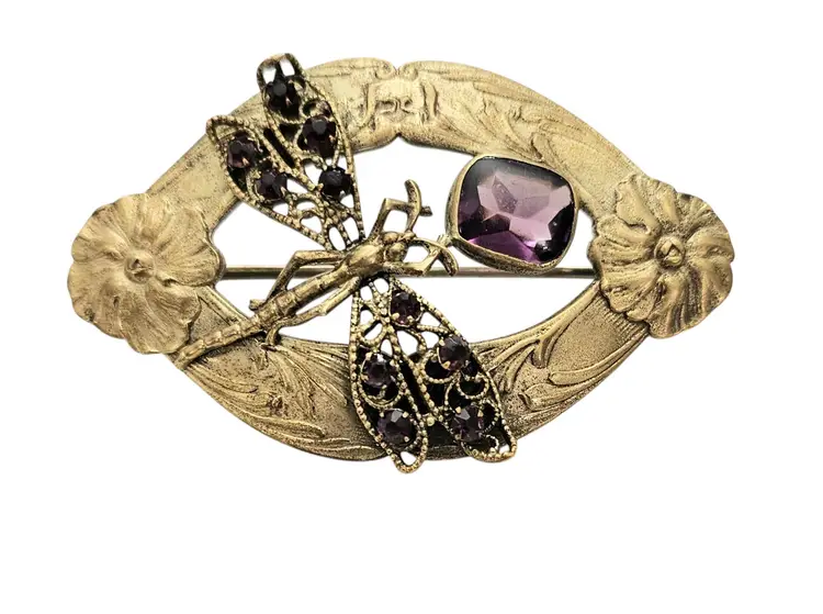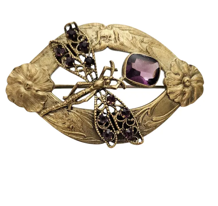 J.J. Sommer Art Nouveau Purple Rhinestone Brooch Dragonfly Floral Oval Pin, Signed L979