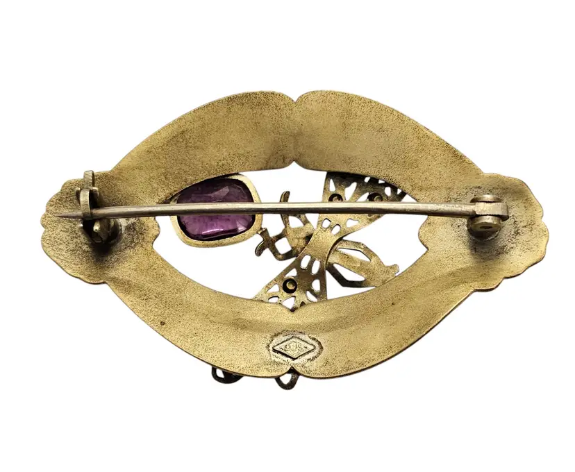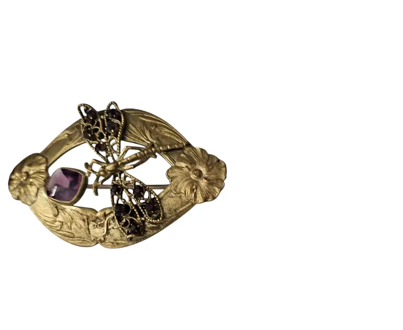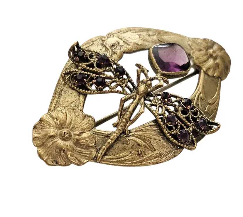 Add a touch of vintage charm to your outfit with this J. J. Sommer Art Nouveau Brooch. This piece is very nicely illustrated and boasts a vintage Art Nouveau design in gold tone metal. The oval-shaped openwork frame exhibits engraved artistry of floral design, accented with a dragonfly figure delightfully embellished with a significantly sized bezel-set purple rhinestone and numerous individually prong-set small purple rhinstones securely held in place along the ornate dragonfly's wings, allowing maximum light to pass through and enhance its brilliance. This pretty pin measures approximately 1.6 inches in length. It has a straight locking pin and safety clasp on the reverse and is hallmarked JJS inside an elongated diamond-shaped frame cartouche.