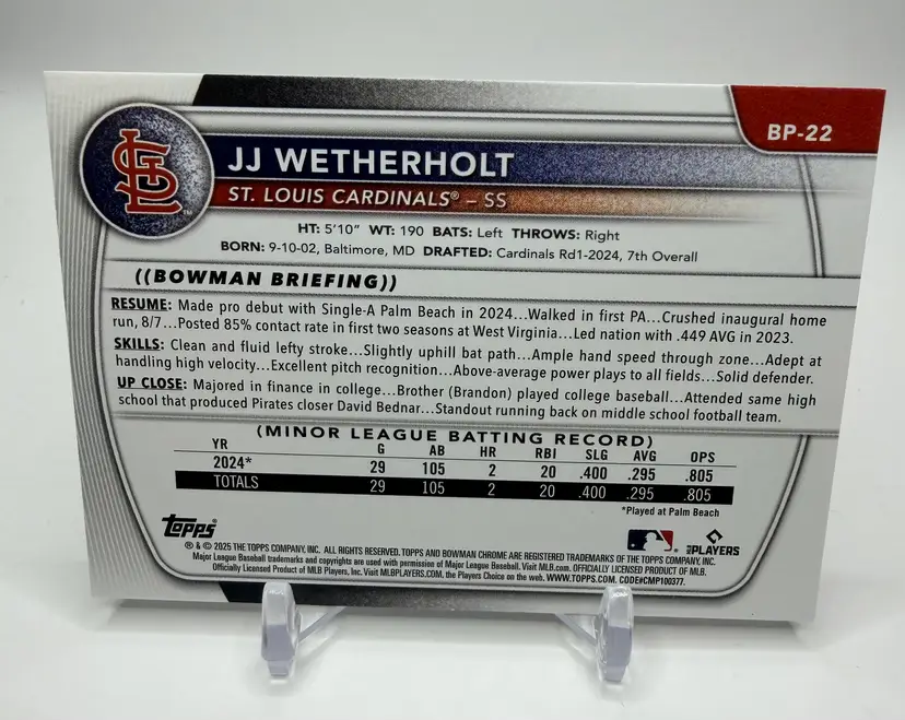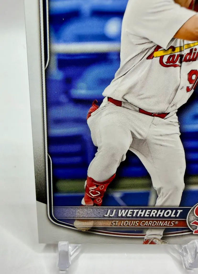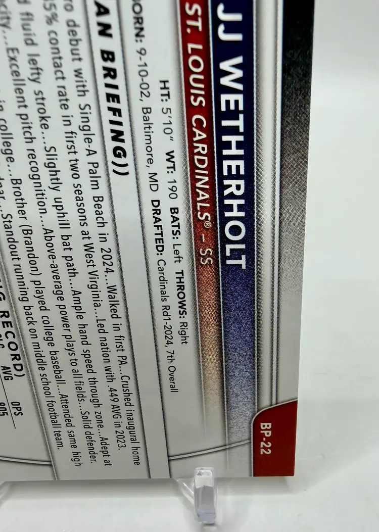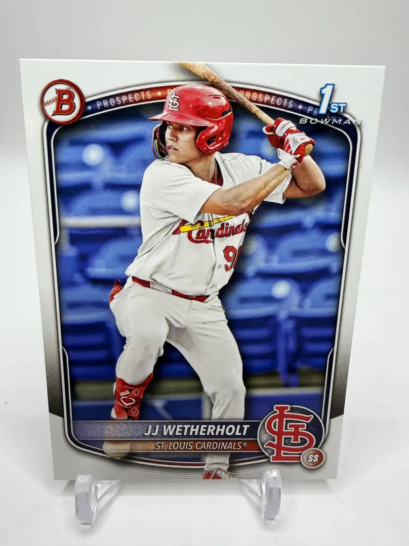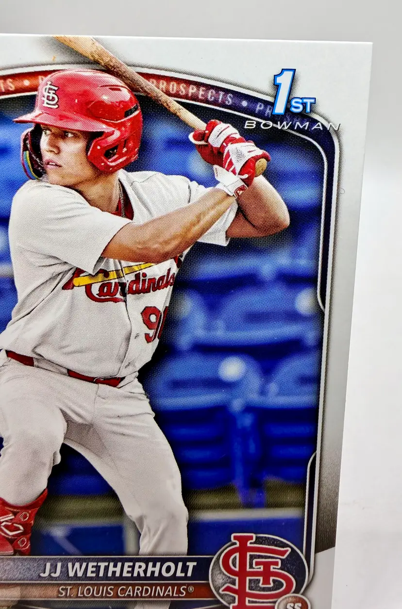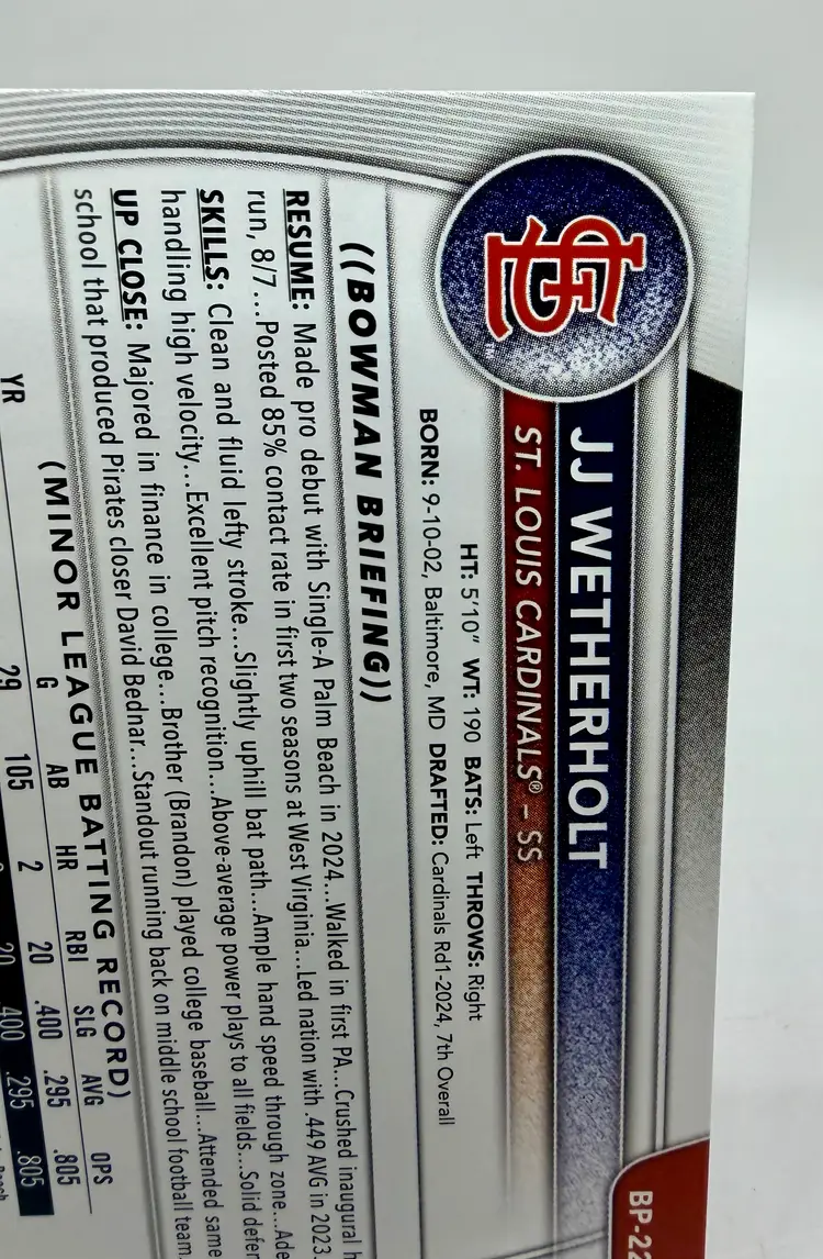 2025 Bowman Card #BP-22 1st Prospect Rookie, St. Louis Cardinals Ungraded - Near mint or better Card Size-Standard Autographed-No Set 2025 Bowman Year Manufactured 2025 Player/Athlete- JJ Wetherholt Vintage -No Manufacturer- Topps Team-St. Louis Cardinals Features Base Set, Prospect, Paper Card Number-BP - 22 2025 Bowman trading card featuring JJ Wetherholt, a first prospect rookie player for the St. Louis Cardinals in Major League Baseball. The card is made of standard baseball card stock and is an original, non-autographed release by Topps.