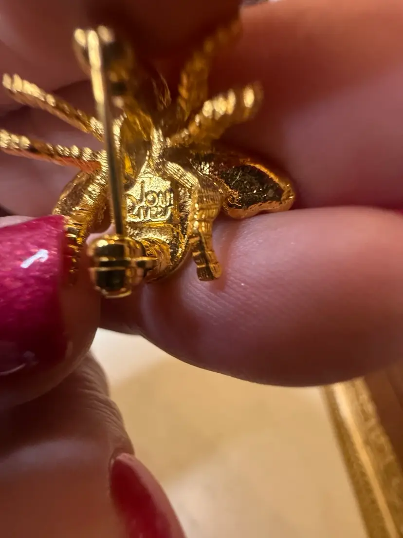 Joan Rivers Bee Brooches. Signed Joan Rivers Duo Bee Brooches With Green Crystal Eyes. Spark Up Your Lapel, Purse, Wedding Bouquet, Backpack or Scarf With These Lovely Gold Tone Bee Brooches. Large Bee Is 1" Long and The Smaller Bee Is 3/4" long
