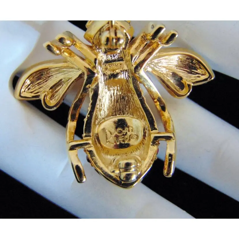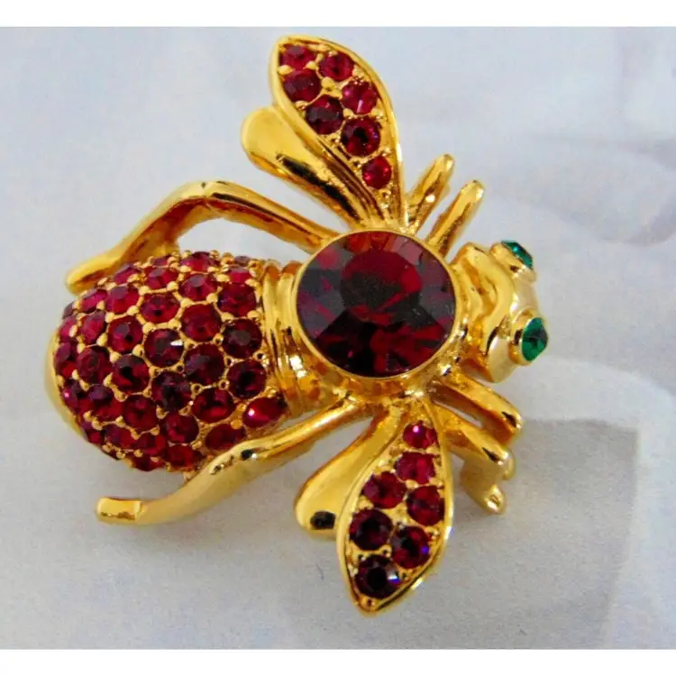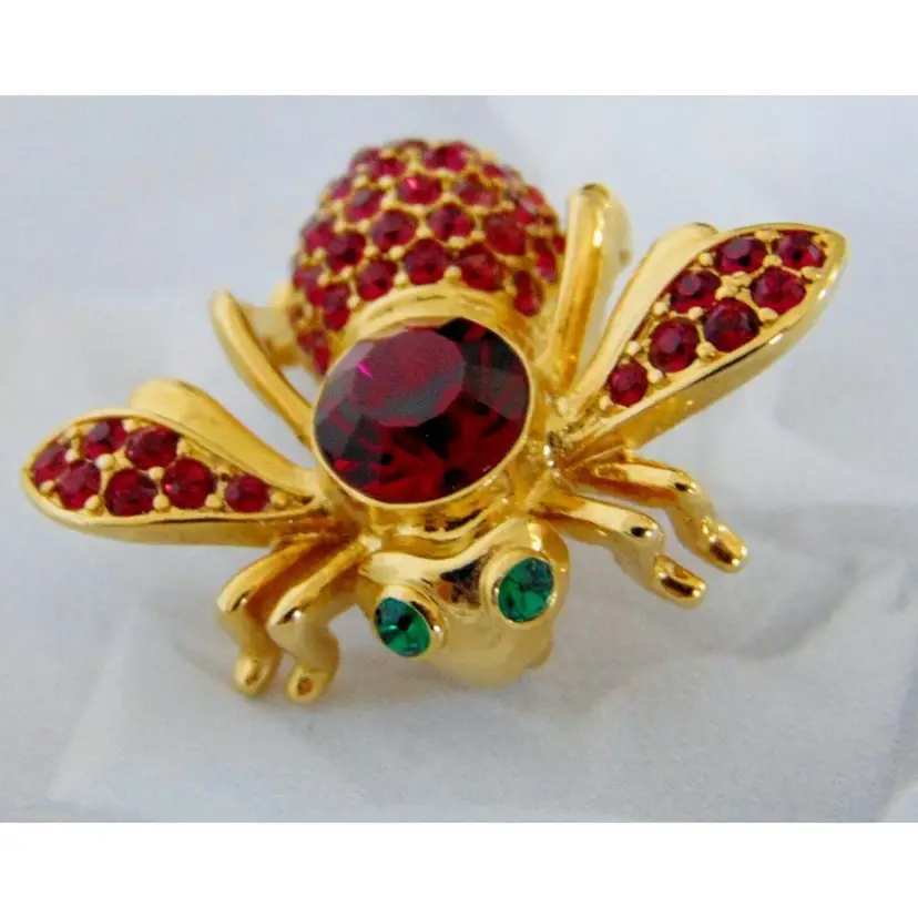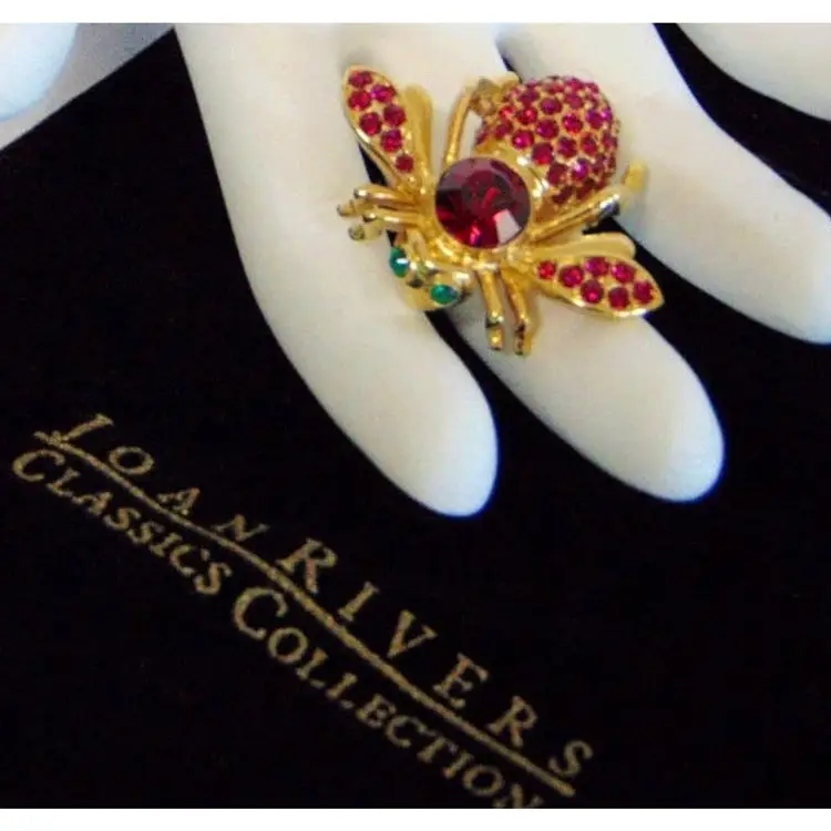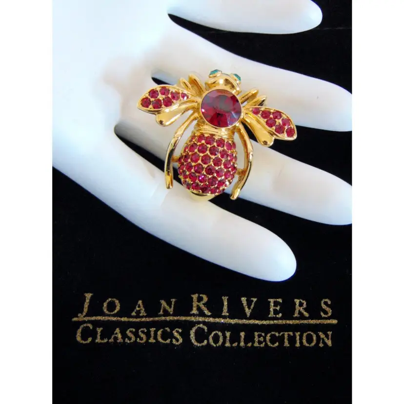 Brand: Joan Rivers Color: Red Type: Brooch Vintage: Yes Signed: Yes Features: New Condition, Retired, Signed Occasion: Birthday Main Stone Color: Red Metal: Yellow Gold Plated Item Length: 1-1/8 in. Setting Style: Pavé Theme: Animals & Insects Number of Gemstones: Several Material: Enameled Gold, Gold Plate, Cyrstal Main Stone: Crystal Shape: Bee
