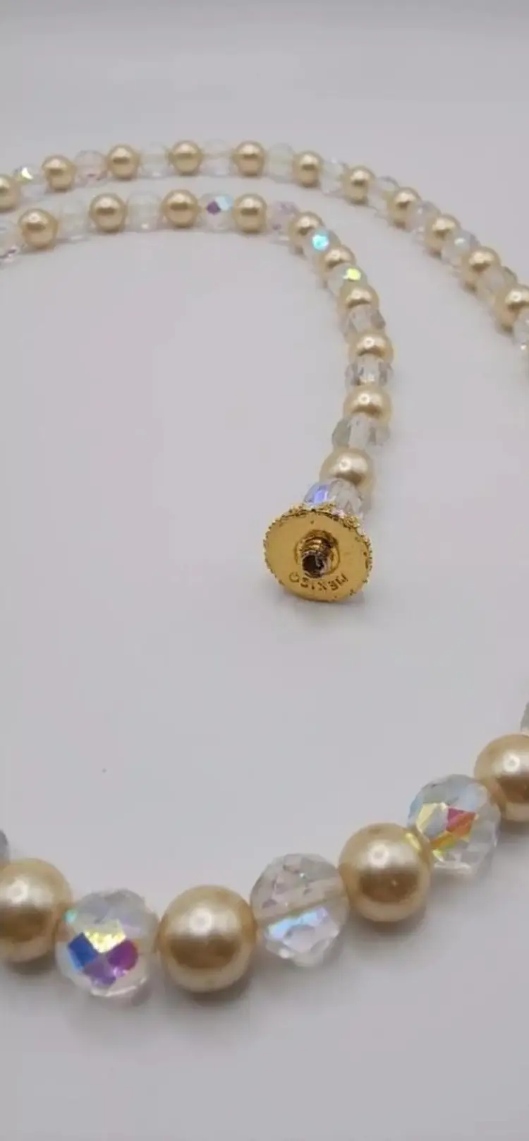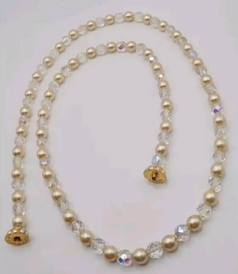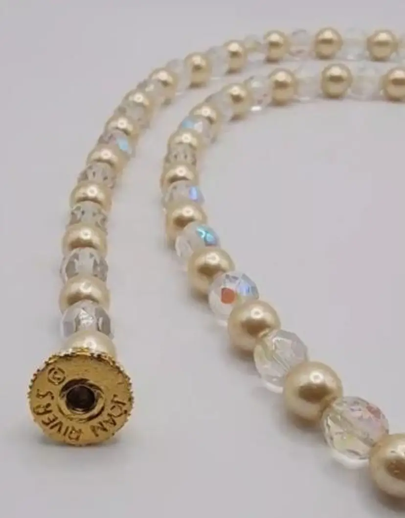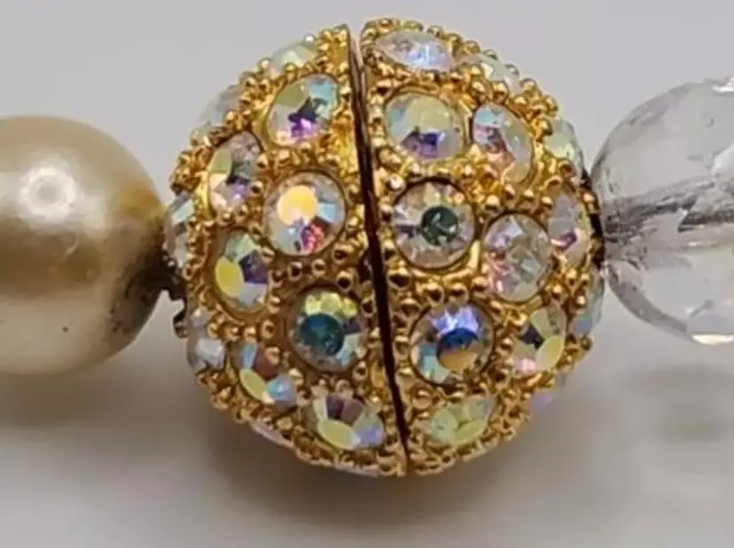 Gorgeous Joan Rivers Faux Pearl and Clear Faceted Beads with a Rhinestone Pave Screw Clasp. This is a stunning piece. There is some wear on the faux pearls, but its still in wonderful wearable condition.