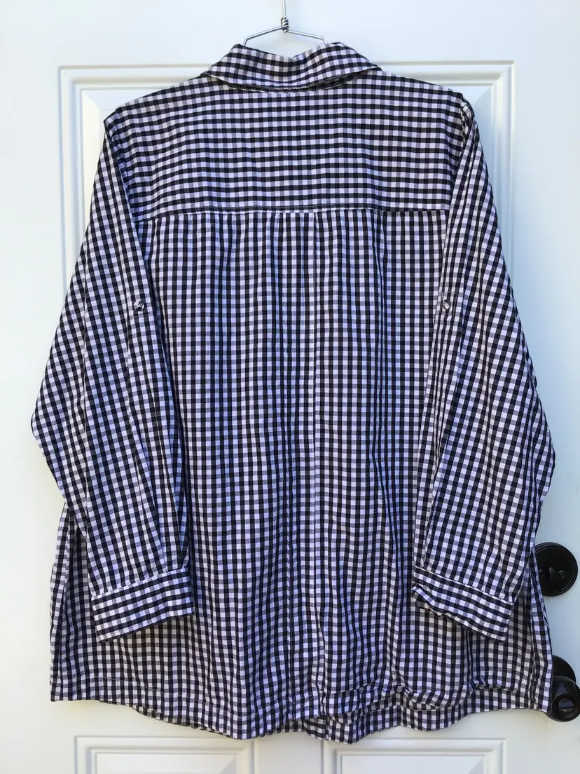 Joan Rivers Gingham Button-Down Boyfriend Shirt, Black And White, Women’s Blouse. Size 1X. Condition Preowned. Good. Measurements are Sleeves 22”, Pit to Pit 25”, and Length 30”. Boyfriend Style. Front Pockets. Great to wear for upcoming Spring and Summer Weather!