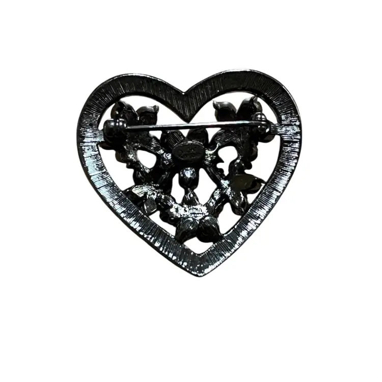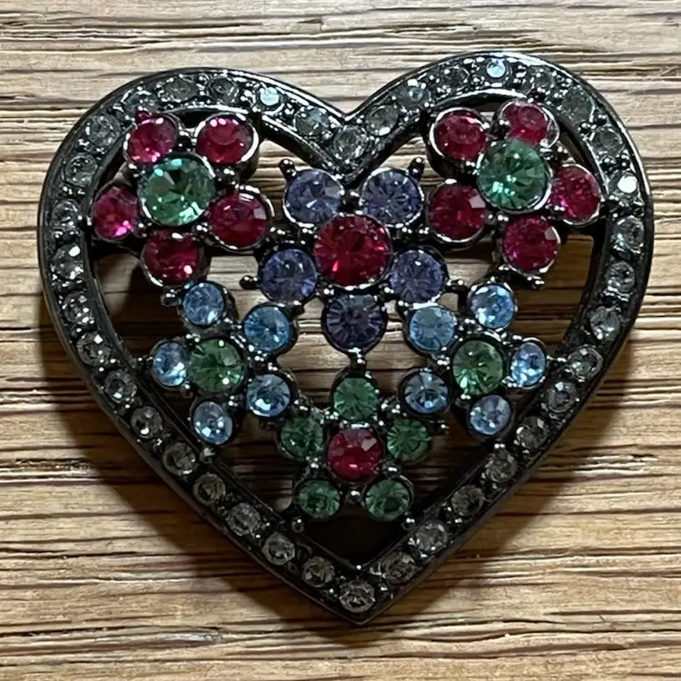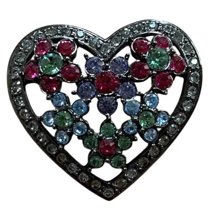 Beautiful vintage Joan Rivers heart shaped brooch, pewter color with multi color rhinestones. Measures 1.5” in excellent condition.