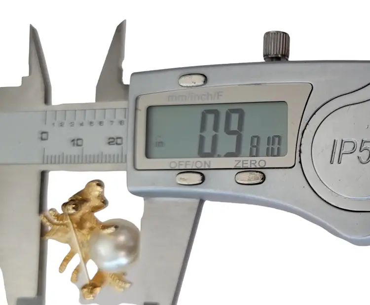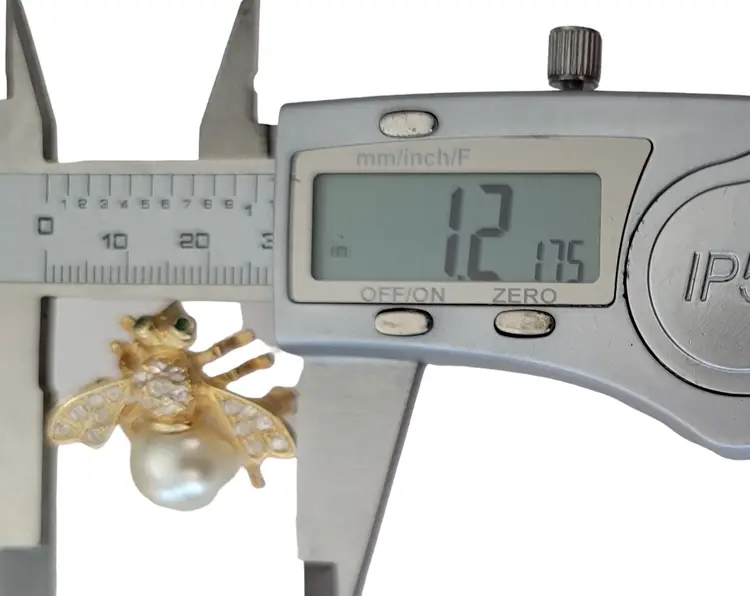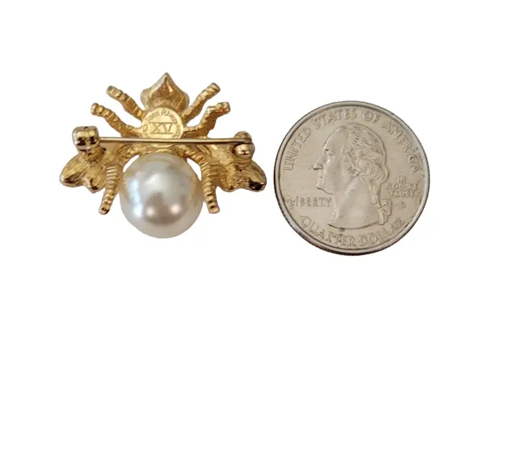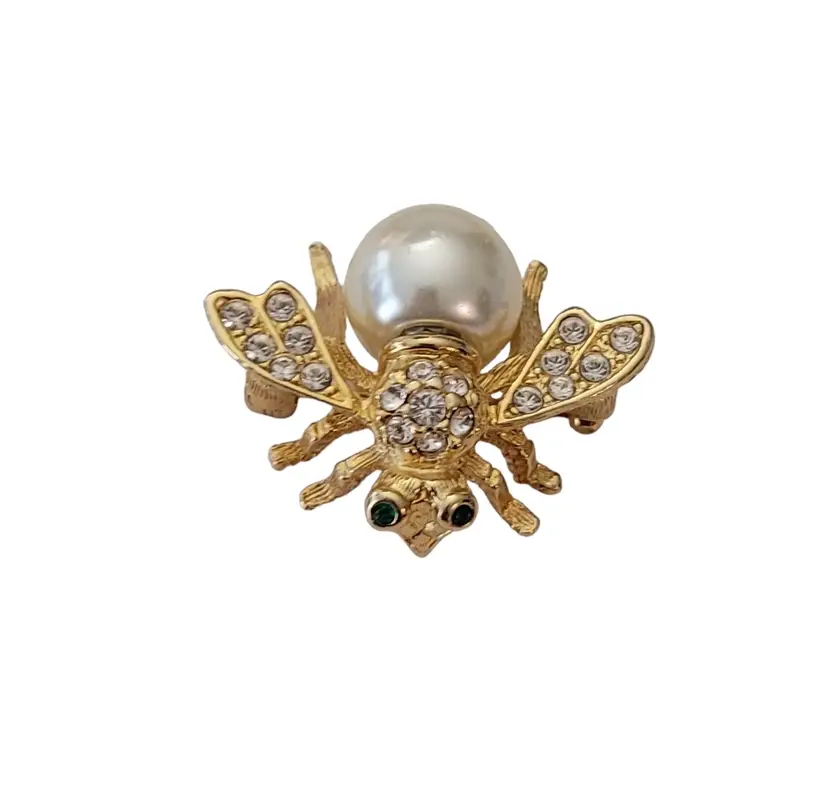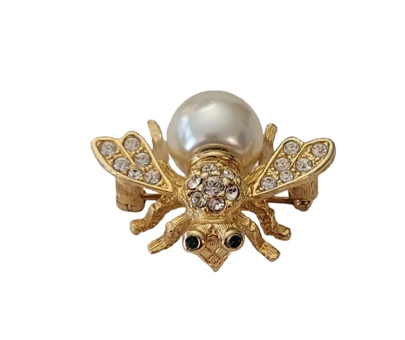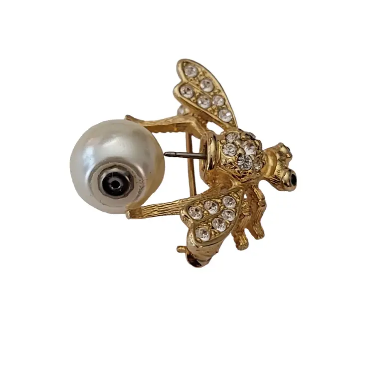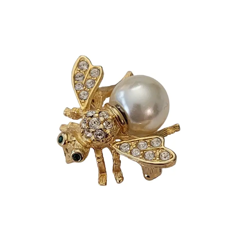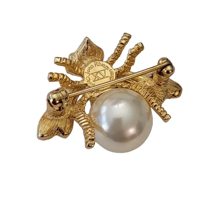 This exquisite bumble bee pin is from the Joan Rivers XV Classic Collection for QVC during the 1990's. It is exquisitely crafted from a gold-tone base, embellished with green crystal eyes and clear rhinestones on a pave setting style that adds dimension to the piece. The removable faux pearl of this elegant piece demonstrates a fine example of the excellent craftsmanship of Joan Rivers's creations. It measures approximately 1.2 inches in width and 0.9 inches in length. The back of this pin is stamped at the back with Joan Rivers XV Classic Collection, completed with a standard clasp with a rollover safety mechanism. The bee shape adds a touch of nature-inspired elegance and will make a great accent for the jean jacket or sweater. Please note that this piece has a removable pearl. No other pieces come with this pin.