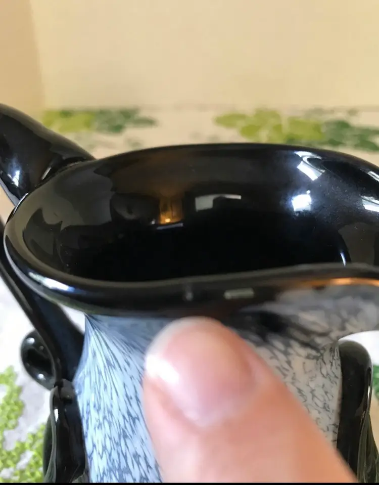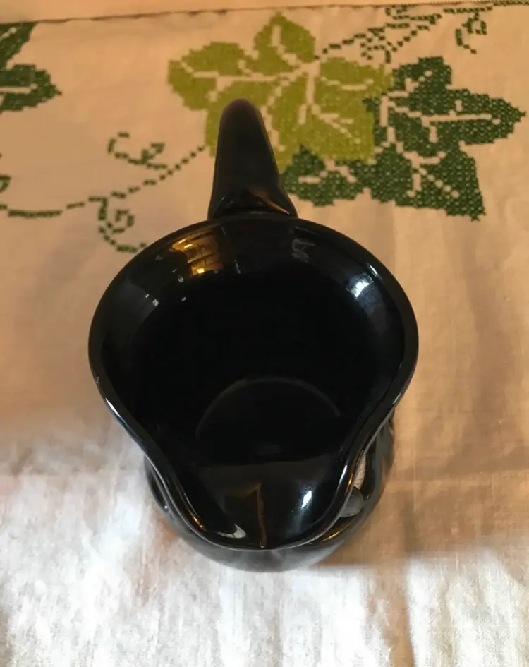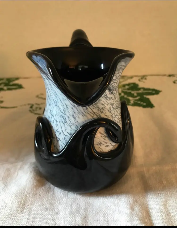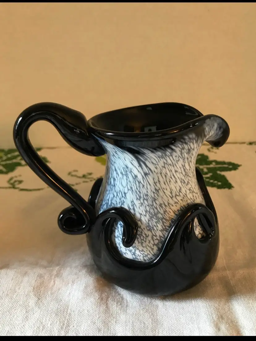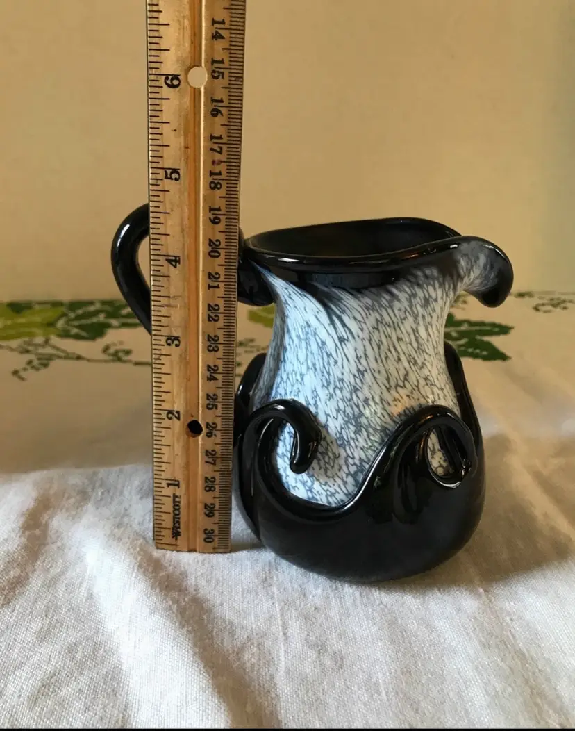Beautiful! Black art glass pitcher signed by Jody Trammell on bottom. Measures approximately 4.5 inches tall. There’s a small imperfection on rim that could be a chip or happened while being made. You can see it right in the middle of my finger tip in the photos. M-060-00 6•6•6 1/7